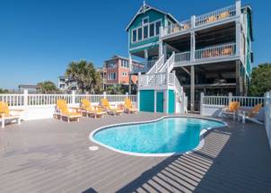 The inverted floor plan of this exquisitely decorated Hobbs Smart Home will amaze you with panoramic views of the ocean and marsh. This beautiful home boasts 6 bedrooms (2K, 3Q, 4T). Oceanfront living area with flat-screen TV, large dining area, and sunroom that places you right over the beach! A beautiful oceanside swimming pool is open from Easter to October. Two covered porches, a sundeck, and a unique Tiki bar offer a gracious exterior living space. Cable TV in all bedrooms and Amish Country outdoor furniture for porches, decks, and pool area.
