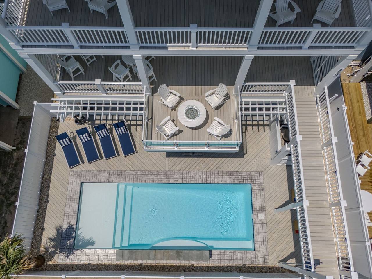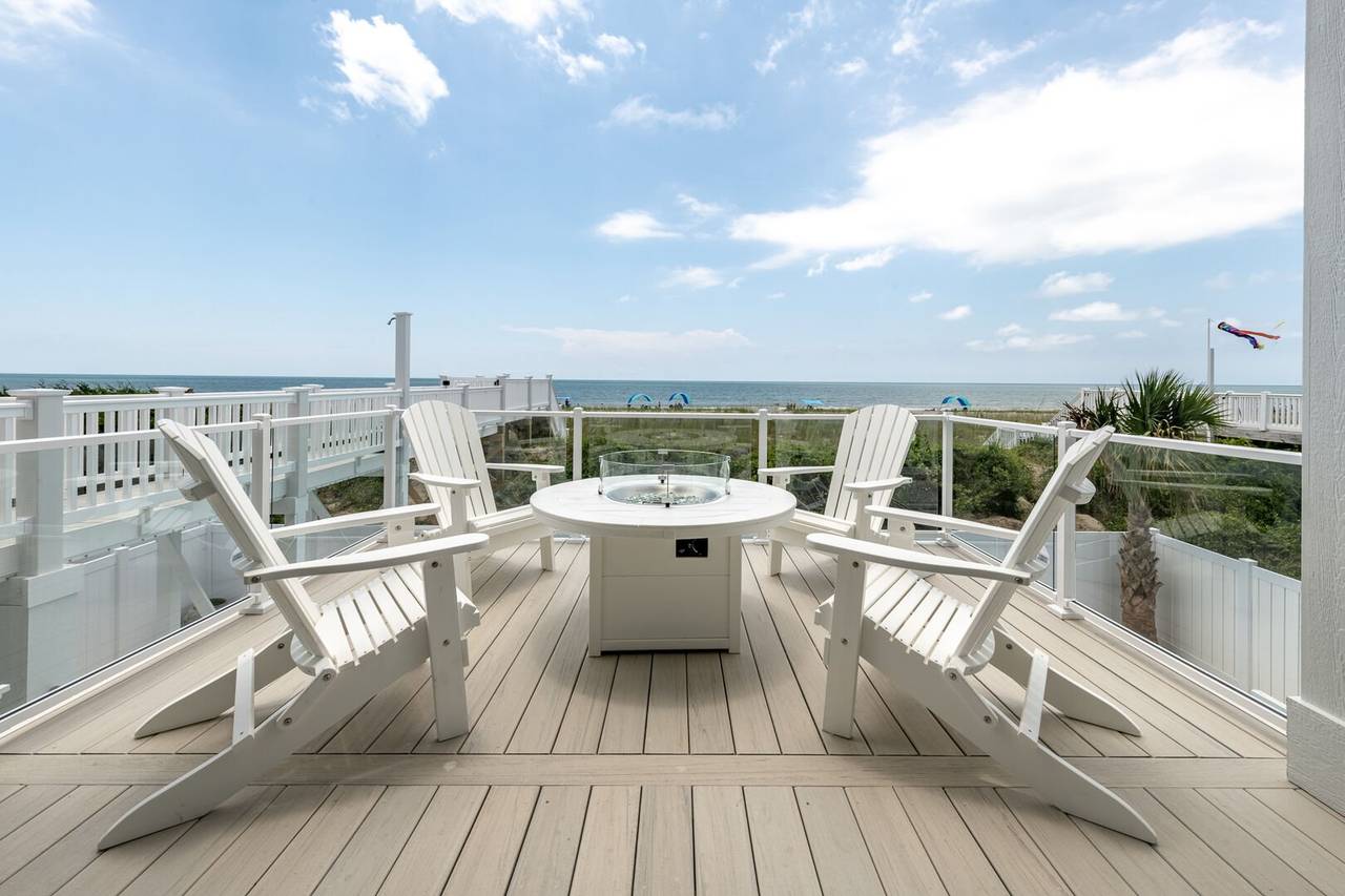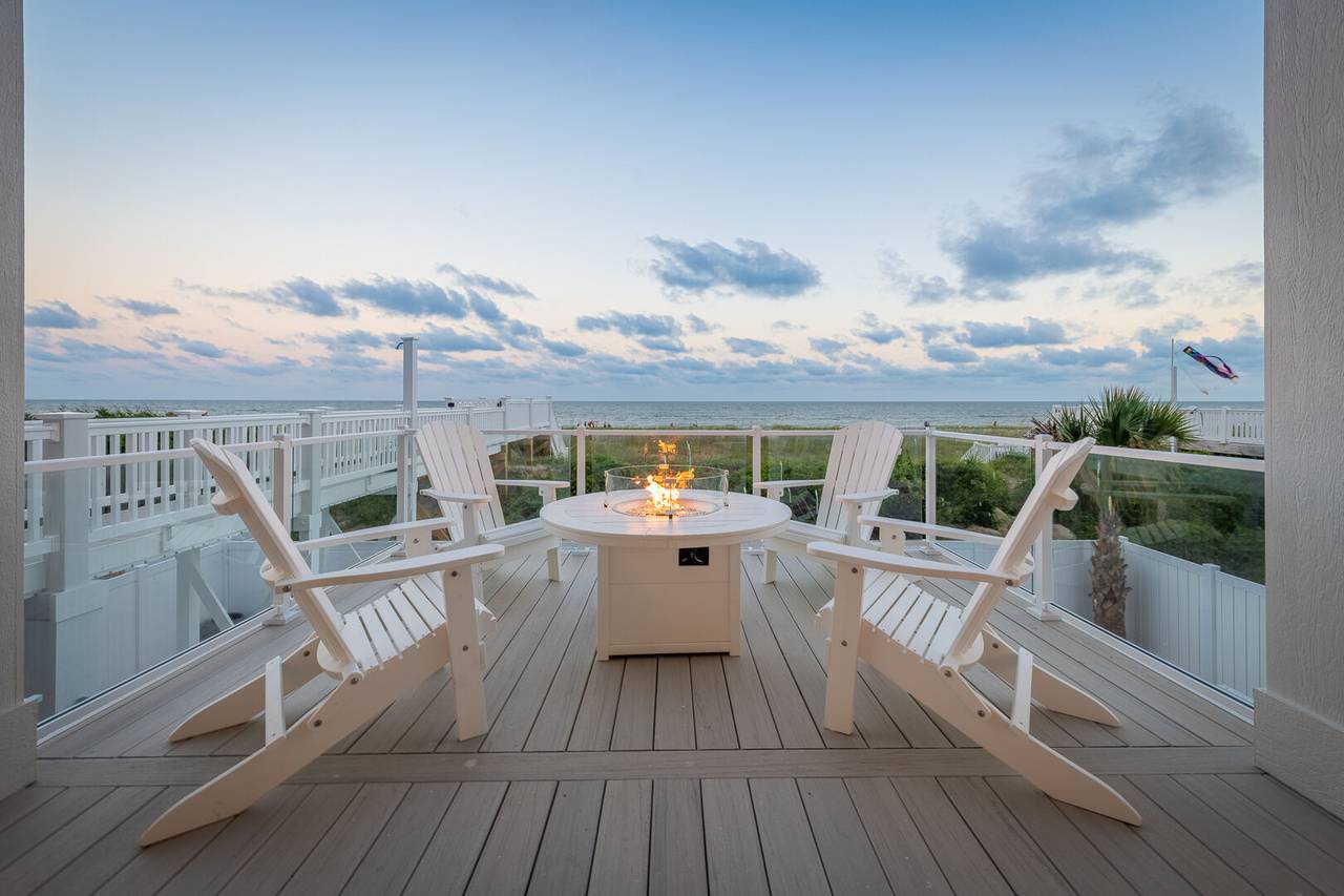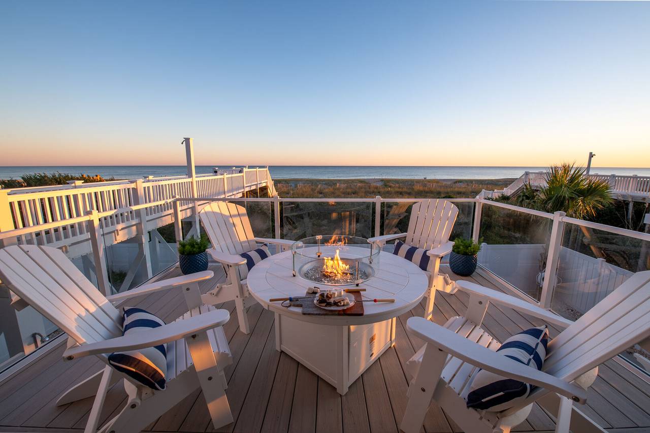 Speaking of breathtaking views, Carolina Joy has over 1,000 square feet of decks with magnificent 180-degree views of Holden Beach and a gorgeous boardwalk to the beach.  On the main floor deck, not only is there ample seating in ultra-comfortable gliders, but you will also find bistro-style seating and tables for quiet breakfasts, lazy lunches, and happy hours that can be served through the pass-through window.  When the sun goes down, the deck extends over the pool and hosts a 48” fire pit perfect for s’mores, roasted marshmallows, and your favorite beverage, complemented by the peaceful sounds of the gentle ocean breezes and waves.