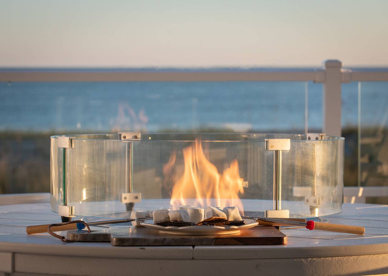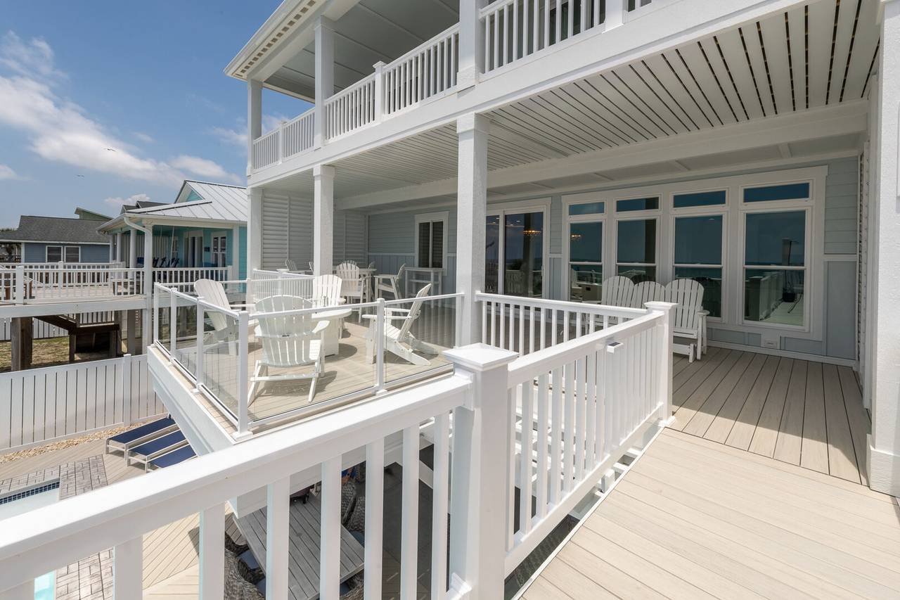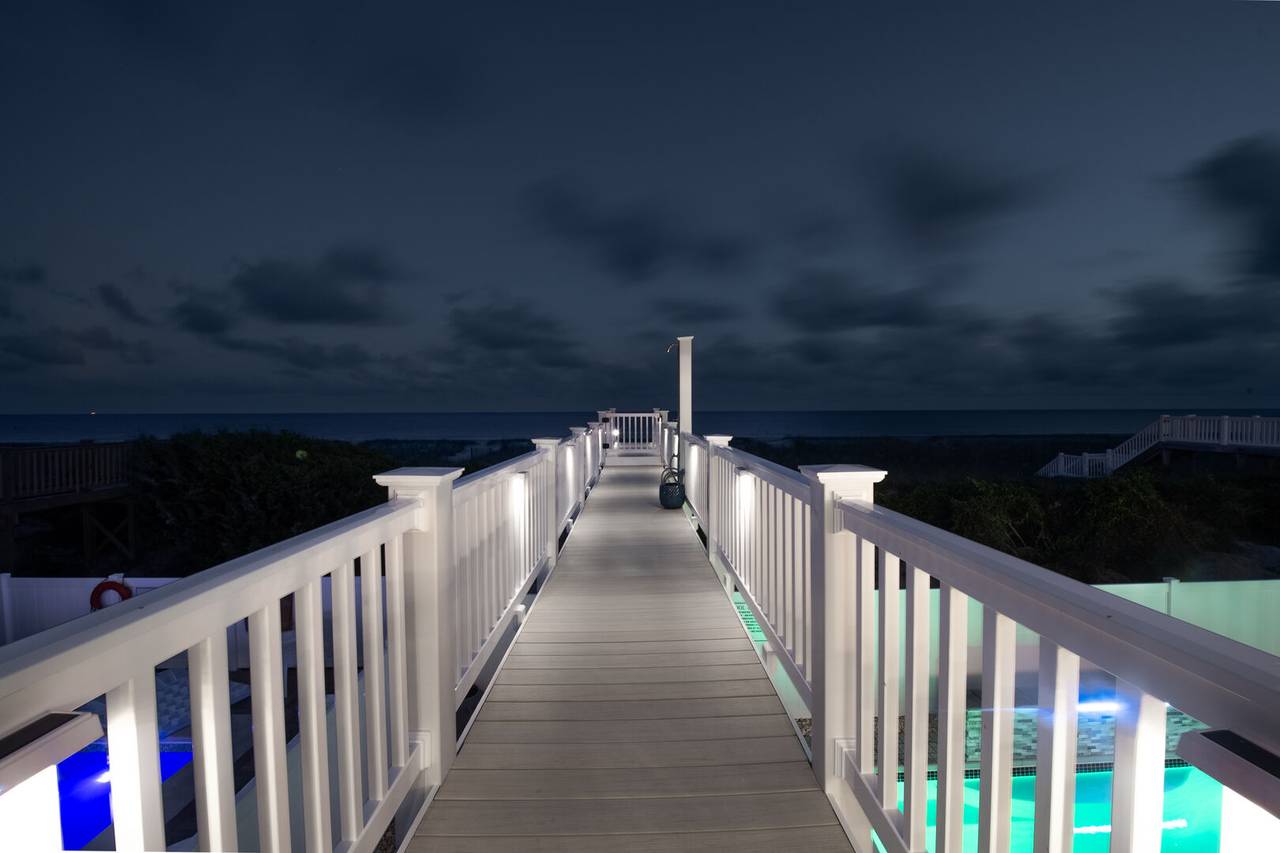 Speaking of breathtaking views, Carolina Joy has over 1,000 square feet of decks with magnificent 180-degree views of Holden Beach and a gorgeous boardwalk to the beach.  On the main floor deck, not only is there ample seating in ultra-comfortable gliders, but you will also find bistro-style seating and tables for quiet breakfasts, lazy lunches, and happy hours that can be served through the pass-through window.  When the sun goes down, the deck extends over the pool and hosts a 48” fire pit perfect for s’mores, roasted marshmallows, and your favorite beverage, complemented by the peaceful sounds of the gentle ocean breezes and waves.