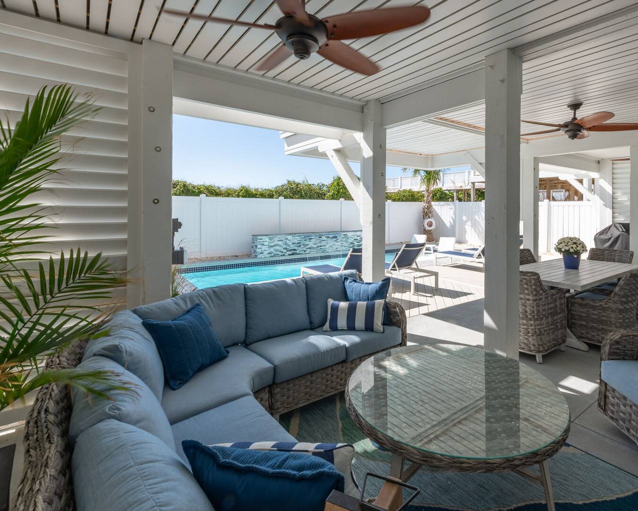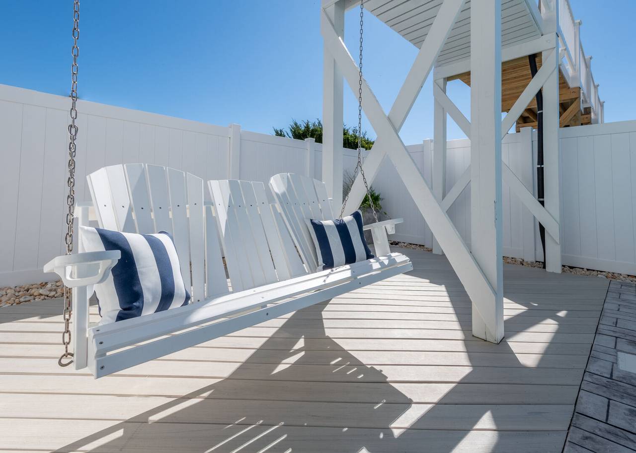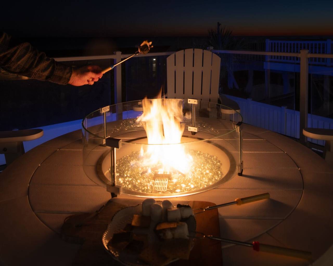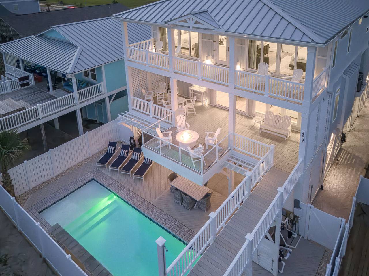 Speaking of breathtaking views, Carolina Joy has over 1,000 square feet of decks with magnificent 180-degree views of Holden Beach and a gorgeous boardwalk to the beach.  On the main floor deck, not only is there ample seating in ultra-comfortable gliders, but you will also find bistro-style seating and tables for quiet breakfasts, lazy lunches, and happy hours that can be served through the pass-through window.  When the sun goes down, the deck extends over the pool and hosts a 48” fire pit perfect for s’mores, roasted marshmallows, and your favorite beverage, complemented by the peaceful sounds of the gentle ocean breezes and waves.