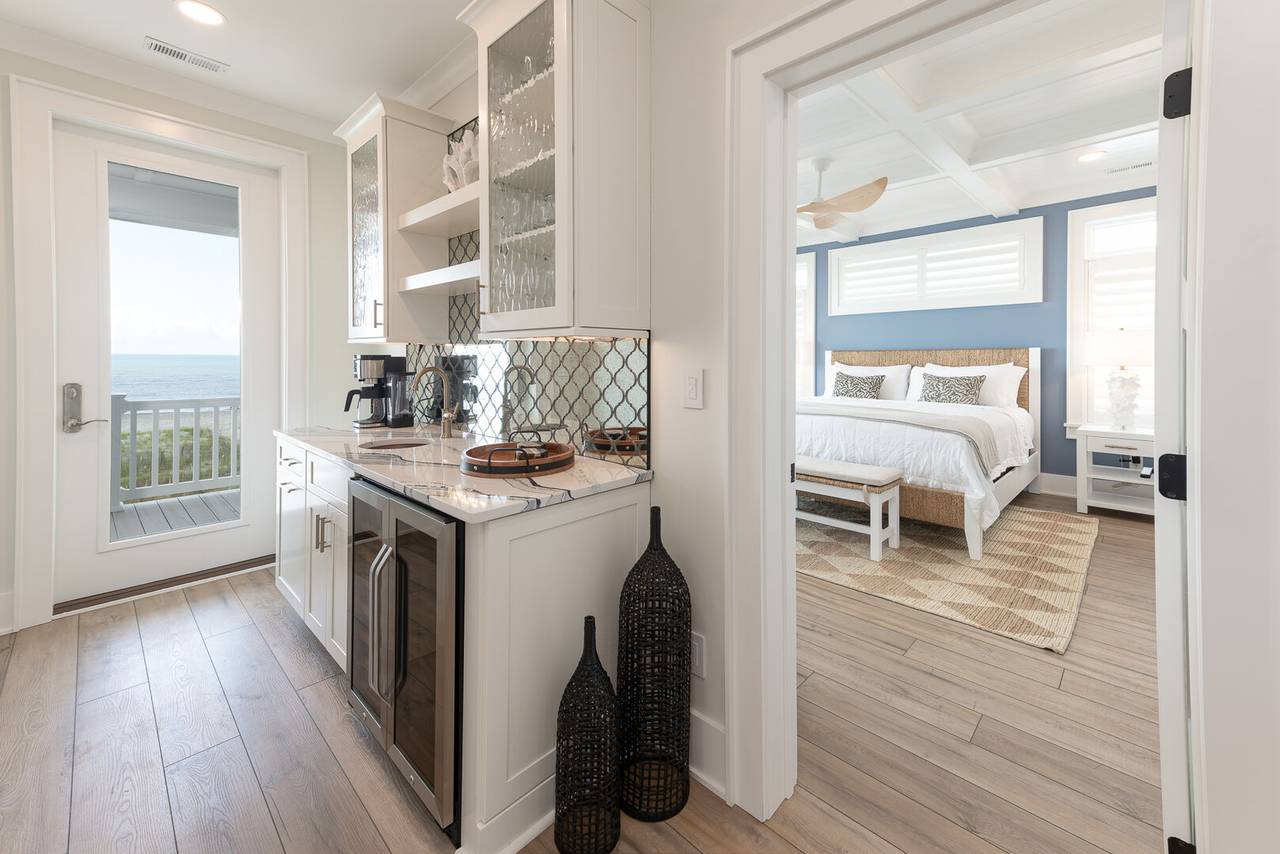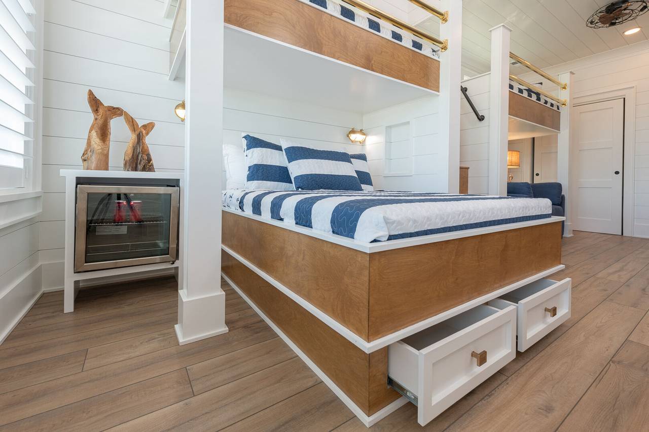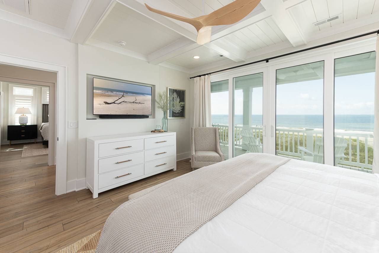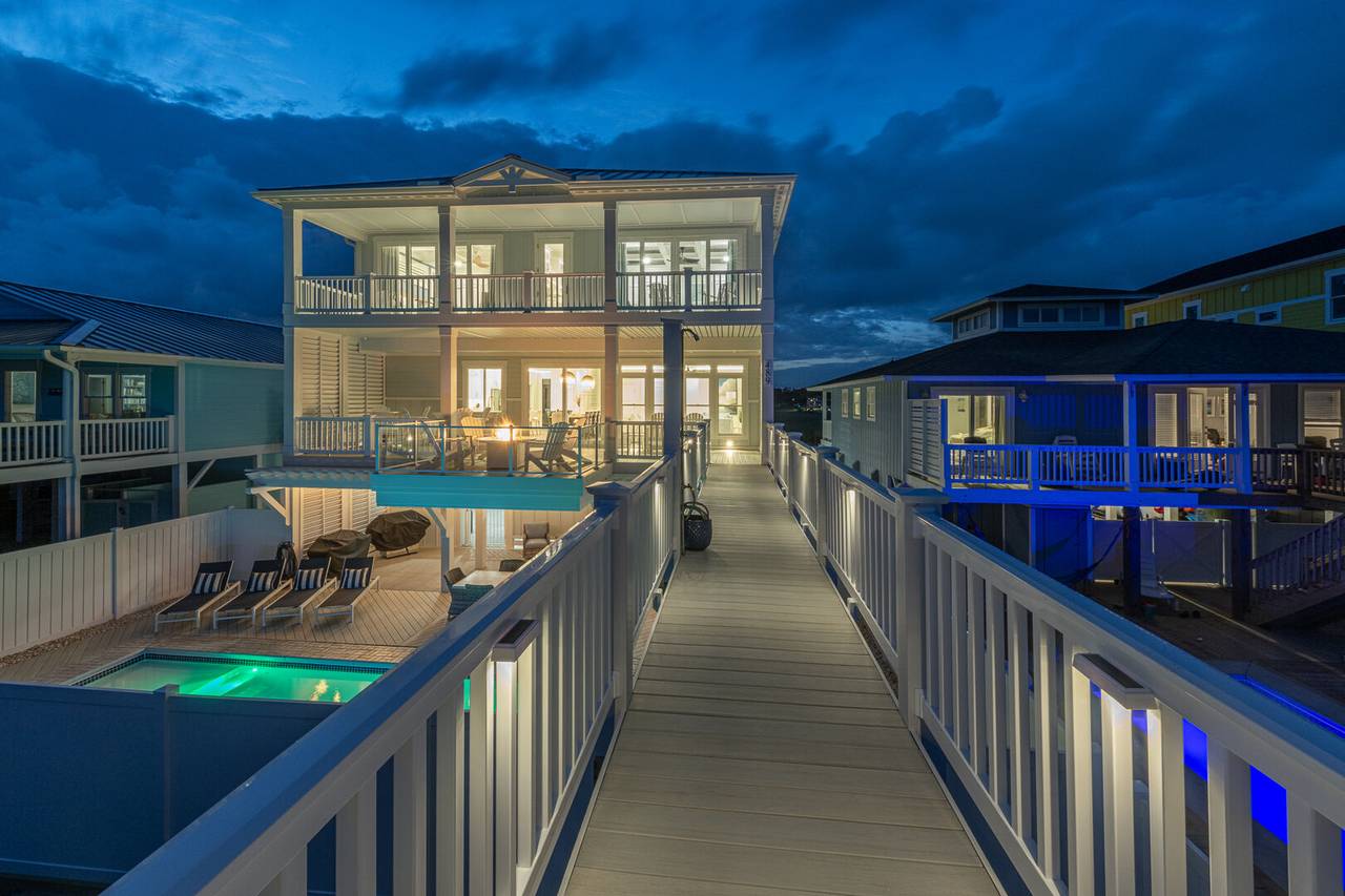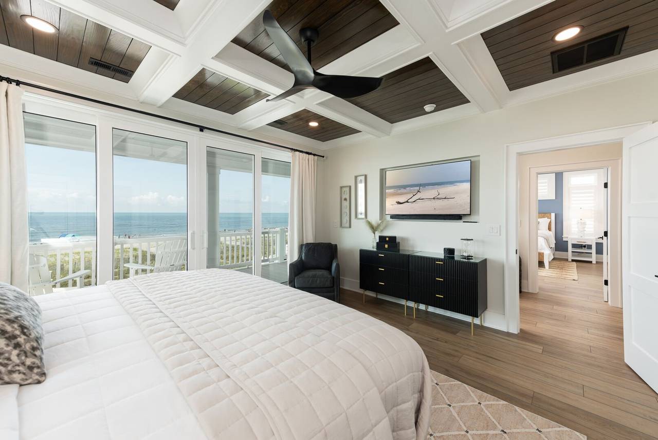 Moving to the main residence level, you will be surrounded by abundant natural light, spectacular ocean views, and award-winning chic decor where attention to detail is reminiscent of the finest Carolina Coastal homes with the embodiment of timeless elegance.  Each of the five luxurious bedrooms offers huge flat screen smart TVs with prewired gaming connections, incredibly comfortable beds, en suite bathrooms with bidets, and private mini fridges.  Next to all the beds are convenient charging stations for all your electronic devices.   Two primary king suites have their own private balconies with breathtaking ocean views, large flat screen smart TVs with surround sound, and spa-inspired showers with Japanese bidets offering warm seats and temperature-controlled water.  A third King suite located on the first floor has all the same 5-star amenities, including an en suite bathroom with a Japanese bidet and a private balcony, and a unique, unobstructed view of the intercoastal waterway.   The true star of the bedroom accommodations is the bunk room designed specifically for the young and young at heart.  Hosting up to 5  under a cathedral ceiling, the bunk room also has a private mini fridge and a massive 80” TV with surround sound prewired for their favorite gaming consoles.  On the top floor, hosting the bedrooms is also a full-service wet bar with a wine cooler, a 115 can beverage cooler, and a Cusinart Coffee station for lattes, cappuccinos, and espressos.  Prepare your favorite beverage and then move outside to the balcony to celebrate magnificent sunrises, toast the sunset, and marvel at the moonrise over Holden Beach Pier.