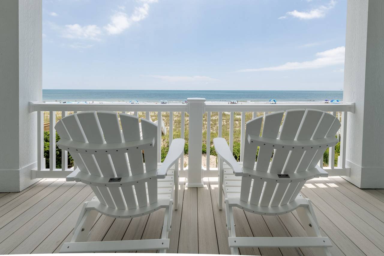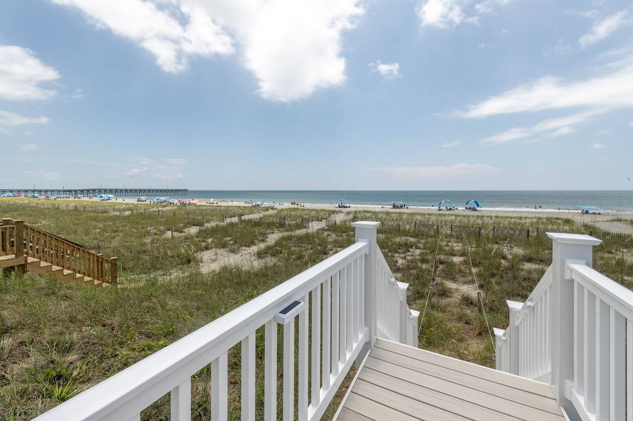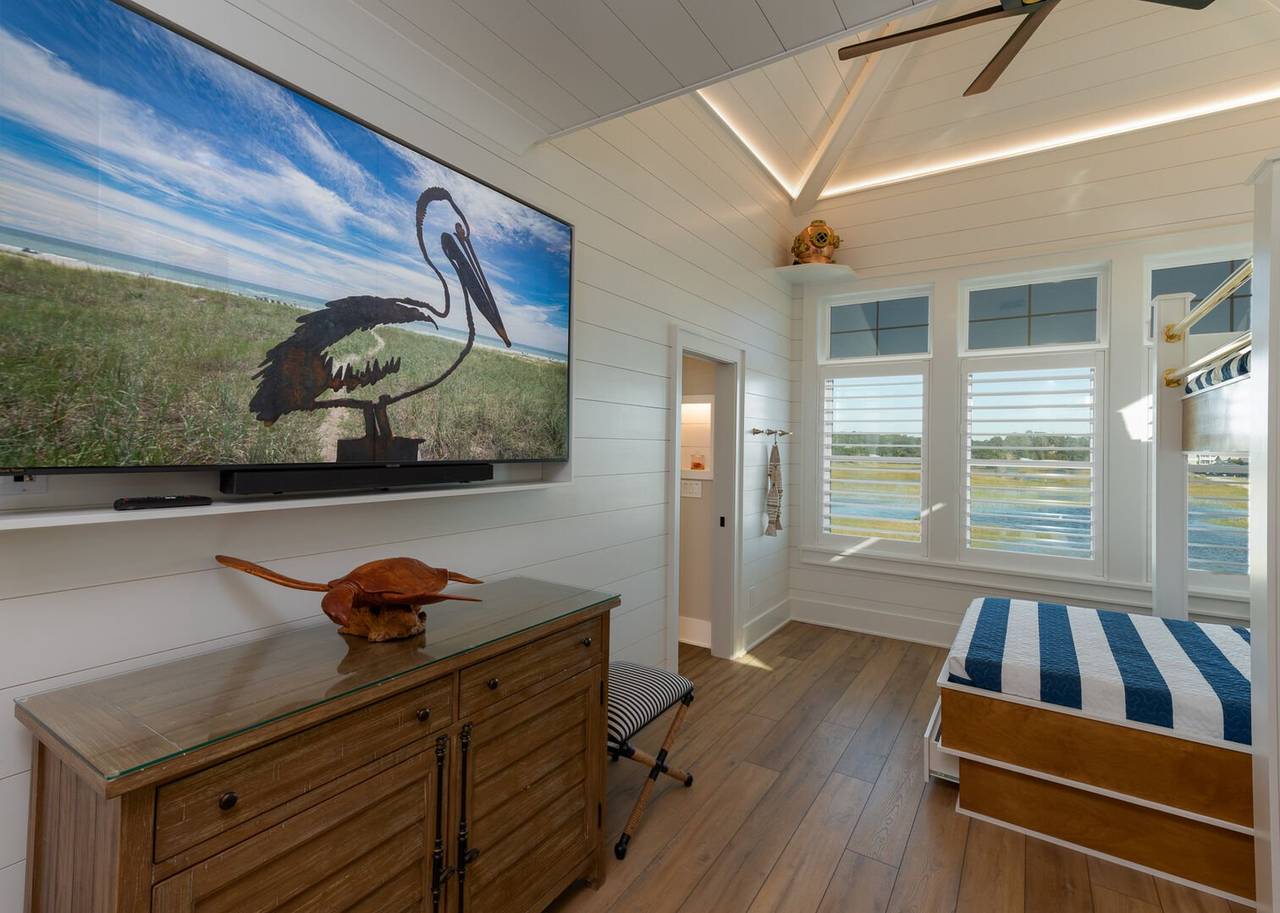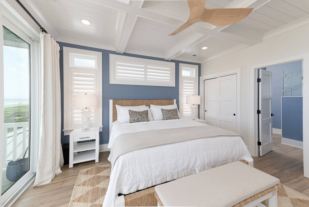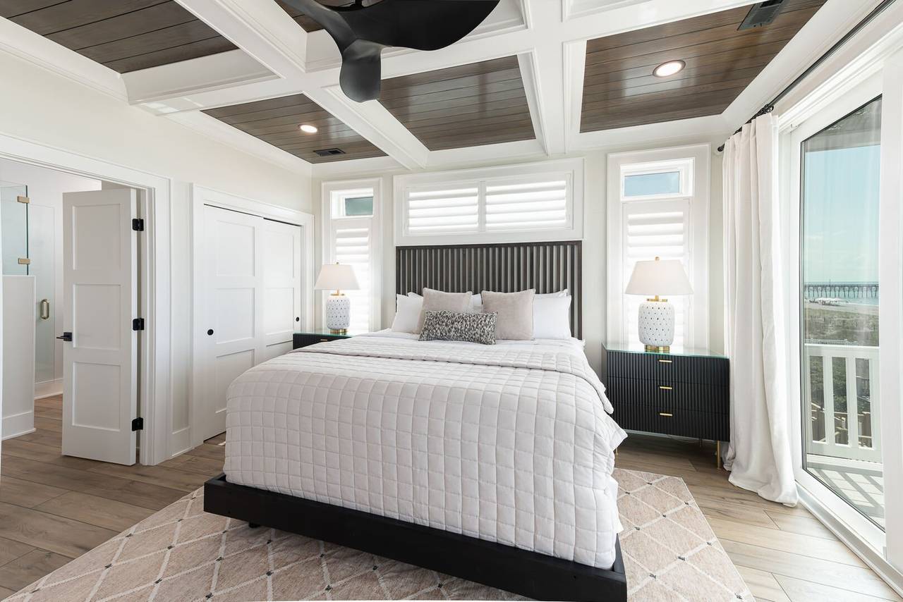 Moving to the main residence level, you will be surrounded by abundant natural light, spectacular ocean views, and award-winning chic decor where attention to detail is reminiscent of the finest Carolina Coastal homes with the embodiment of timeless elegance.  Each of the five luxurious bedrooms offers huge flat screen smart TVs with prewired gaming connections, incredibly comfortable beds, en suite bathrooms with bidets, and private mini fridges.  Next to all the beds are convenient charging stations for all your electronic devices.   Two primary king suites have their own private balconies with breathtaking ocean views, large flat screen smart TVs with surround sound, and spa-inspired showers with Japanese bidets offering warm seats and temperature-controlled water.  A third King suite located on the first floor has all the same 5-star amenities, including an en suite bathroom with a Japanese bidet and a private balcony, and a unique, unobstructed view of the intercoastal waterway.   The true star of the bedroom accommodations is the bunk room designed specifically for the young and young at heart.  Hosting up to 5  under a cathedral ceiling, the bunk room also has a private mini fridge and a massive 80” TV with surround sound prewired for their favorite gaming consoles.  On the top floor, hosting the bedrooms is also a full-service wet bar with a wine cooler, a 115 can beverage cooler, and a Cusinart Coffee station for lattes, cappuccinos, and espressos.  Prepare your favorite beverage and then move outside to the balcony to celebrate magnificent sunrises, toast the sunset, and marvel at the moonrise over Holden Beach Pier.