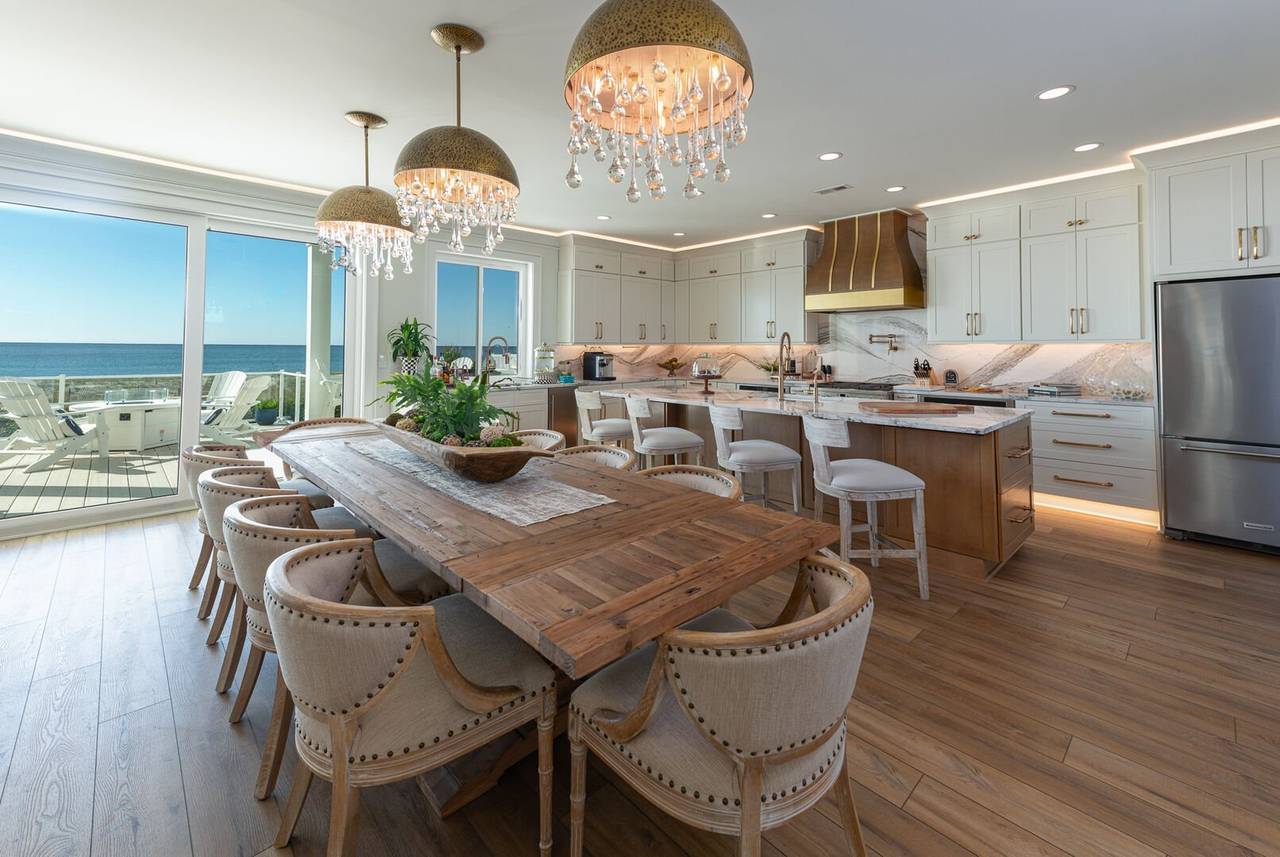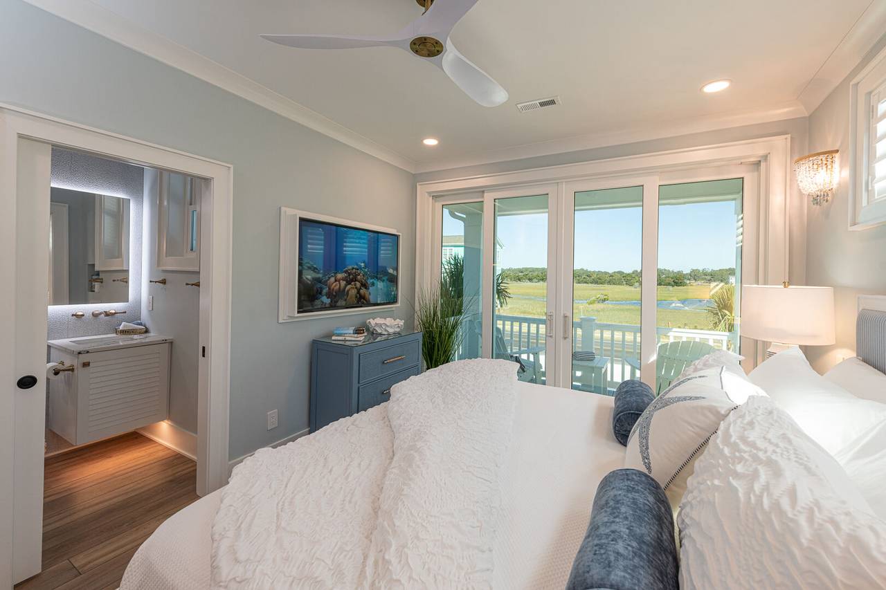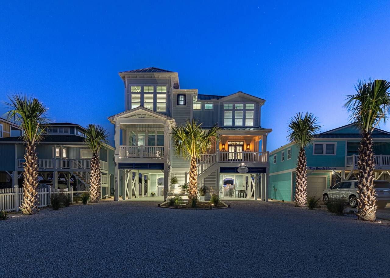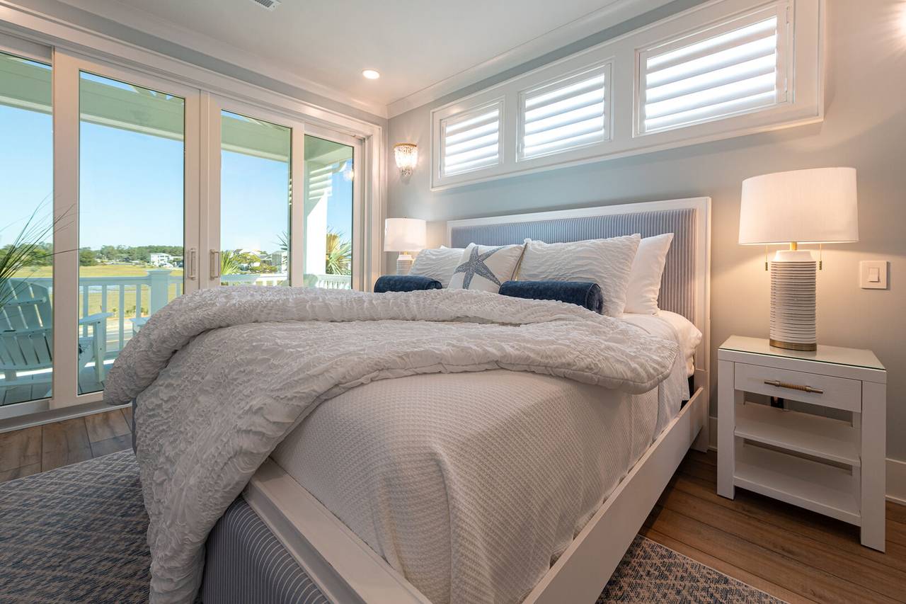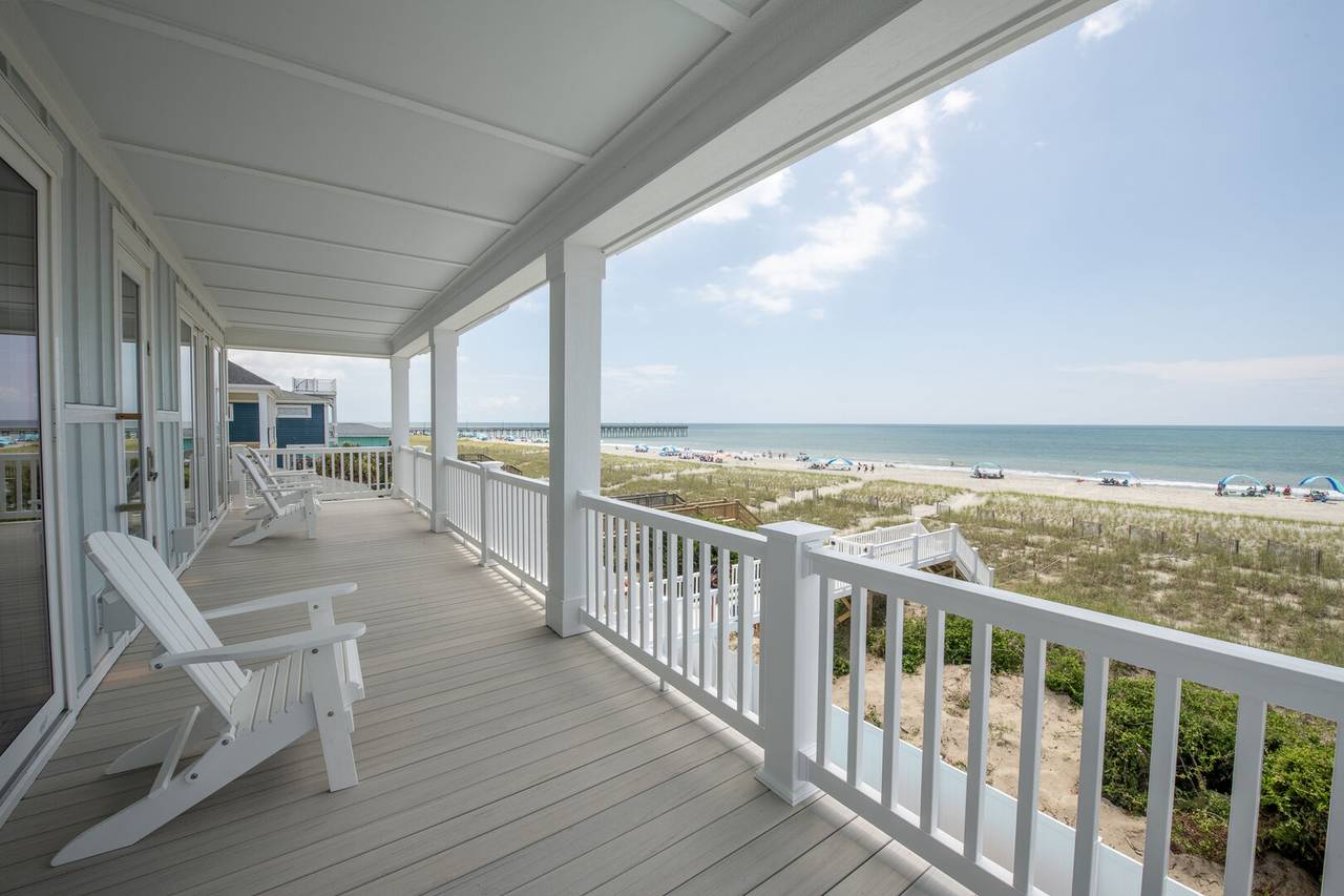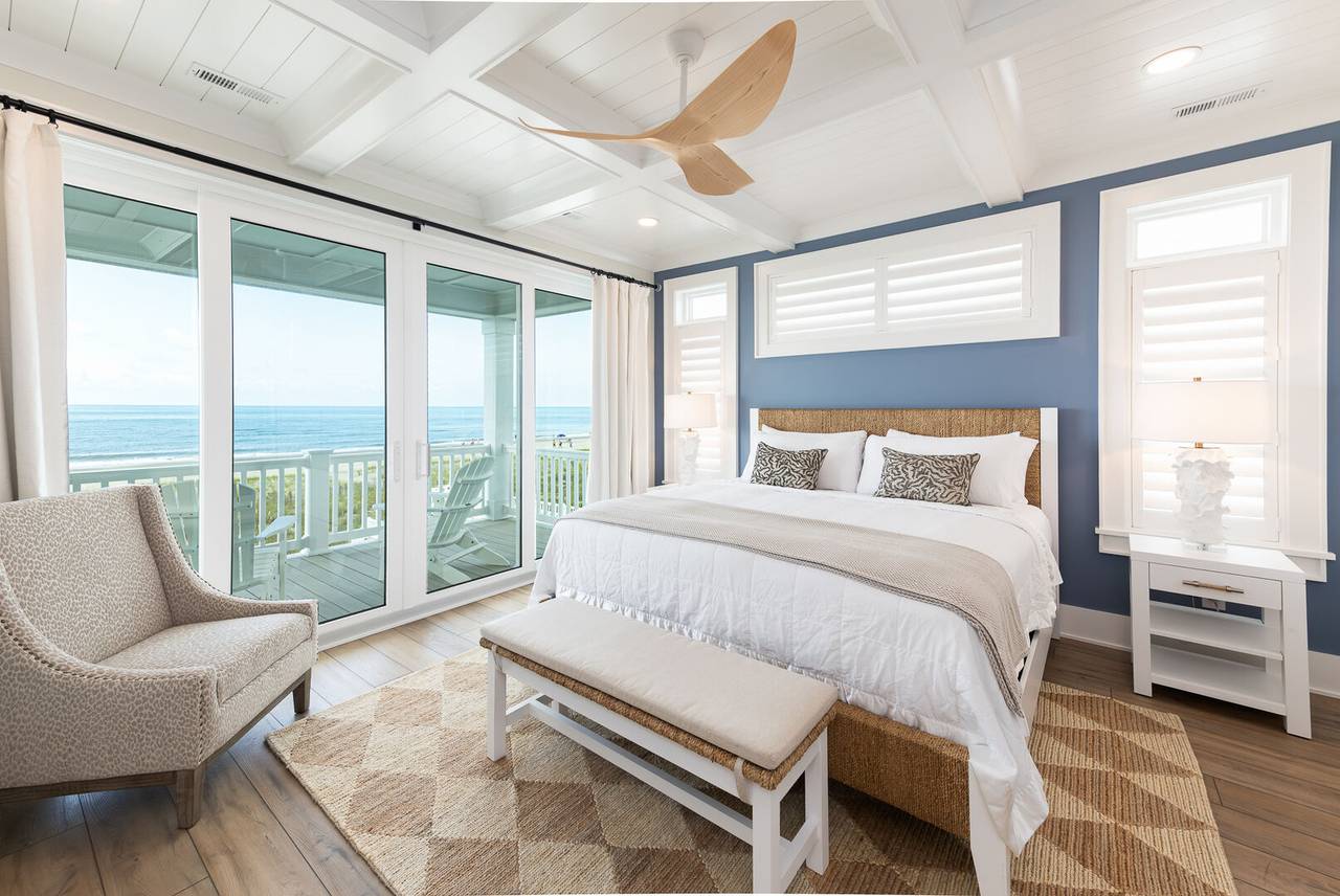 Moving to the main residence level, you will be surrounded by abundant natural light, spectacular ocean views, and award-winning chic decor where attention to detail is reminiscent of the finest Carolina Coastal homes with the embodiment of timeless elegance.  Each of the five luxurious bedrooms offers huge flat screen smart TVs with prewired gaming connections, incredibly comfortable beds, en suite bathrooms with bidets, and private mini fridges.  Next to all the beds are convenient charging stations for all your electronic devices.   Two primary king suites have their own private balconies with breathtaking ocean views, large flat screen smart TVs with surround sound, and spa-inspired showers with Japanese bidets offering warm seats and temperature-controlled water.  A third King suite located on the first floor has all the same 5-star amenities, including an en suite bathroom with a Japanese bidet and a private balcony, and a unique, unobstructed view of the intercoastal waterway.   The true star of the bedroom accommodations is the bunk room designed specifically for the young and young at heart.  Hosting up to 5  under a cathedral ceiling, the bunk room also has a private mini fridge and a massive 80” TV with surround sound prewired for their favorite gaming consoles.  On the top floor, hosting the bedrooms is also a full-service wet bar with a wine cooler, a 115 can beverage cooler, and a Cusinart Coffee station for lattes, cappuccinos, and espressos.  Prepare your favorite beverage and then move outside to the balcony to celebrate magnificent sunrises, toast the sunset, and marvel at the moonrise over Holden Beach Pier.