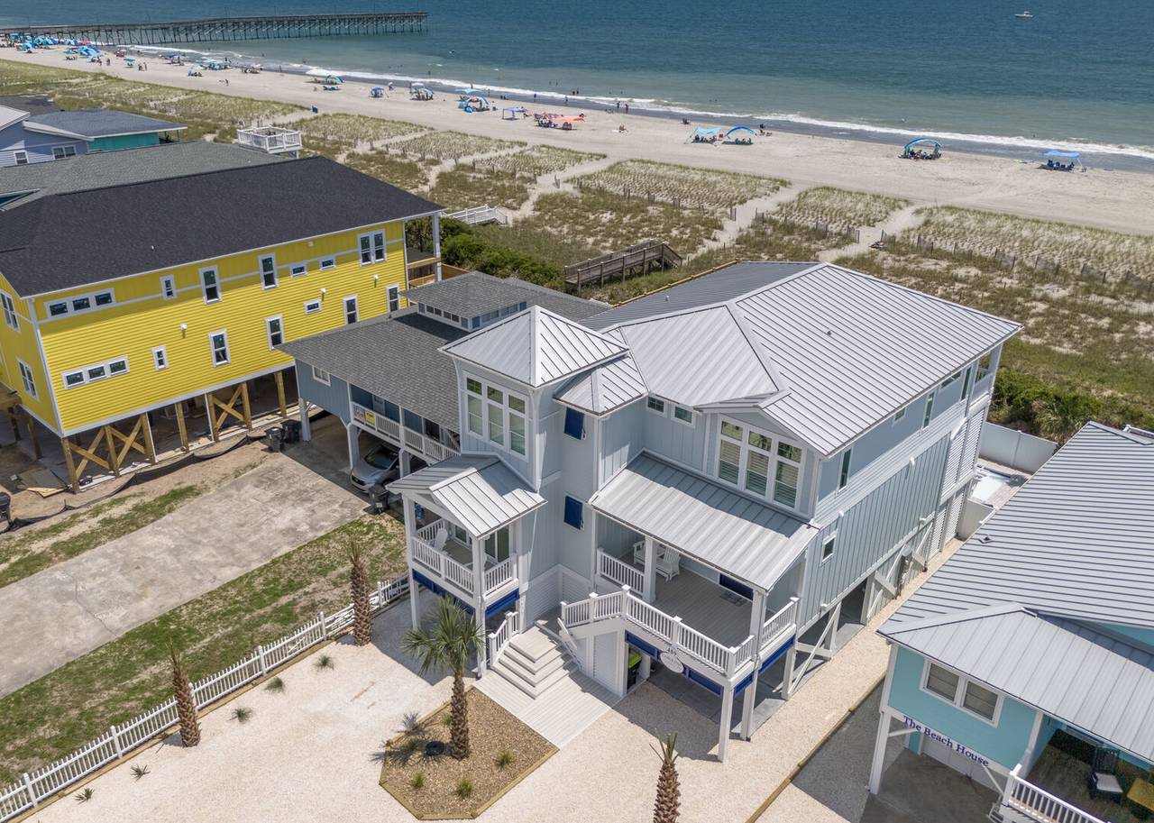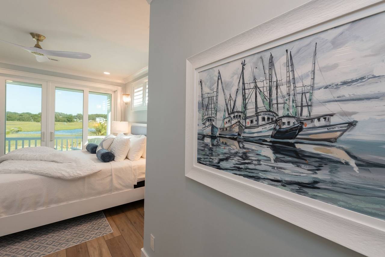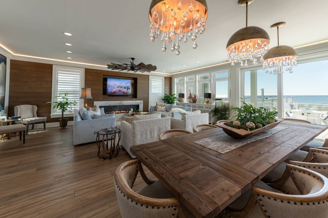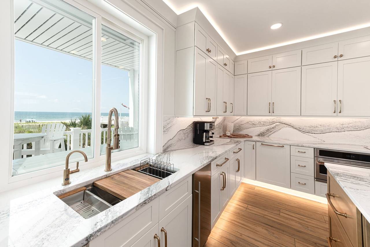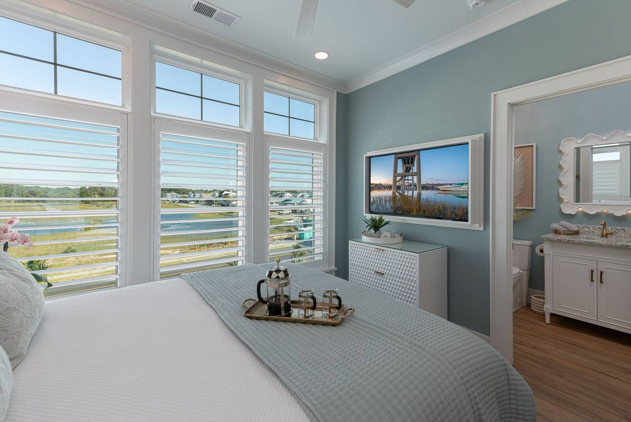 Moving to the main residence level, you will be surrounded by abundant natural light, spectacular ocean views, and award-winning chic decor where attention to detail is reminiscent of the finest Carolina Coastal homes with the embodiment of timeless elegance.  Each of the five luxurious bedrooms offers huge flat screen smart TVs with prewired gaming connections, incredibly comfortable beds, en suite bathrooms with bidets, and private mini fridges.  Next to all the beds are convenient charging stations for all your electronic devices.   Two primary king suites have their own private balconies with breathtaking ocean views, large flat screen smart TVs with surround sound, and spa-inspired showers with Japanese bidets offering warm seats and temperature-controlled water.  A third King suite located on the first floor has all the same 5-star amenities, including an en suite bathroom with a Japanese bidet and a private balcony, and a unique, unobstructed view of the intercoastal waterway.   The true star of the bedroom accommodations is the bunk room designed specifically for the young and young at heart.  Hosting up to 5  under a cathedral ceiling, the bunk room also has a private mini fridge and a massive 80” TV with surround sound prewired for their favorite gaming consoles.  On the top floor, hosting the bedrooms is also a full-service wet bar with a wine cooler, a 115 can beverage cooler, and a Cusinart Coffee station for lattes, cappuccinos, and espressos.  Prepare your favorite beverage and then move outside to the balcony to celebrate magnificent sunrises, toast the sunset, and marvel at the moonrise over Holden Beach Pier.