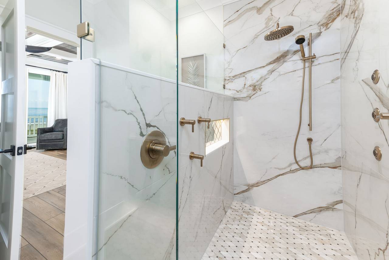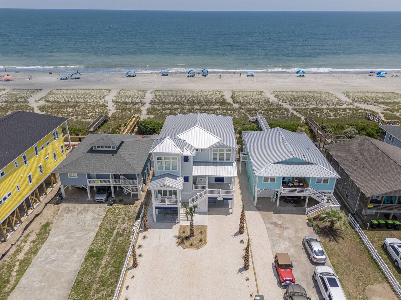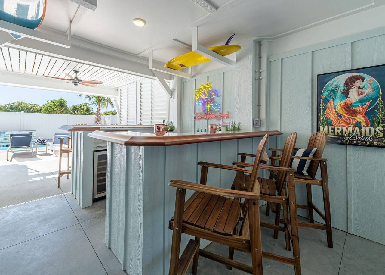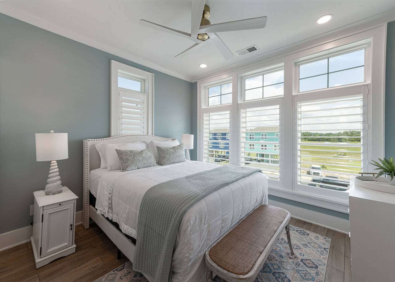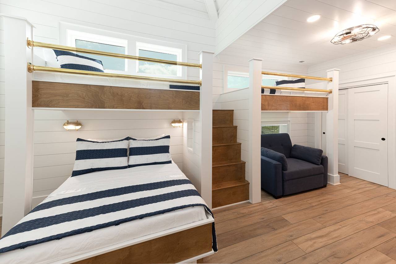 Moving to the main residence level, you will be surrounded by abundant natural light, spectacular ocean views, and award-winning chic decor where attention to detail is reminiscent of the finest Carolina Coastal homes with the embodiment of timeless elegance.  Each of the five luxurious bedrooms offers huge flat screen smart TVs with prewired gaming connections, incredibly comfortable beds, en suite bathrooms with bidets, and private mini fridges.  Next to all the beds are convenient charging stations for all your electronic devices.   Two primary king suites have their own private balconies with breathtaking ocean views, large flat screen smart TVs with surround sound, and spa-inspired showers with Japanese bidets offering warm seats and temperature-controlled water.  A third King suite located on the first floor has all the same 5-star amenities, including an en suite bathroom with a Japanese bidet and a private balcony, and a unique, unobstructed view of the intercoastal waterway.   The true star of the bedroom accommodations is the bunk room designed specifically for the young and young at heart.  Hosting up to 5  under a cathedral ceiling, the bunk room also has a private mini fridge and a massive 80” TV with surround sound prewired for their favorite gaming consoles.  On the top floor, hosting the bedrooms is also a full-service wet bar with a wine cooler, a 115 can beverage cooler, and a Cusinart Coffee station for lattes, cappuccinos, and espressos.  Prepare your favorite beverage and then move outside to the balcony to celebrate magnificent sunrises, toast the sunset, and marvel at the moonrise over Holden Beach Pier.