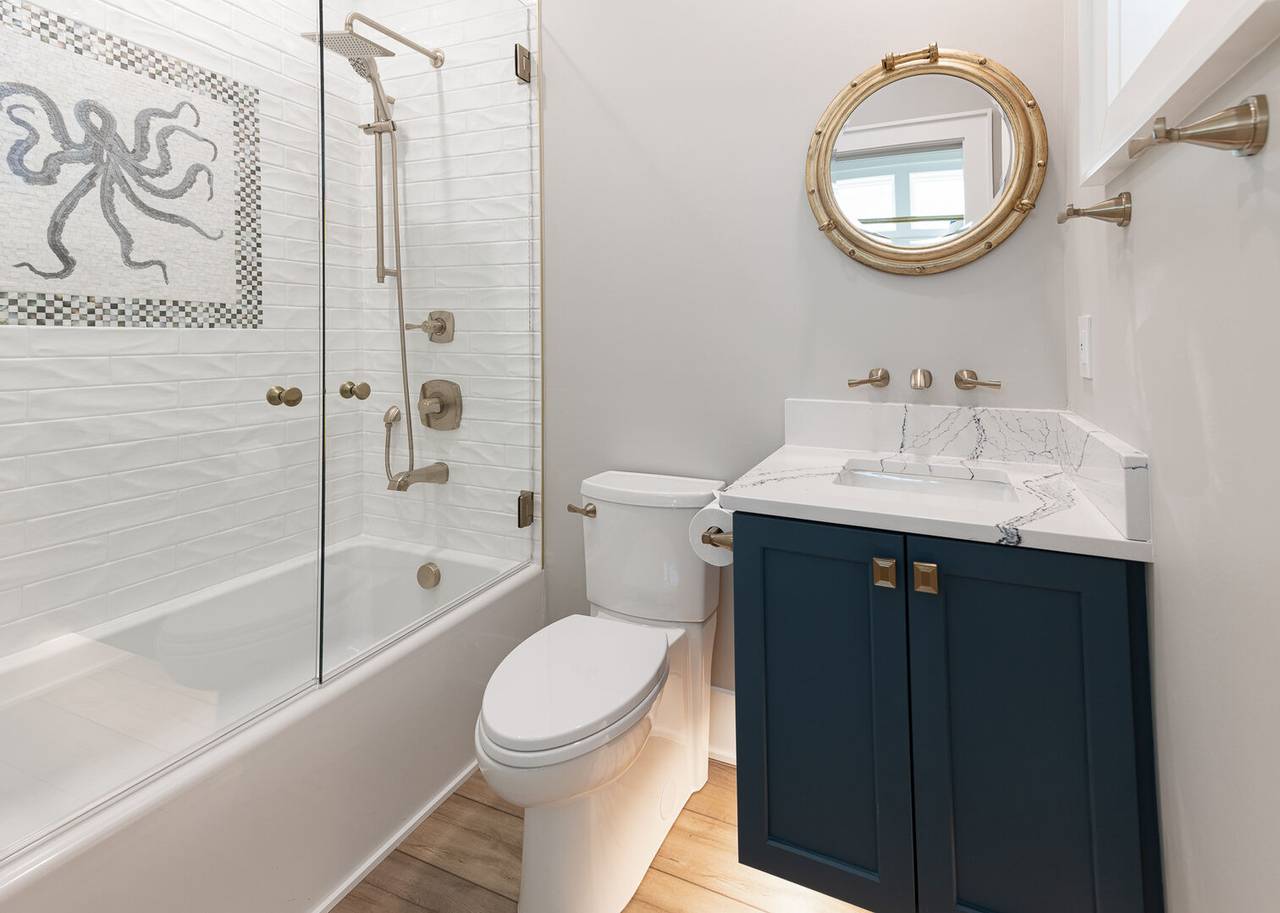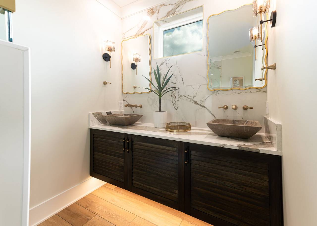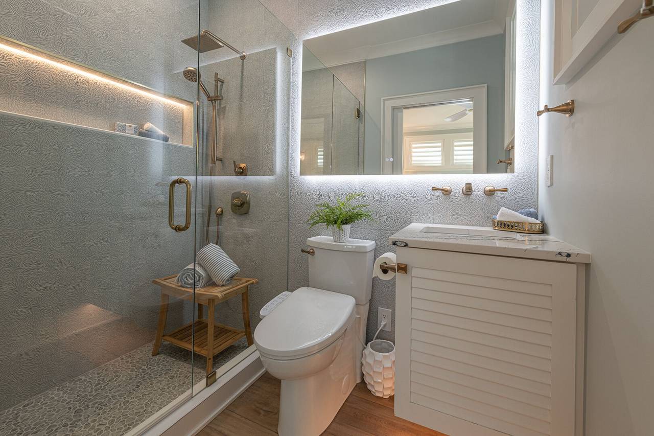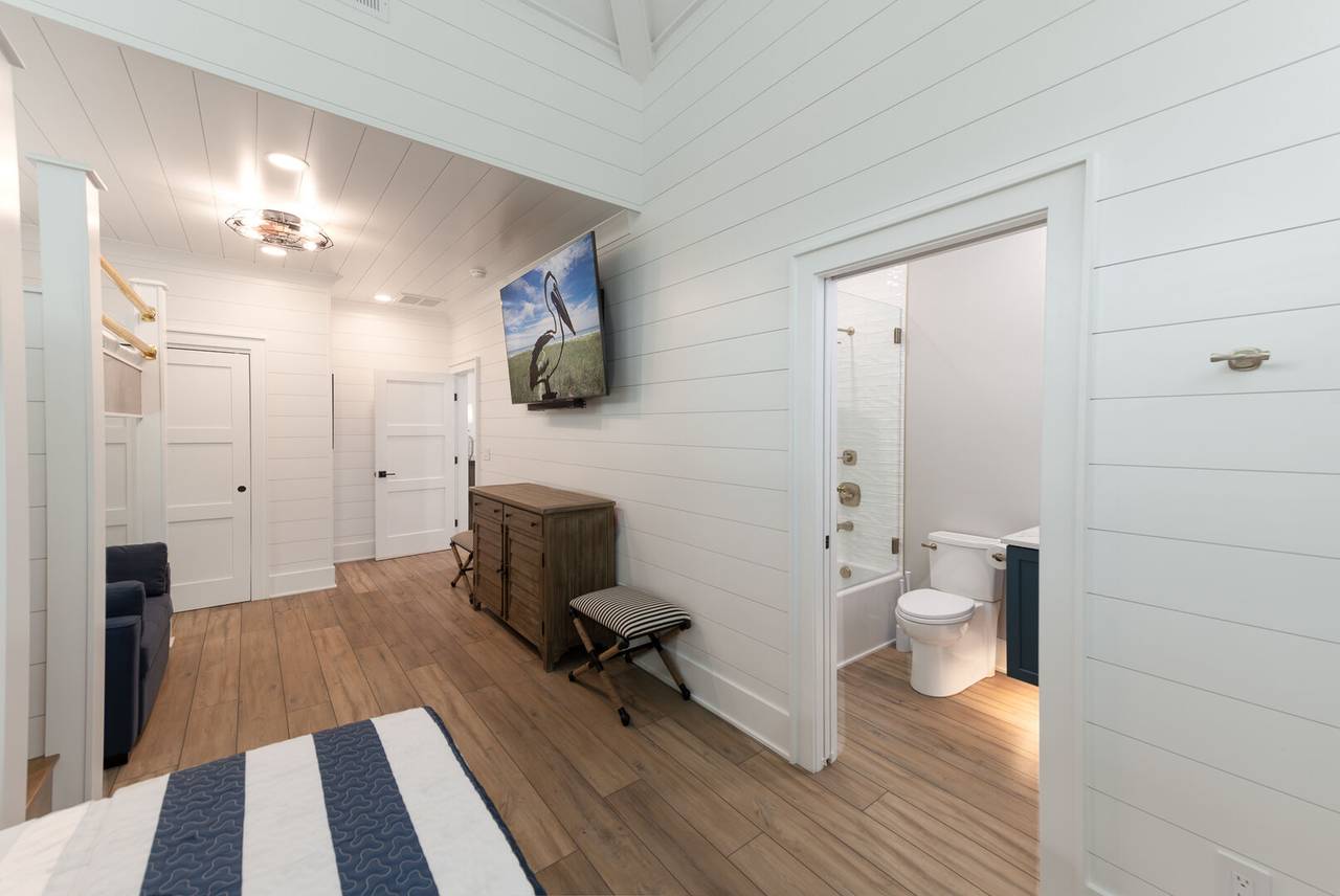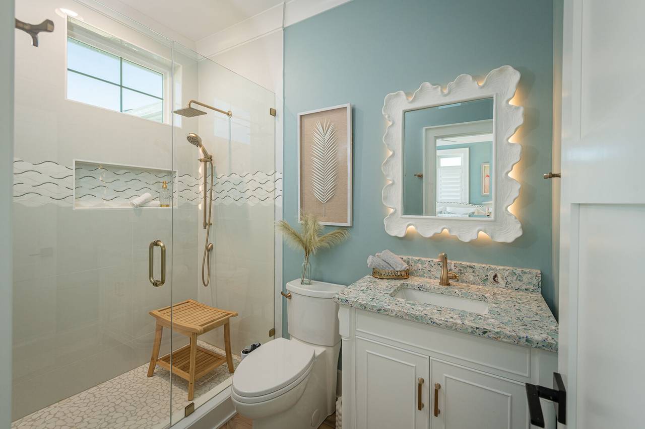 Moving to the main residence level, you will be surrounded by abundant natural light, spectacular ocean views, and award-winning chic decor where attention to detail is reminiscent of the finest Carolina Coastal homes with the embodiment of timeless elegance.  Each of the five luxurious bedrooms offers huge flat screen smart TVs with prewired gaming connections, incredibly comfortable beds, en suite bathrooms with bidets, and private mini fridges.  Next to all the beds are convenient charging stations for all your electronic devices.   Two primary king suites have their own private balconies with breathtaking ocean views, large flat screen smart TVs with surround sound, and spa-inspired showers with Japanese bidets offering warm seats and temperature-controlled water.  A third King suite located on the first floor has all the same 5-star amenities, including an en suite bathroom with a Japanese bidet and a private balcony, and a unique, unobstructed view of the intercoastal waterway.   The true star of the bedroom accommodations is the bunk room designed specifically for the young and young at heart.  Hosting up to 5  under a cathedral ceiling, the bunk room also has a private mini fridge and a massive 80” TV with surround sound prewired for their favorite gaming consoles.  On the top floor, hosting the bedrooms is also a full-service wet bar with a wine cooler, a 115 can beverage cooler, and a Cusinart Coffee station for lattes, cappuccinos, and espressos.  Prepare your favorite beverage and then move outside to the balcony to celebrate magnificent sunrises, toast the sunset, and marvel at the moonrise over Holden Beach Pier.