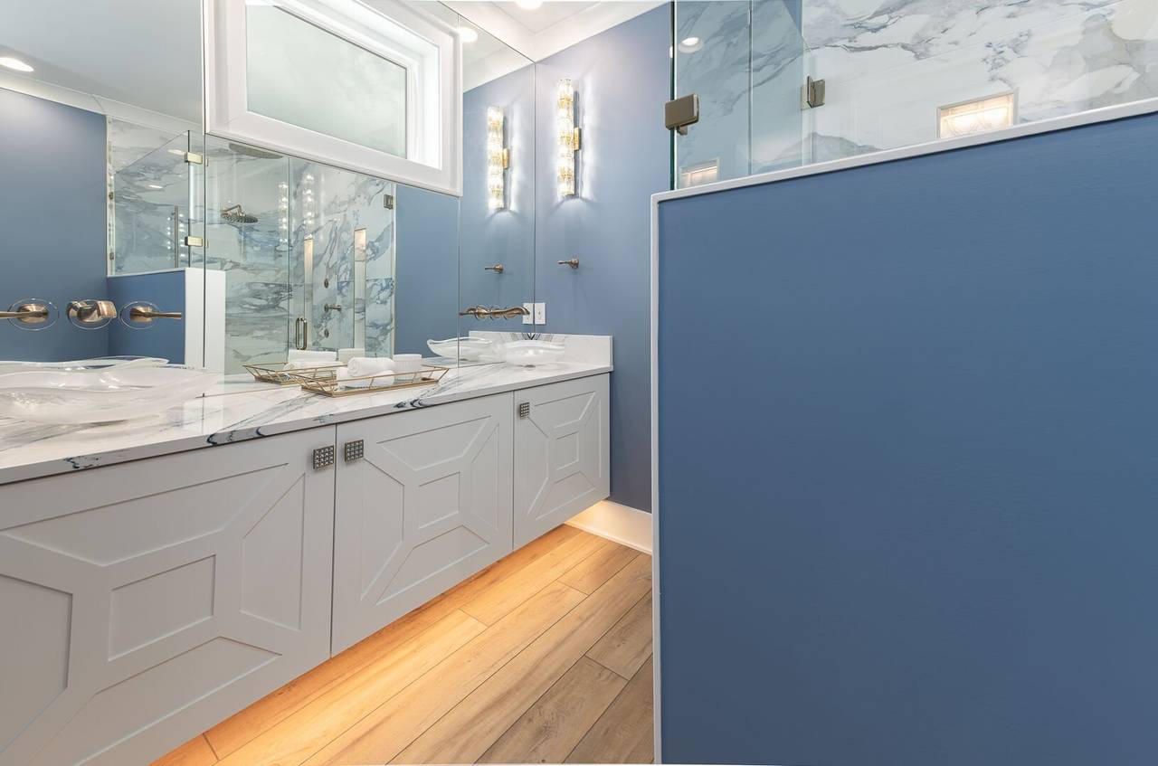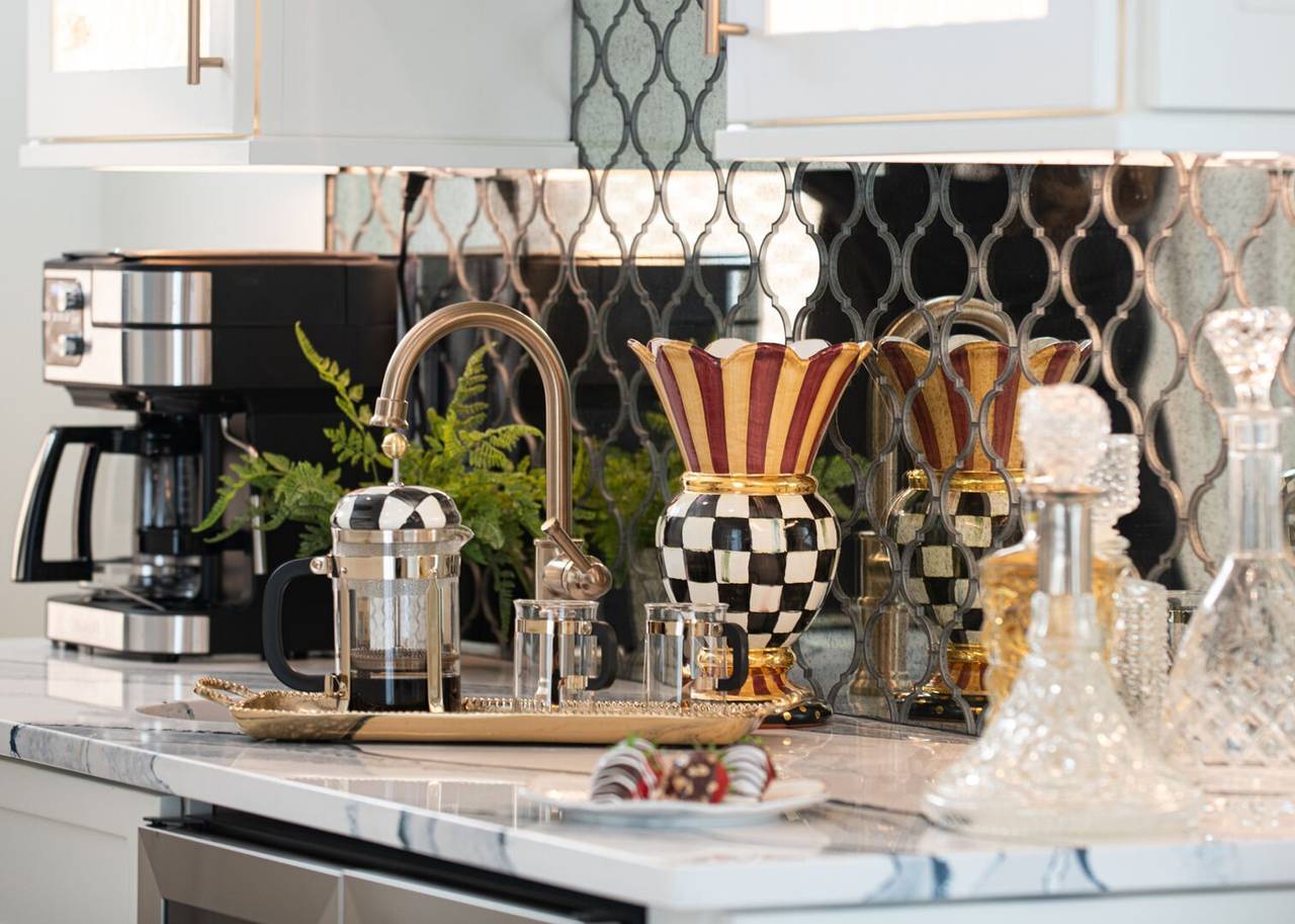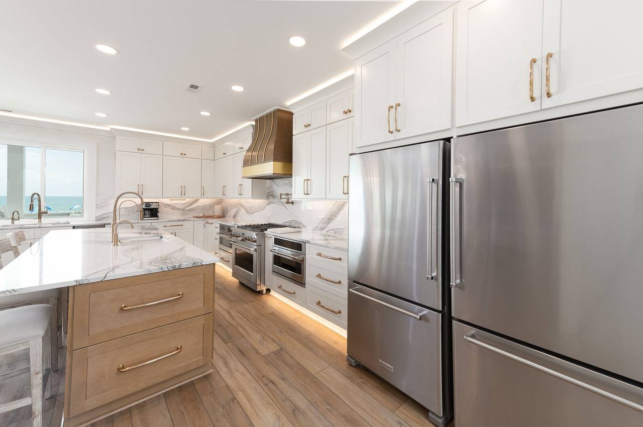 On the main floor, foodies will delight in a chef’s kitchen hosting a 6-burner gas range, oven, and 2 convection microwave ovens.  The oversized kitchen also boasts double refrigerators and freezers, a dual temperature wine and beverage cooler, and a dedicated 35lb, high-capacity ice maker.  Above the wine cooler, you will find a 2nd prep sink and another beverage station for your favorite drinks, along with yet another Cuisinart Coffee maker for drip coffee, espressos, and cappuccinos.