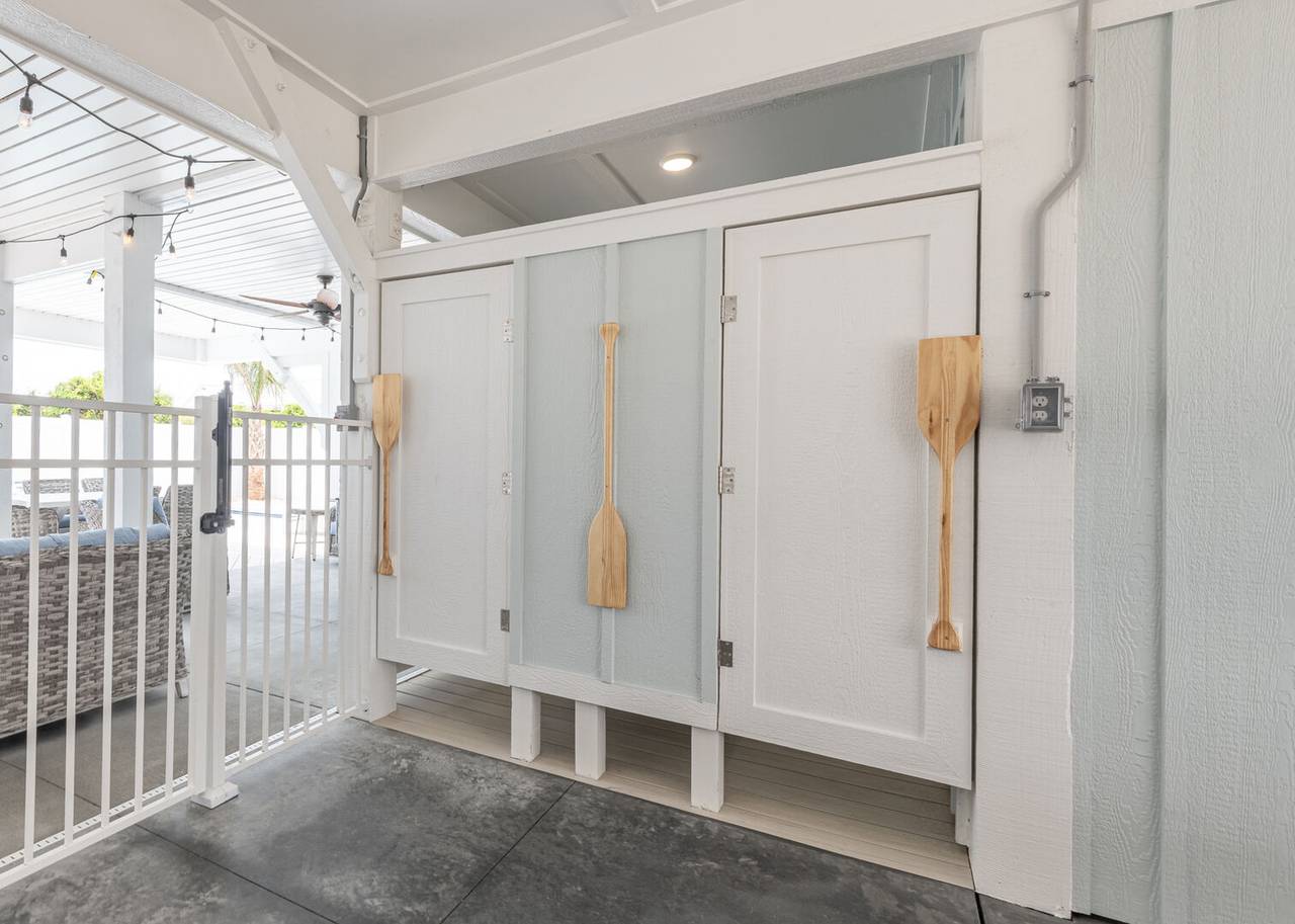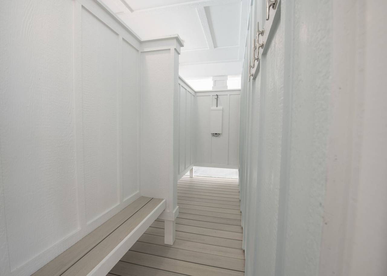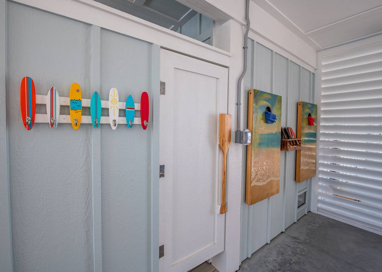 Carolina Joy provides a residential passenger elevator to make access to the residential levels easy, while loading and unloading is a breeze!  No need to tote groceries and luggage up the stairs.  And on the ground floor lobby to access the elevator is a dedicated area with a reclaimed, historic church pew to sit and change, plus storage for all your beach fun toys.
