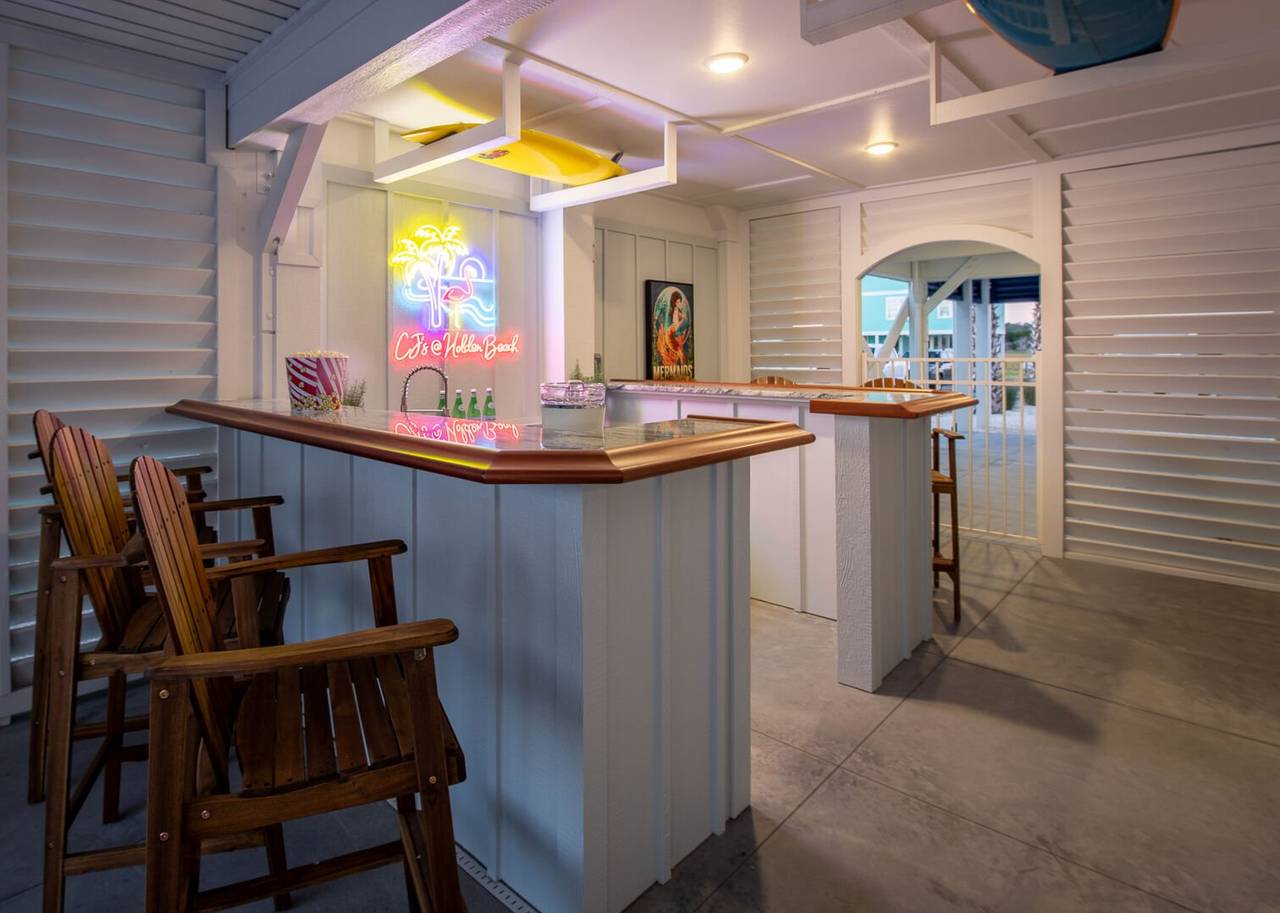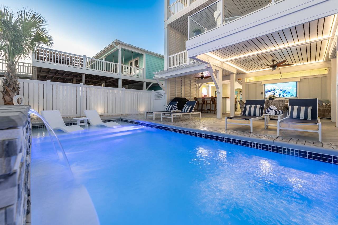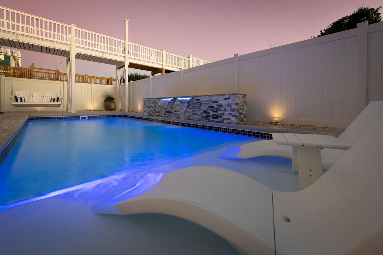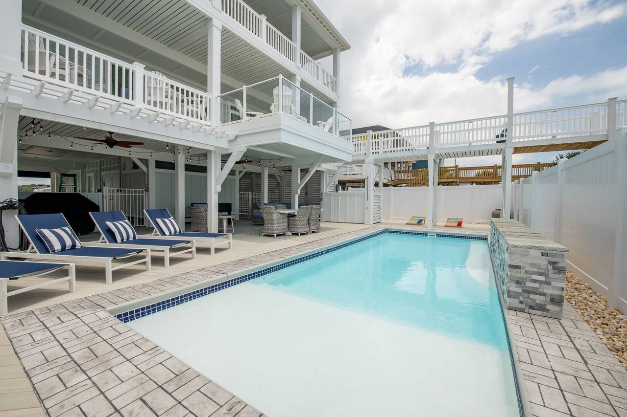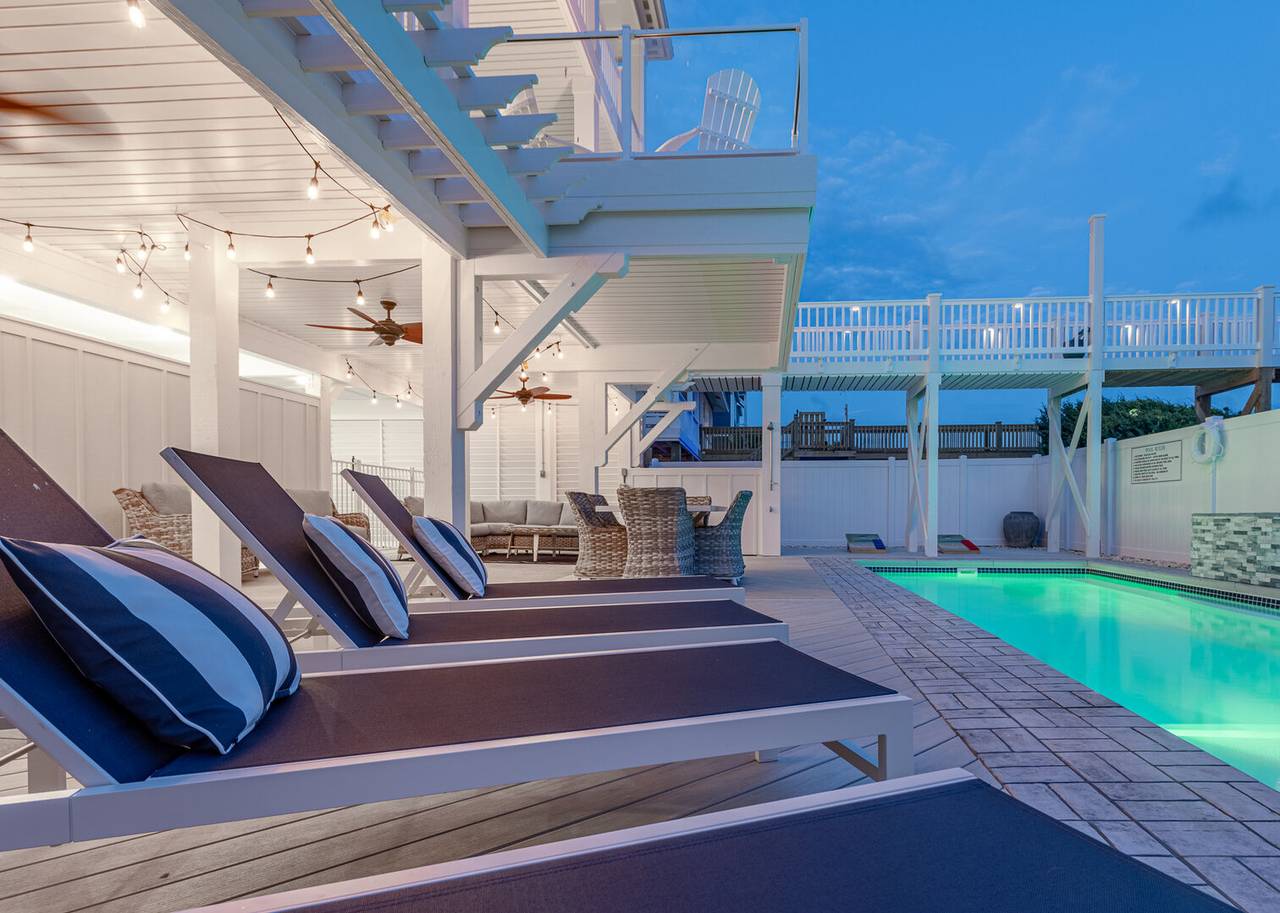 Entering this private luxury residence beginning on the ground floor, you will encounter CJs @ Holden Beach hosting over 1500 square feet of unparalleled oceanfront entertainment anchored by an exclusive oversized pool with a waterfall and tanning ledge perfect for small children or lounging in the water chaises with your favorite beverage.   The pool may be heated from May through September for an additional fee of $500 per week.  Please note that under optimal conditions, the pool temperature will achieve 10 degrees above the outside temperature to a maximum of 87 degrees F.  Please call our office to schedule this service in advance.