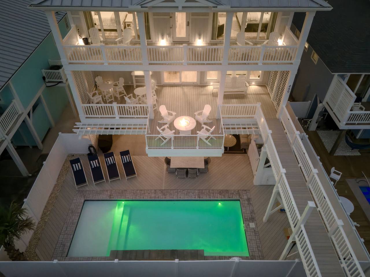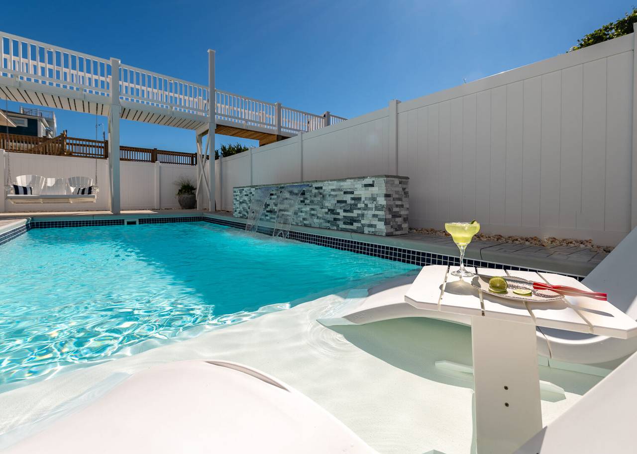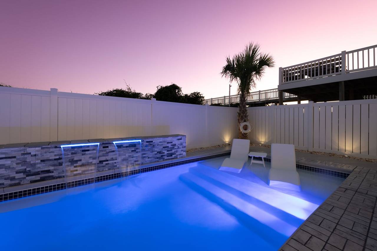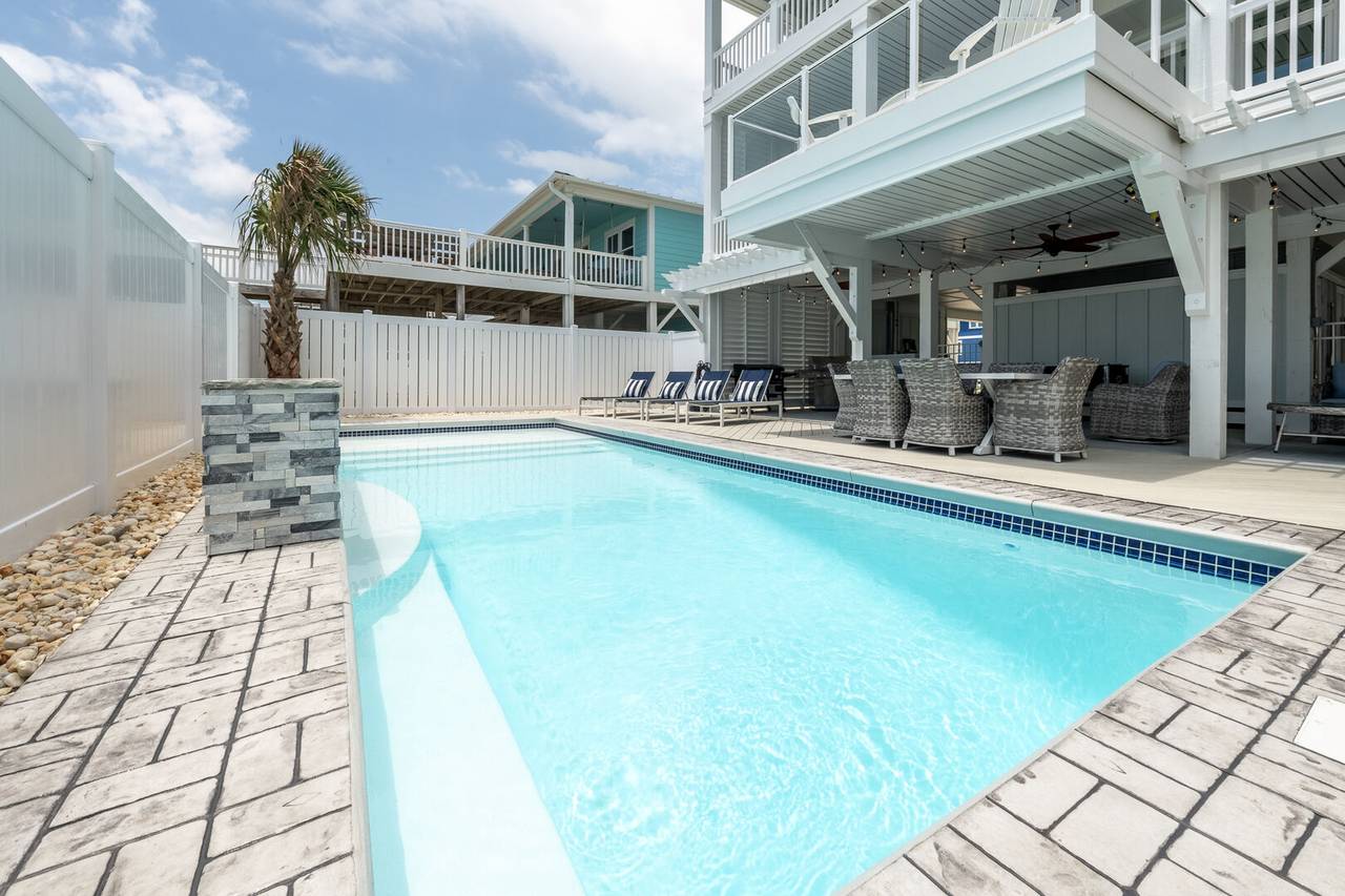 Entering this private luxury residence beginning on the ground floor, you will encounter CJs @ Holden Beach hosting over 1500 square feet of unparalleled oceanfront entertainment anchored by an exclusive oversized pool with a waterfall and tanning ledge perfect for small children or lounging in the water chaises with your favorite beverage.   The pool may be heated from May through September for an additional fee of $500 per week.  Please note that under optimal conditions, the pool temperature will achieve 10 degrees above the outside temperature to a maximum of 87 degrees F.  Please call our office to schedule this service in advance.