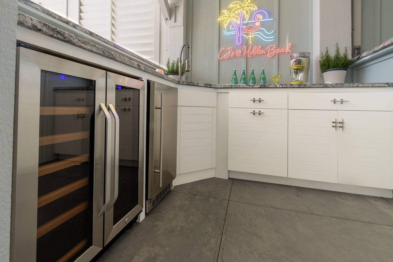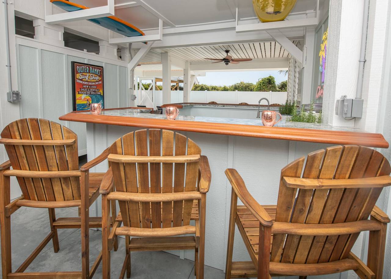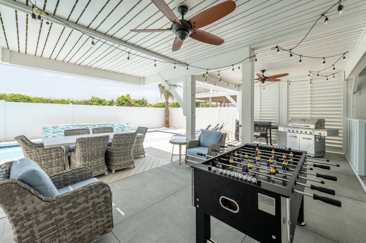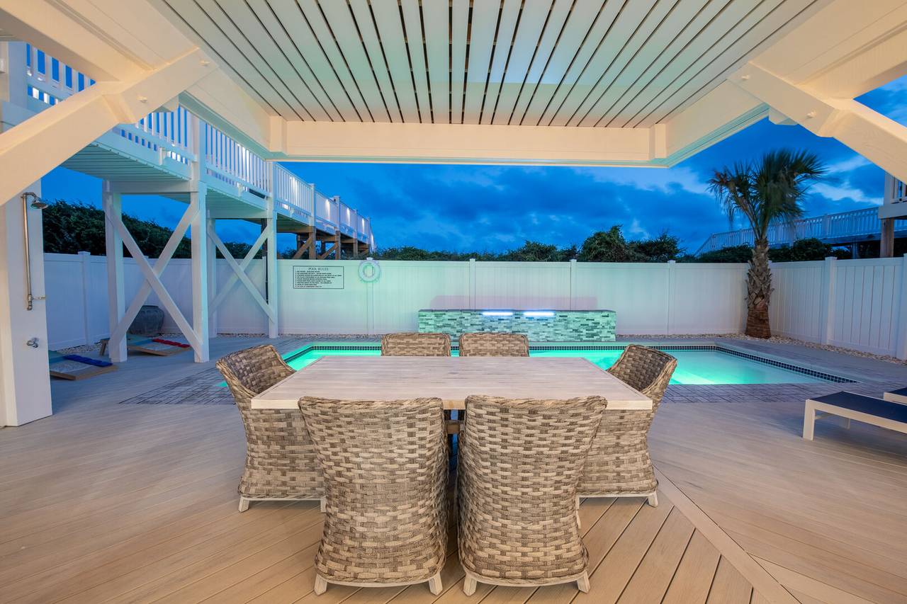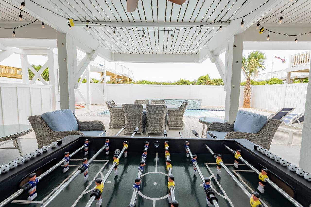 Steps from the spectacular pool, CJs @ Holden Beach hosts a full-service dedicated outdoor kitchen and bar complete with a 6-burner gas grill, built-in wine cooler, beverage cooler for 115 drinks, and a high-capacity 35lb ice maker for your favorite refreshments.  Frozen margaritas, daiquiris, anyone? Enjoy the ocean air in the adjacent lounge area with ample, super comfortable seating and the outdoor dining area in front of a 75” smart TV with pre-wired connections for gaming consoles. Perfect for game days or movie nights!   Poolside games include foosball, ping pong, and cornhole.  Private outdoor showers with hot and cold water and ample dressing area are perfect for rinsing off the salt water after a day on the beach or from lounging around this impeccably designed pool.  CJs is Holden Beach’s only complete family entertainment center!