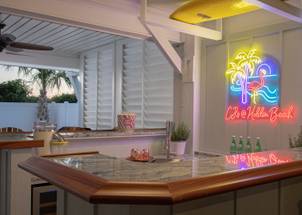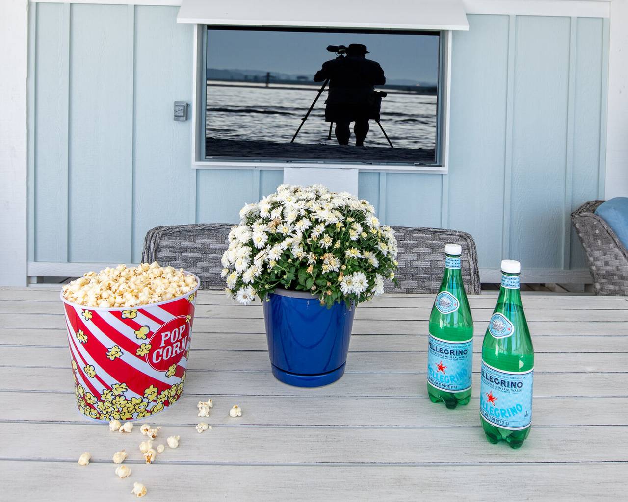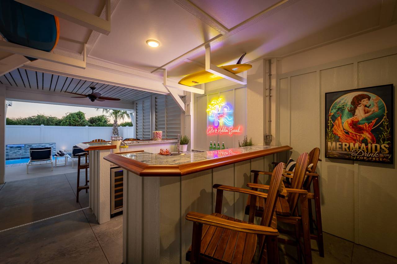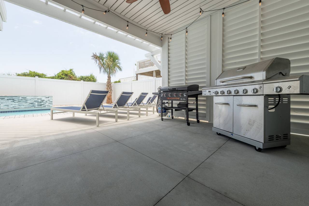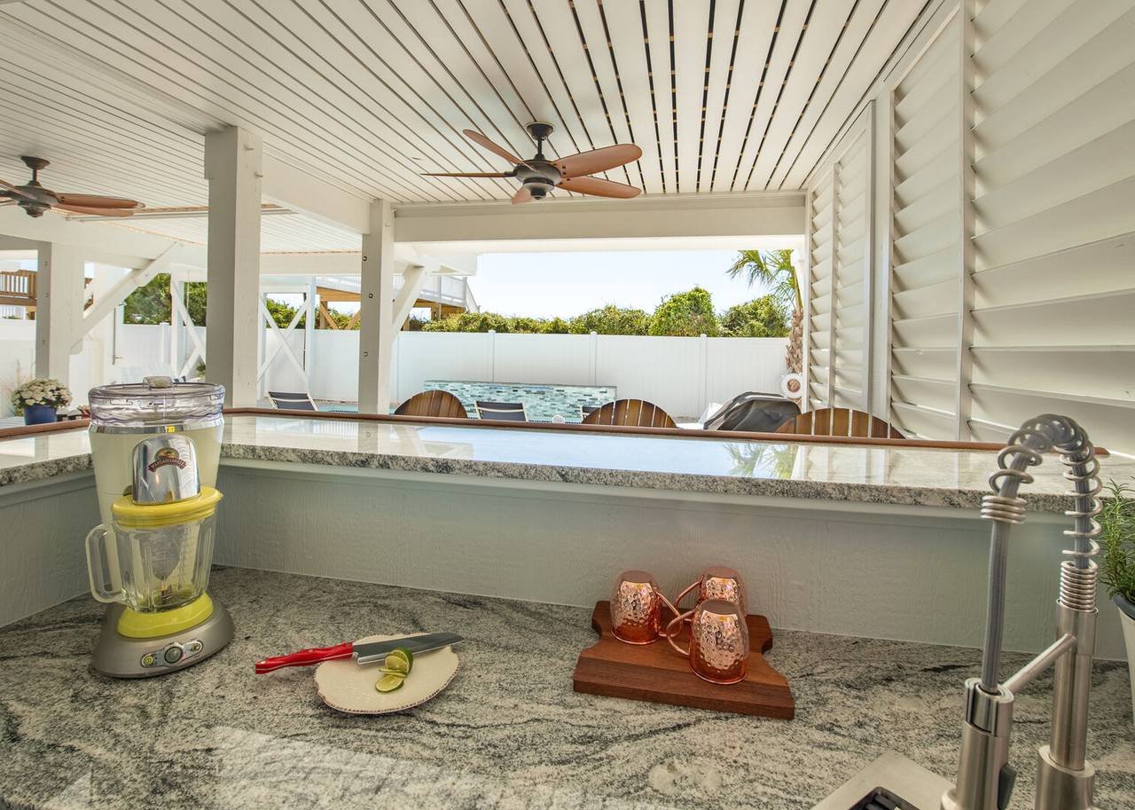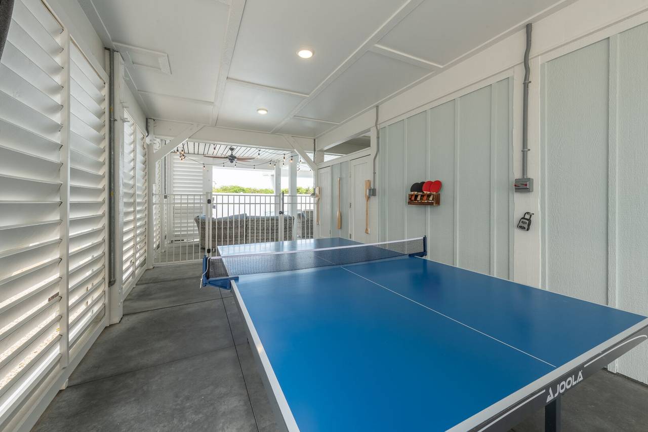Steps from the spectacular pool, CJs @ Holden Beach hosts a full-service dedicated outdoor kitchen and bar complete with a 6-burner gas grill, built-in wine cooler, beverage cooler for 115 drinks, and a high-capacity 35lb ice maker for your favorite refreshments.  Frozen margaritas, daiquiris, anyone? Enjoy the ocean air in the adjacent lounge area with ample, super comfortable seating and the outdoor dining area in front of a 75” smart TV with pre-wired connections for gaming consoles. Perfect for game days or movie nights!   Poolside games include foosball, ping pong, and cornhole.  Private outdoor showers with hot and cold water and ample dressing area are perfect for rinsing off the salt water after a day on the beach or from lounging around this impeccably designed pool.  CJs is Holden Beach’s only complete family entertainment center!