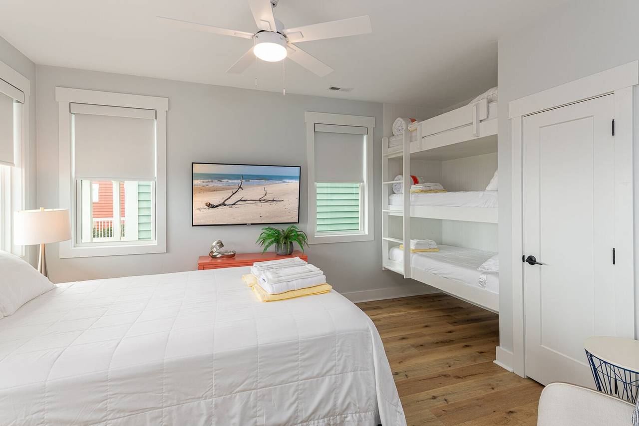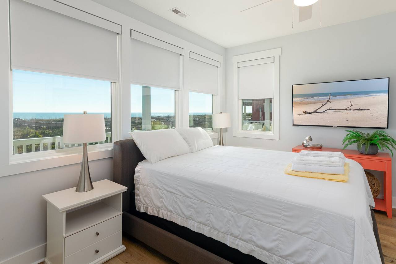 On the first living level, you will find 4 bedrooms, with one of them doubling as a media room. The media room is a multi-functional space offering flexibility based on your needs! The room features a large TV, a set of triple bunk beds (3 twins), and an upgraded Queen bed. This media room shares a hallway bathroom with bedroom #3 and also features 2 sets of triple bunk beds for a total of 6 twins in this room. The primary bedroom also has a zero-entry shower. On the top level, you will be greeted by spectacular ocean views and a large kitchen and dining area. The well-appointed kitchen boasts a gas range, 2 refrigerators, a wall oven, and 2 dishwashers! There is also plenty of seating at the two large dining tables, each seating 8 and 3 at the kitchen bar. No cable, but every TV is smart and you can stream all of your favorite movies and shows!