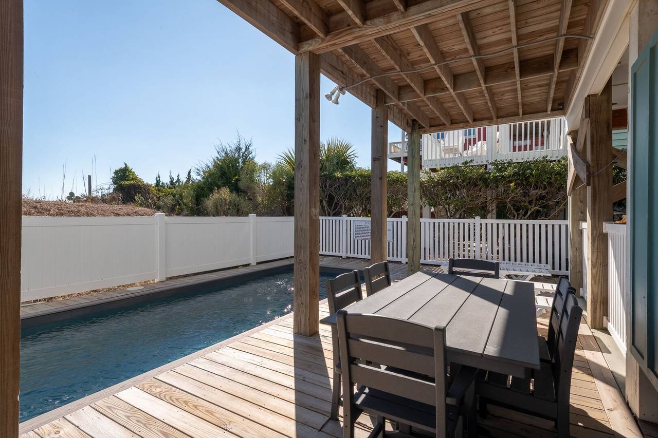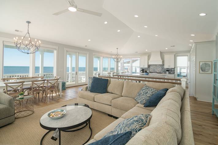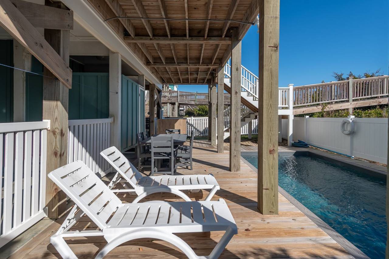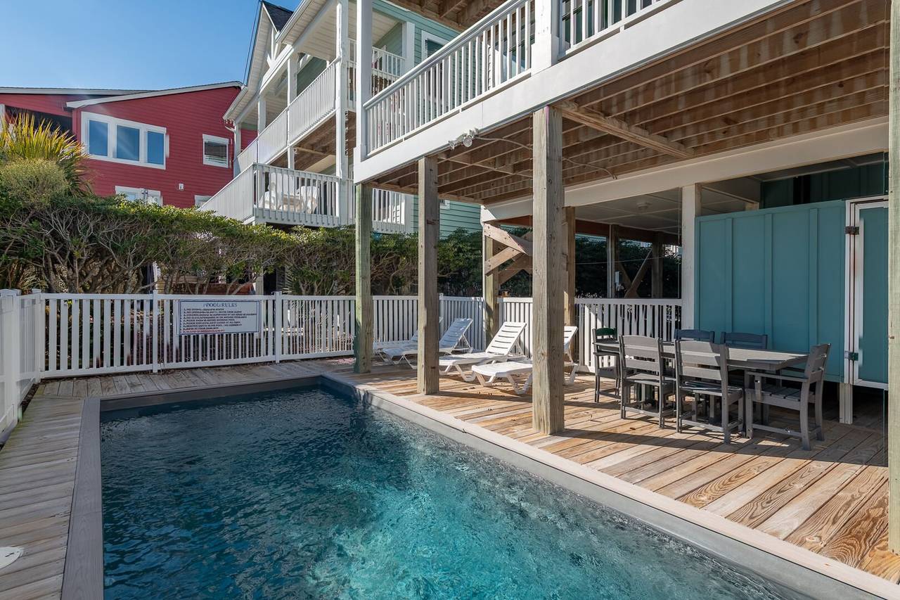 Look no further for the perfect island vacation home! This oceanfront beauty on Holden Beach has everything you need to relax and enjoy the best of the beach! Outside you will find two levels of oceanfront covered decking and a private swimming pool (open from Easter - October)! On the street side, there is also a deck with partial views of gorgeous sunsets over the Intracoastal waterway. Spend your days relaxing around the pool or the beach strand, and then relax on the deck for the perfect island sunset. You will even find an enclosed outdoor shower with hot and cold water! Inside are 6 bedrooms, 5.5 bathrooms, and space for your whole party! The inverted floor plan helps maximize the amazing ocean views. 2025- Brand new boardwalk to the beach makes your commute to the beach strand an absolute breeze!