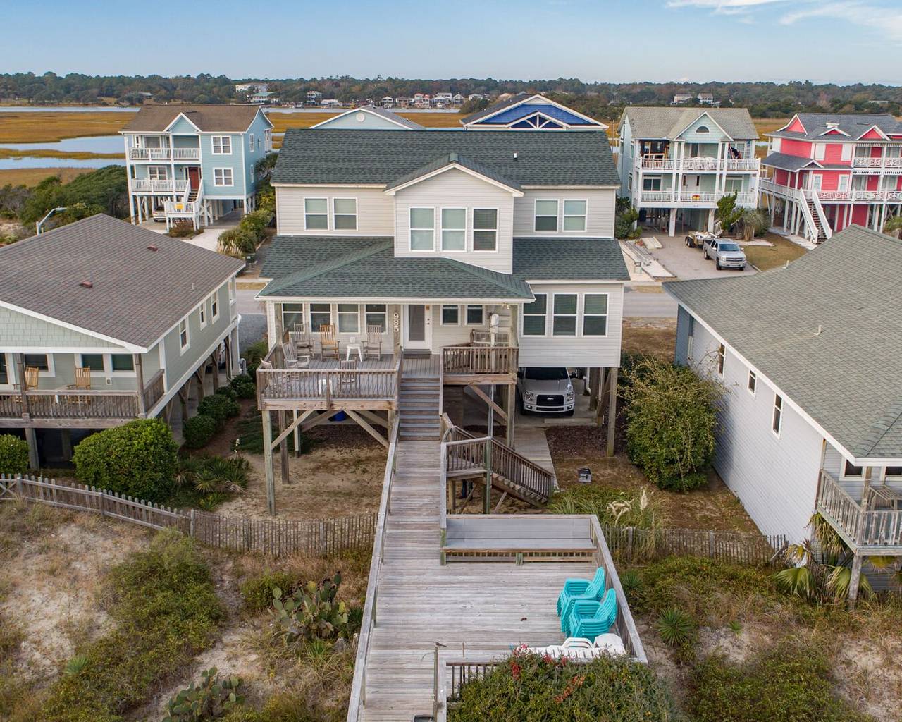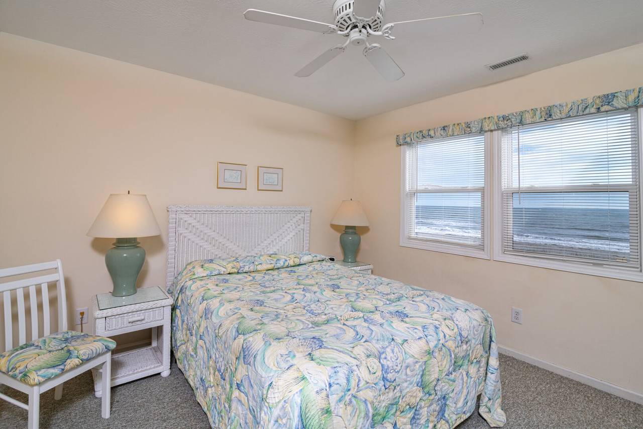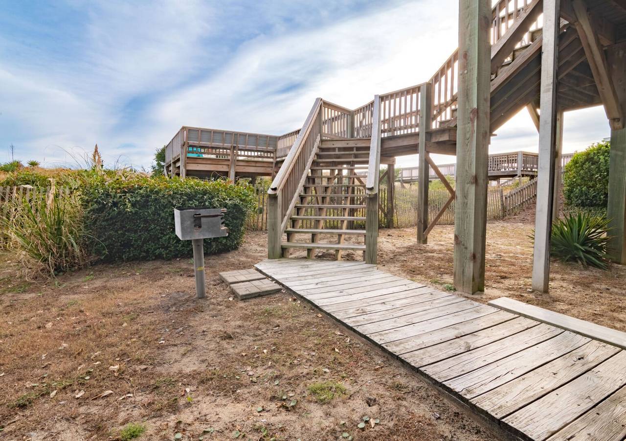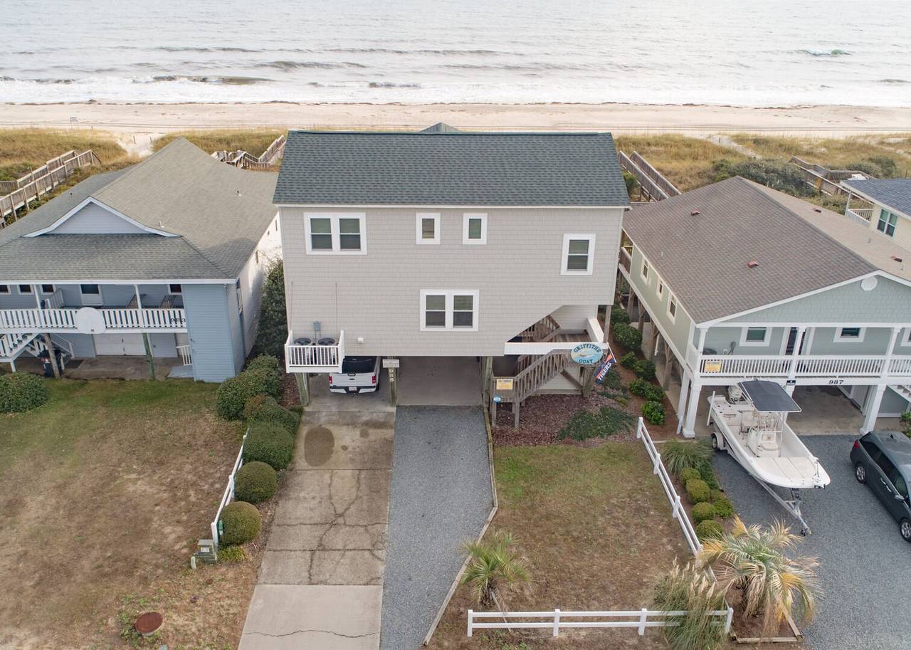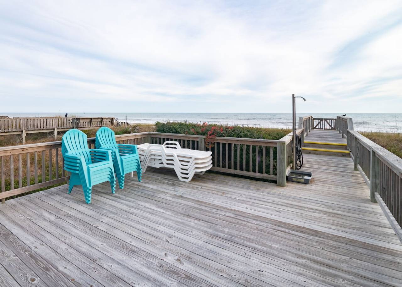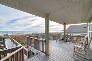 Your Holden Beach getaway begins when you land at Griffith's Quay! Relax on the covered oceanside porch or soak up some rays on the sundeck nestled in the dunes. This lovely oceanfront home (1K,4Q) has two living areas, a wet bar, an eat-in kitchen with a Keurig K-Duo, and slow cooker, a dining room, and four bedrooms. High chair and pack-n-play included with a child safety gate on the ocean side porch going to the boardwalk. Wireless high-speed internet access is provided. Outdoor amenities include a park-style charcoal grill and an enclosed outdoor shower.Â