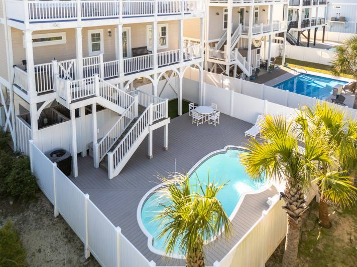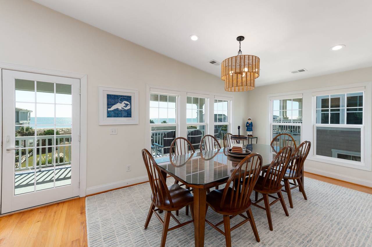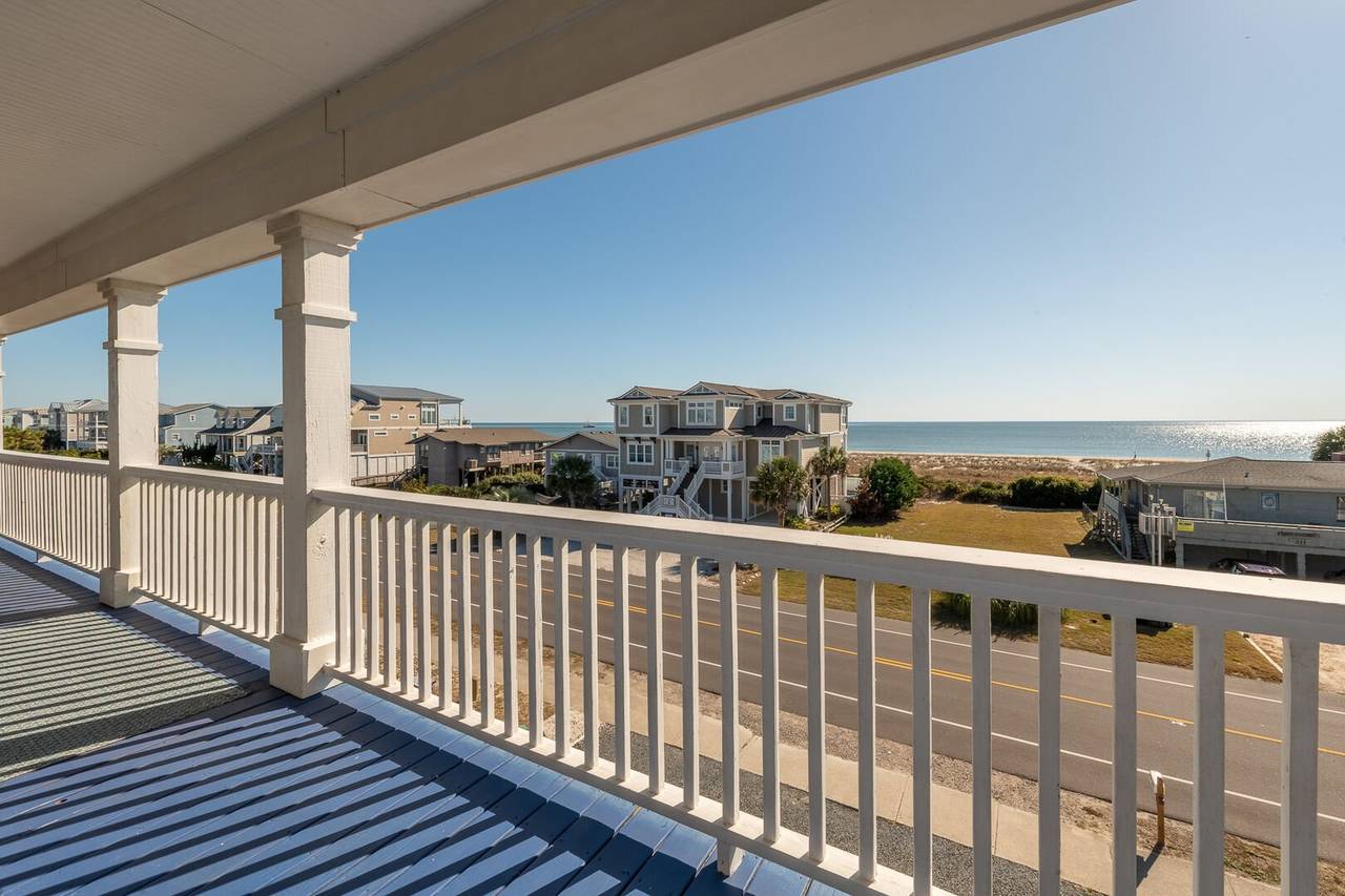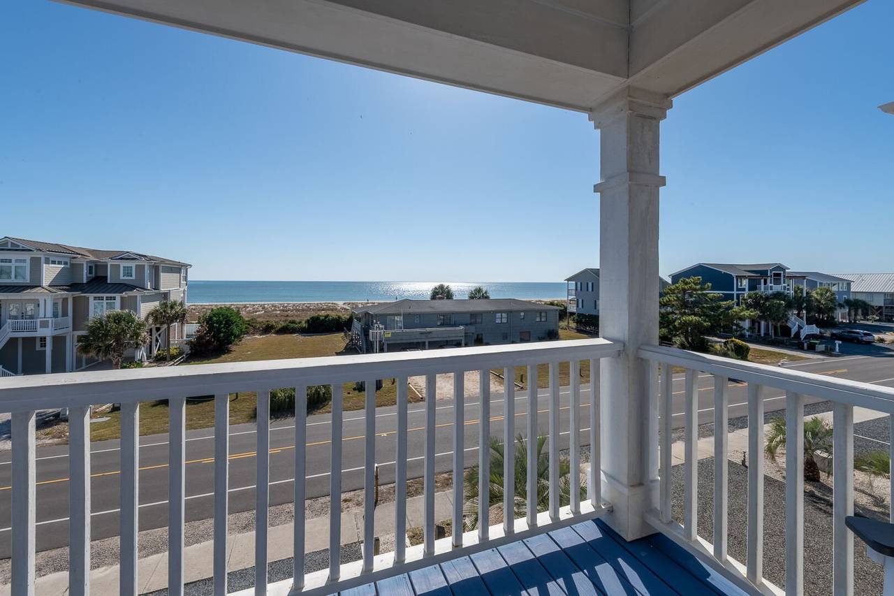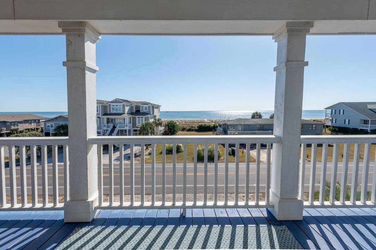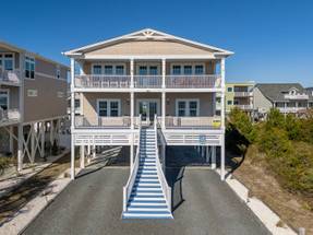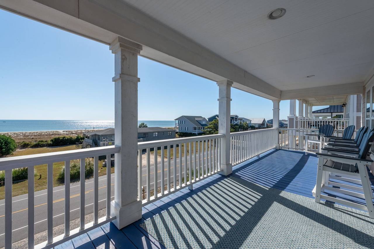 Are you looking for a perfect getaway to enjoy the sun, sand, and sea? Look no further than this stunning 2nd row beach home with expansive ocean views! You do not want to miss this immaculate coastal retreat with all the bells and whistles! This home features an inverted floor plan with 5 bedrooms, 5 bathrooms, and breathtaking ocean views from the Great Room and spacious front decks. Elevated finishing throughout with nicely appointed furniture, hardwood floors and granite countertops. The upper level has a fully equipped kitchen with a gas 5 burner cooktop, a spacious island and a 42” stainless steel refrigerator. There is plenty of seating in the Dining Room for your whole party to dine together or dine al fresco at the teak table on the covered front porch! The spacious living room is perfect for relaxing with a movie or your favorite show on the smart flat-screen TV. In the rear of the house, you will find two bedrooms with private bathrooms, smart TVs, and walk-in closets. There is also an uncovered deck overlooking the pool and perfect for viewing the sunset or stargazing!