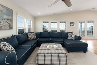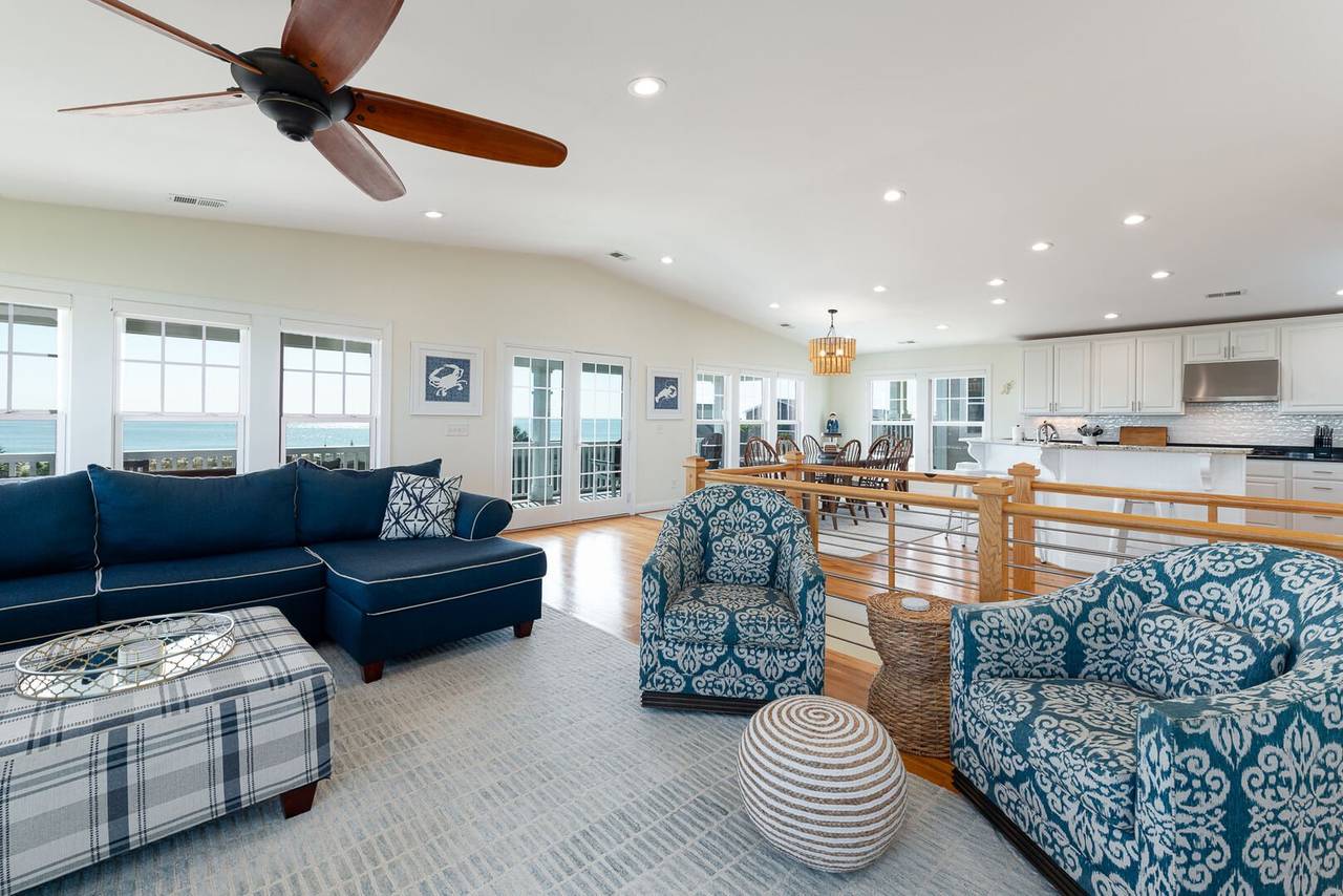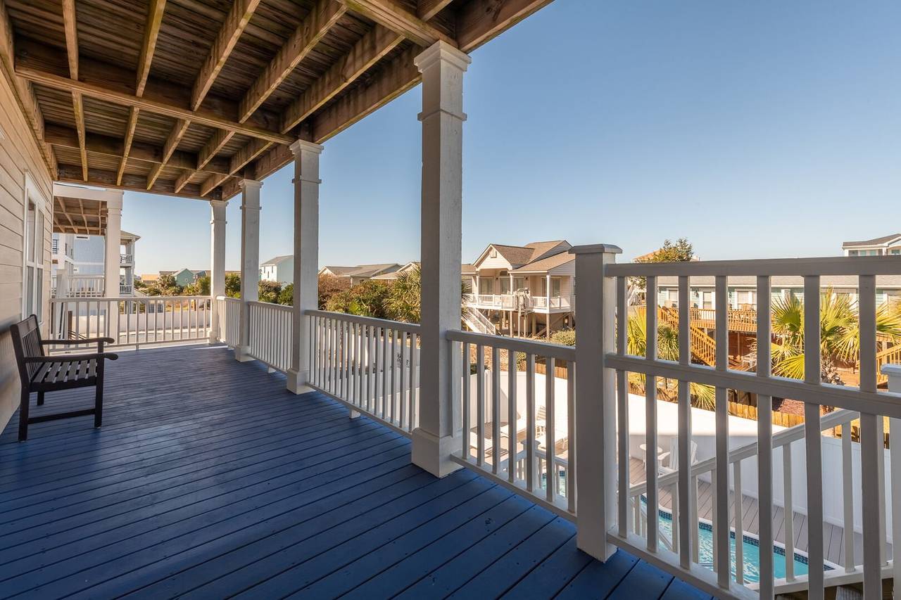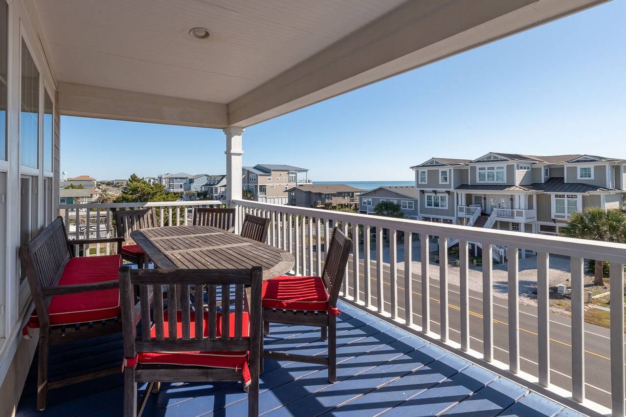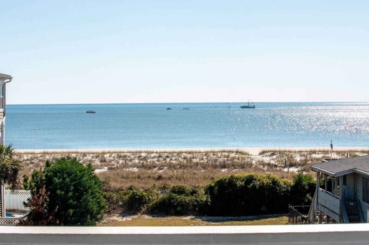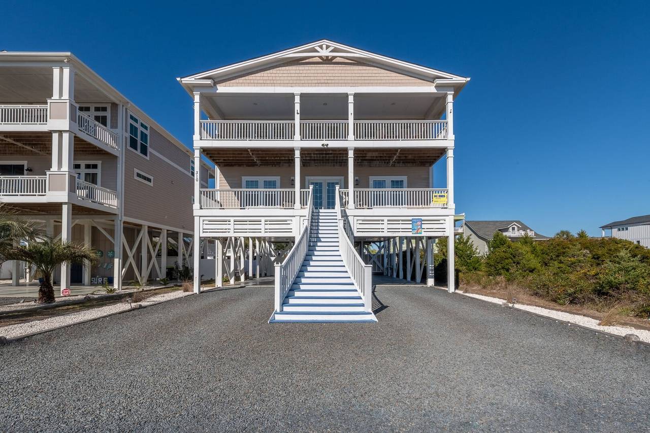 Are you looking for a perfect getaway to enjoy the sun, sand, and sea? Look no further than this stunning 2nd row beach home with expansive ocean views! You do not want to miss this immaculate coastal retreat with all the bells and whistles! This home features an inverted floor plan with 5 bedrooms, 5 bathrooms, and breathtaking ocean views from the Great Room and spacious front decks. Elevated finishing throughout with nicely appointed furniture, hardwood floors and granite countertops. The upper level has a fully equipped kitchen with a gas 5 burner cooktop, a spacious island and a 42” stainless steel refrigerator. There is plenty of seating in the Dining Room for your whole party to dine together or dine al fresco at the teak table on the covered front porch! The spacious living room is perfect for relaxing with a movie or your favorite show on the smart flat-screen TV. In the rear of the house, you will find two bedrooms with private bathrooms, smart TVs, and walk-in closets. There is also an uncovered deck overlooking the pool and perfect for viewing the sunset or stargazing!