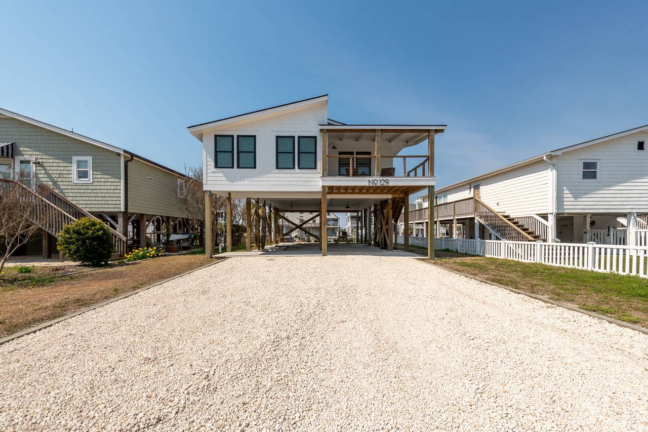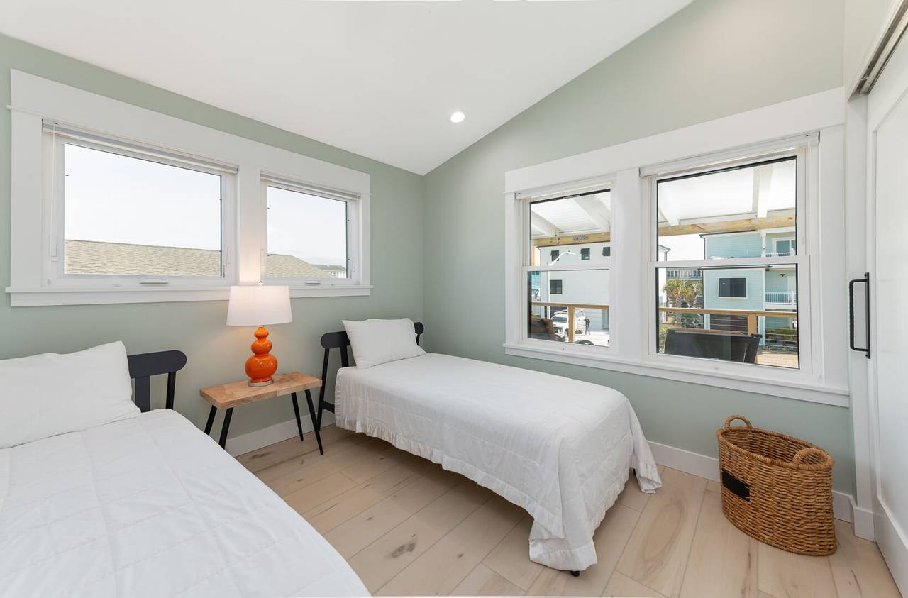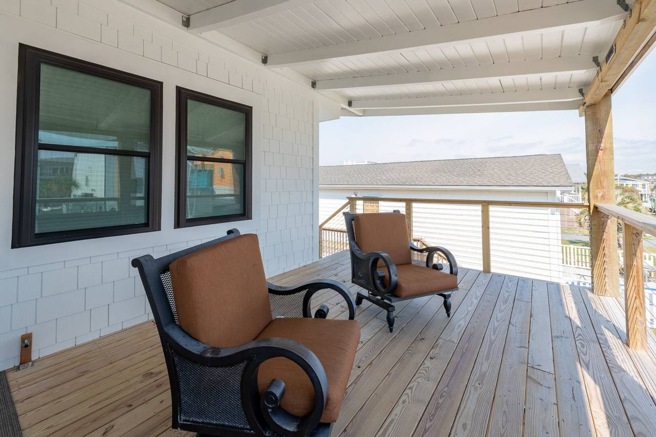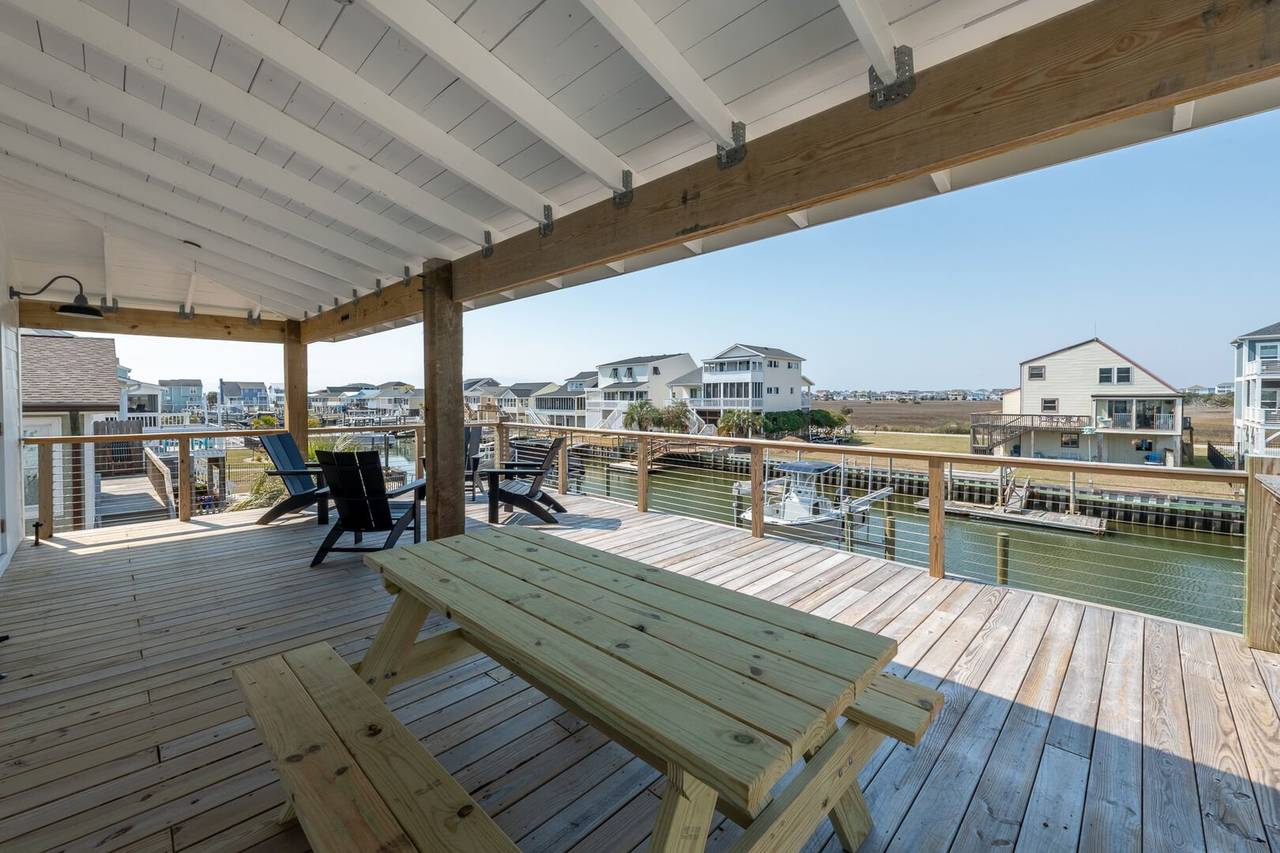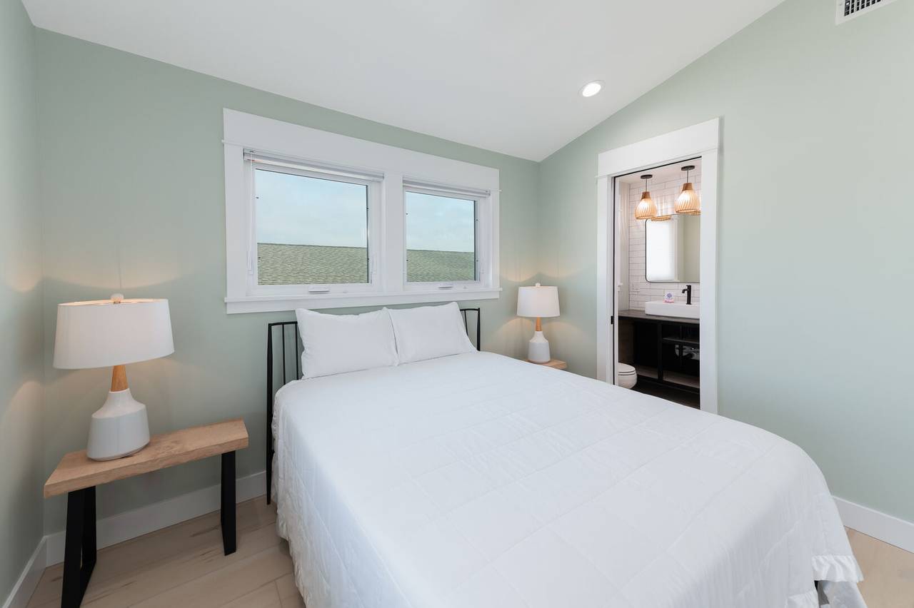 The first bedroom offers two twin beds and a private bathroom with a tiled shower, while the second bedroom boasts a cozy queen bed and its own en-suite bathroom. The spacious living room, with its large TV and cozy sectional sofa, is perfect for winding down, while the sunroom offers an extra seating area to enjoy the natural light that pours in through the windows. The kitchen is a dream for any home chef with sleek new appliances, an electric range, and seating for five at the two kitchen islands. The home also features a stacked washer and dryer for your convenience. Step outside to the large back deck, which overlooks the canal, perfect for relaxing or entertaining. The front deck is covered, offering a shaded spot to enjoy the island neighborhood views. With its updated decor, coastal modern finishes, and close public beach access, this vacation home is the perfect choice for your next Holden Beach getaway.