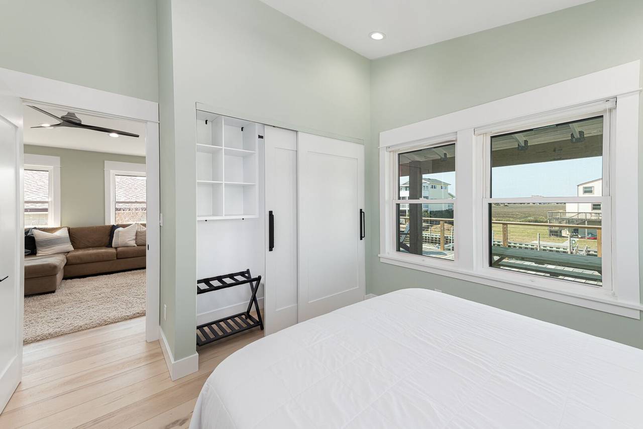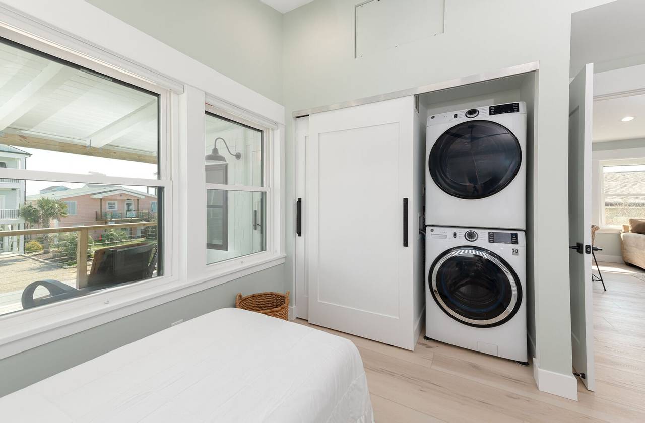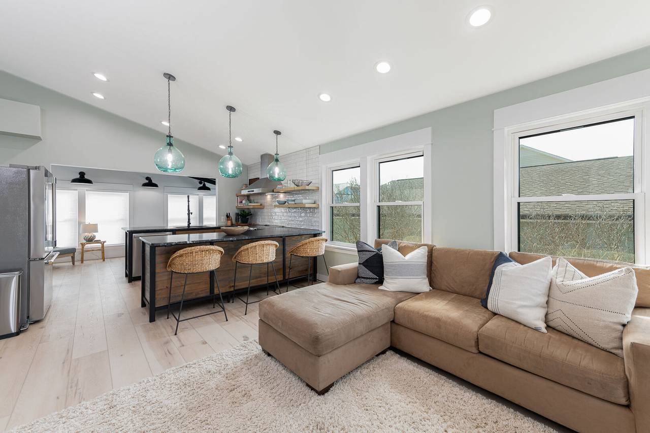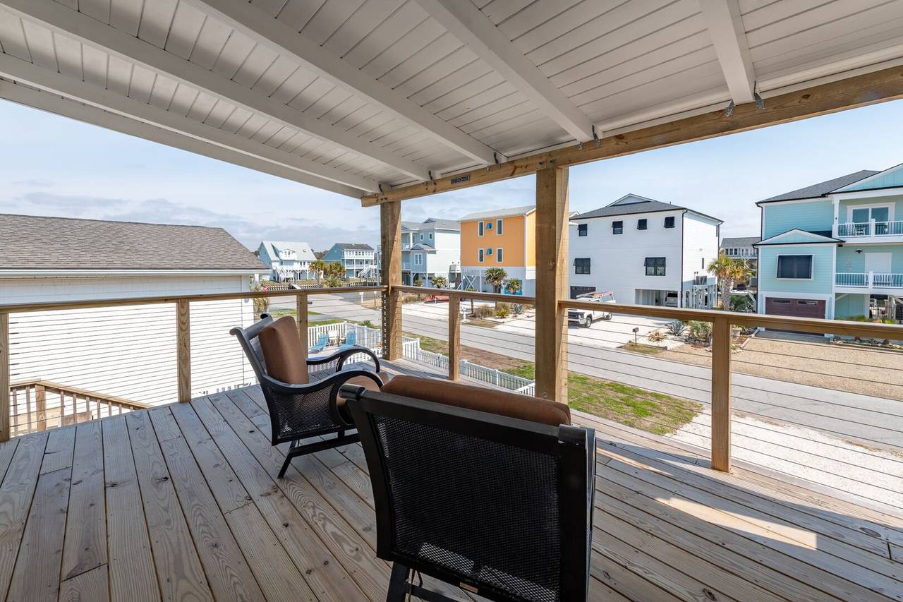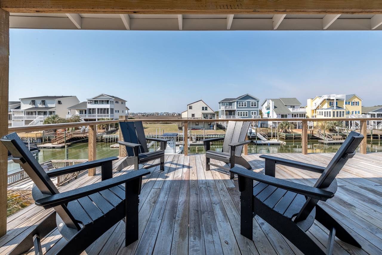 The first bedroom offers two twin beds and a private bathroom with a tiled shower, while the second bedroom boasts a cozy queen bed and its own en-suite bathroom. The spacious living room, with its large TV and cozy sectional sofa, is perfect for winding down, while the sunroom offers an extra seating area to enjoy the natural light that pours in through the windows. The kitchen is a dream for any home chef with sleek new appliances, an electric range, and seating for five at the two kitchen islands. The home also features a stacked washer and dryer for your convenience. Step outside to the large back deck, which overlooks the canal, perfect for relaxing or entertaining. The front deck is covered, offering a shaded spot to enjoy the island neighborhood views. With its updated decor, coastal modern finishes, and close public beach access, this vacation home is the perfect choice for your next Holden Beach getaway.