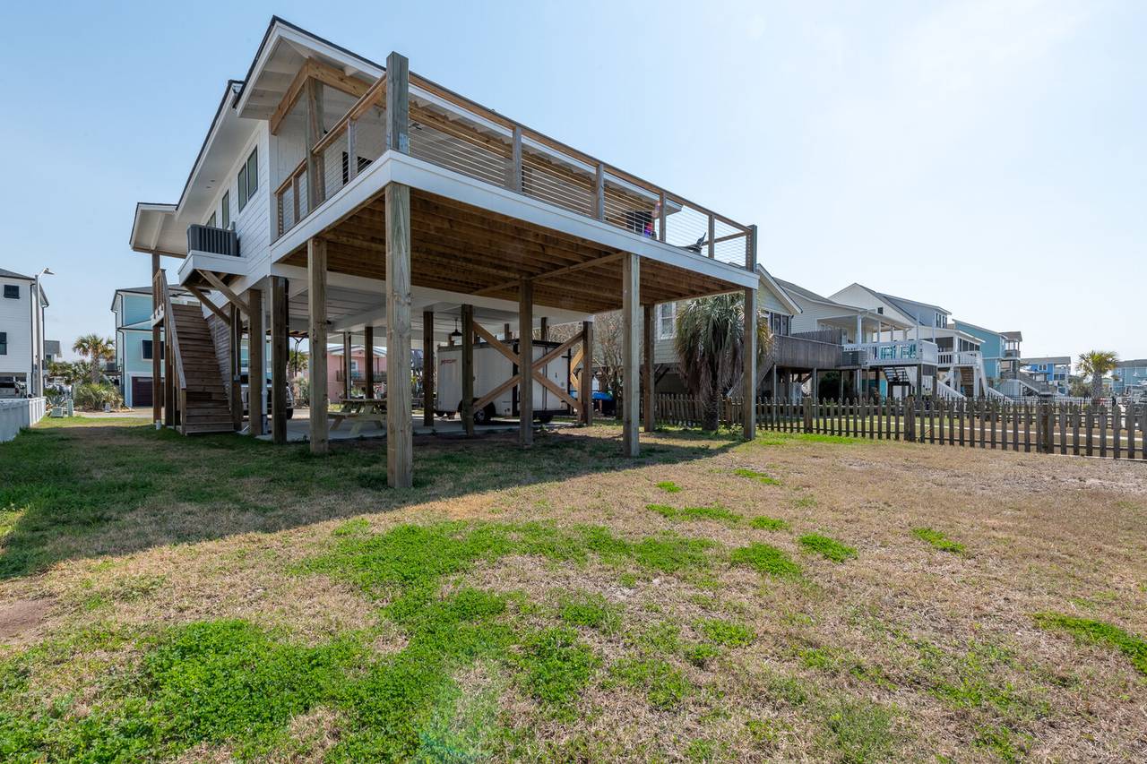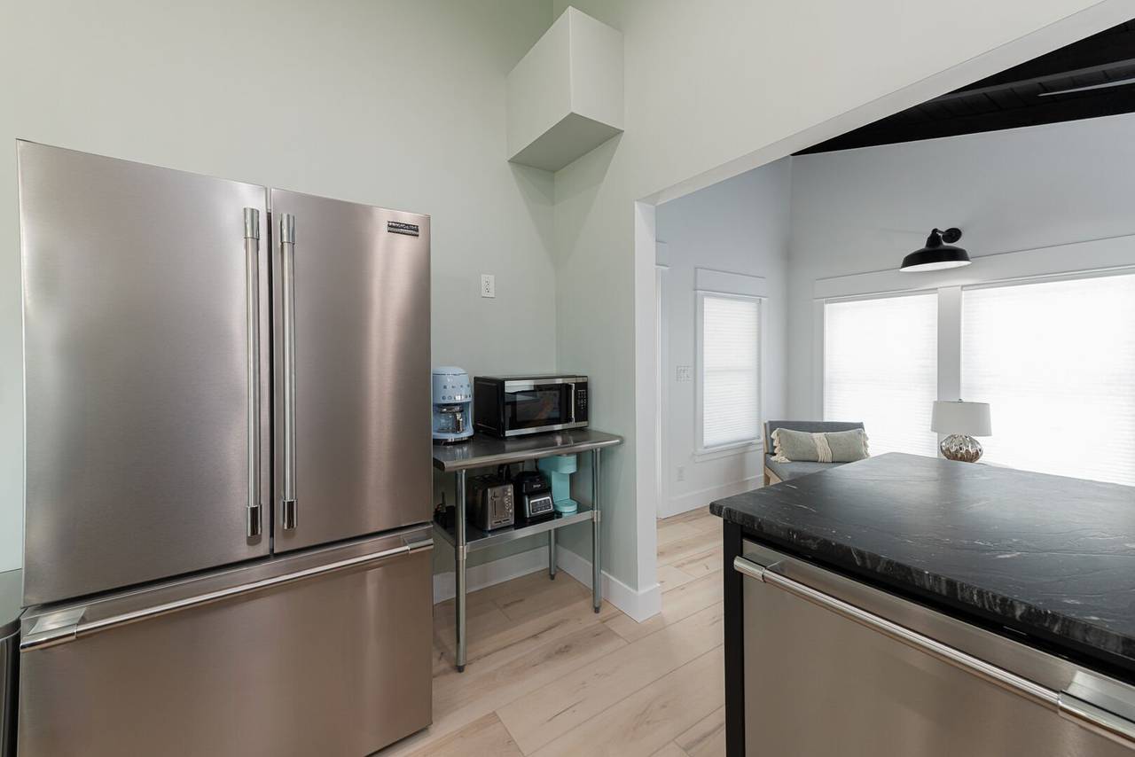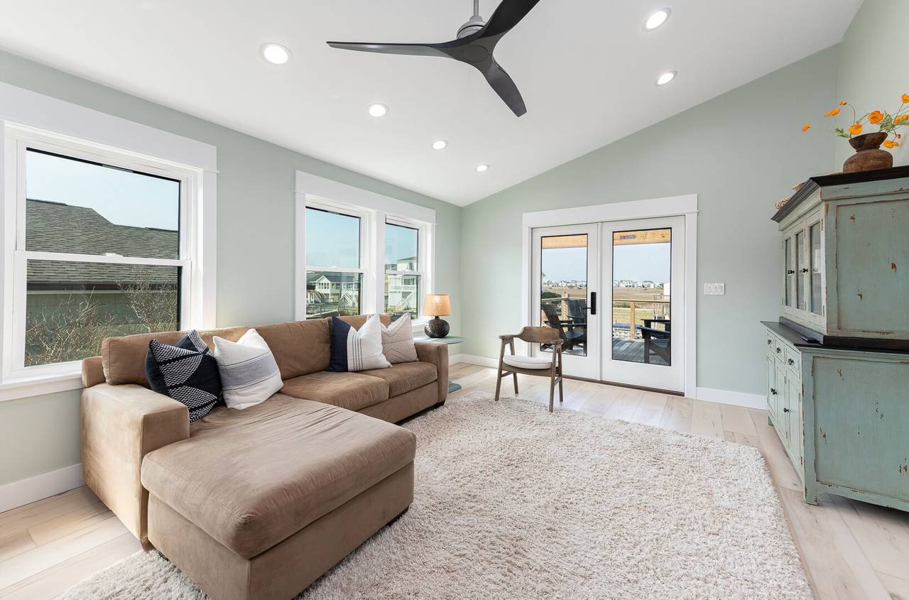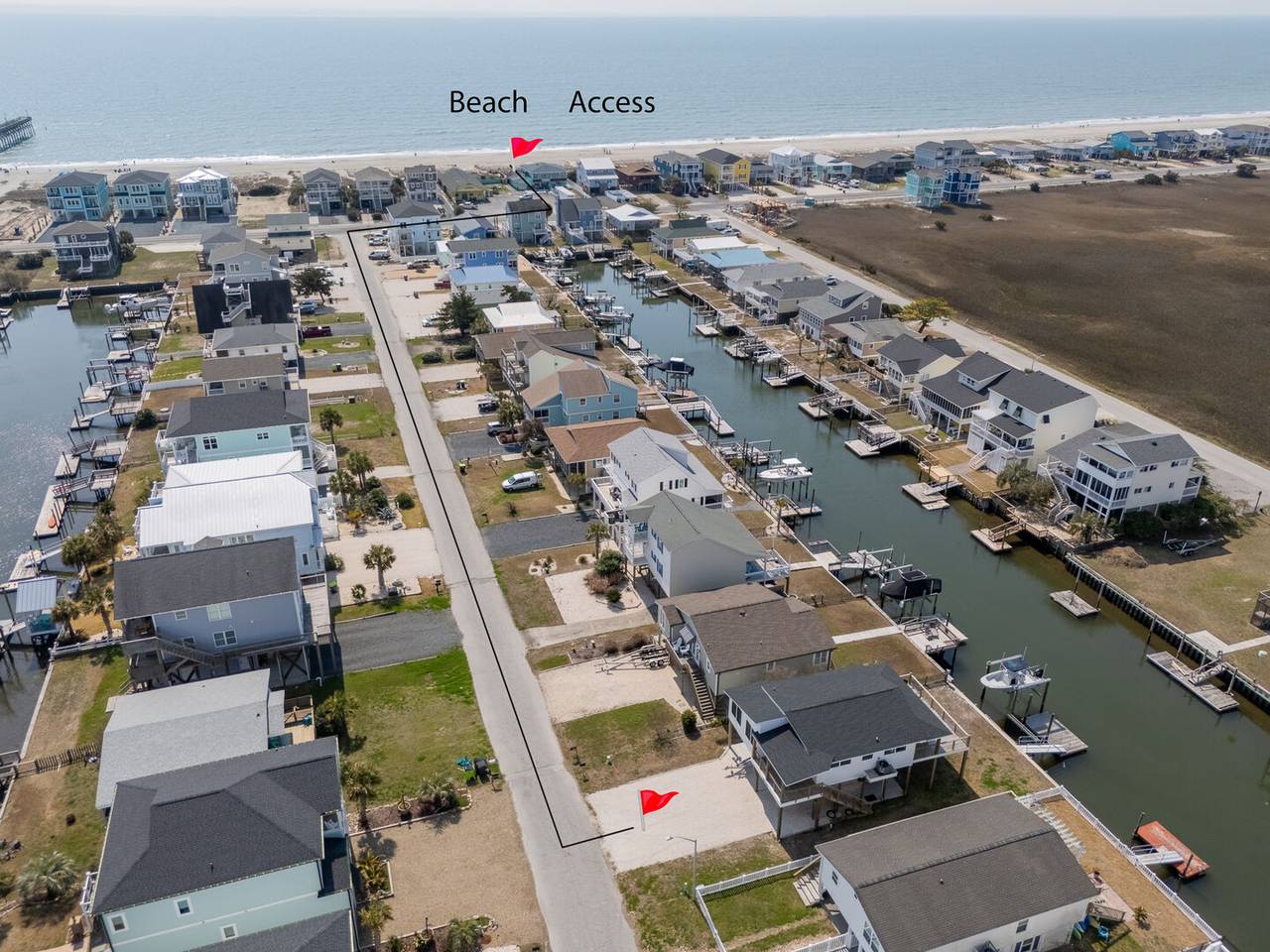 The first bedroom offers two twin beds and a private bathroom with a tiled shower, while the second bedroom boasts a cozy queen bed and its own en-suite bathroom. The spacious living room, with its large TV and cozy sectional sofa, is perfect for winding down, while the sunroom offers an extra seating area to enjoy the natural light that pours in through the windows. The kitchen is a dream for any home chef with sleek new appliances, an electric range, and seating for five at the two kitchen islands. The home also features a stacked washer and dryer for your convenience. Step outside to the large back deck, which overlooks the canal, perfect for relaxing or entertaining. The front deck is covered, offering a shaded spot to enjoy the island neighborhood views. With its updated decor, coastal modern finishes, and close public beach access, this vacation home is the perfect choice for your next Holden Beach getaway.