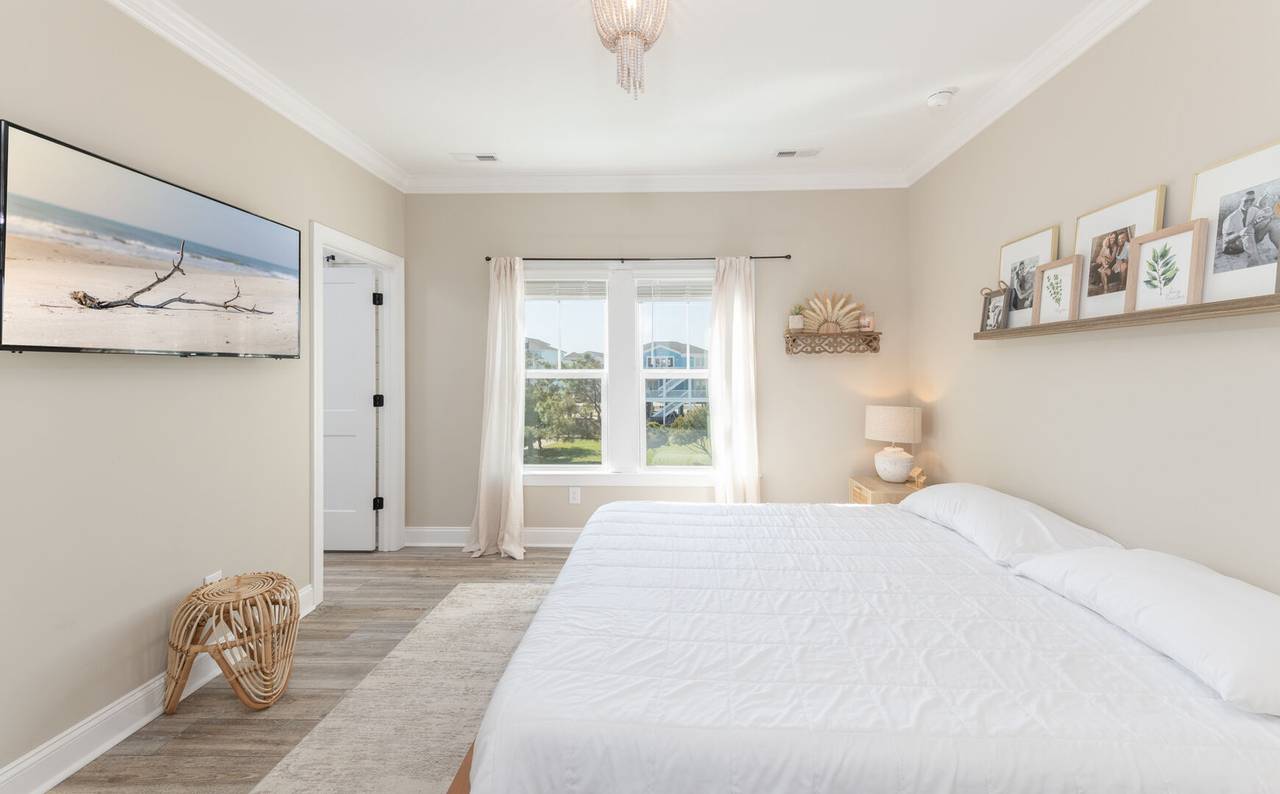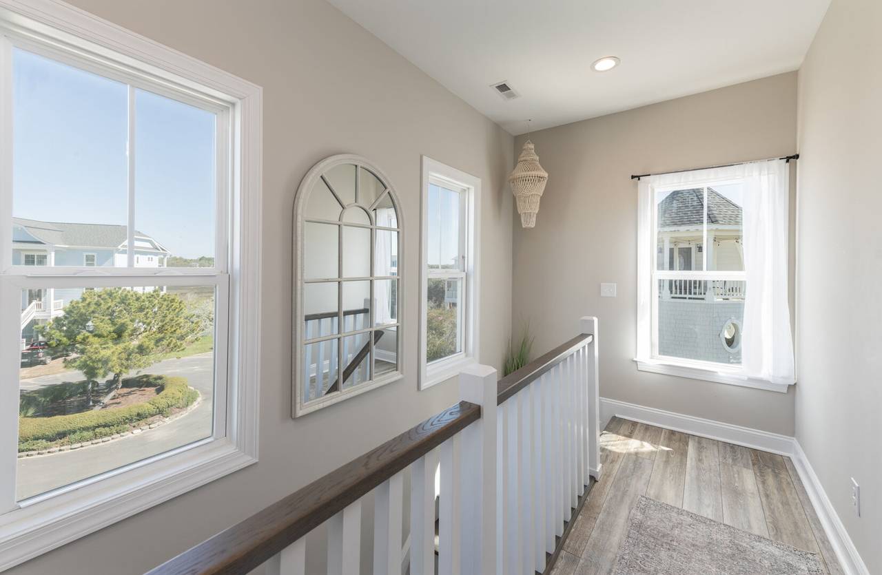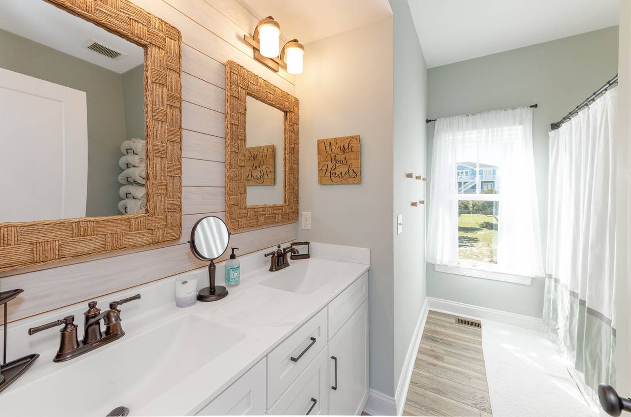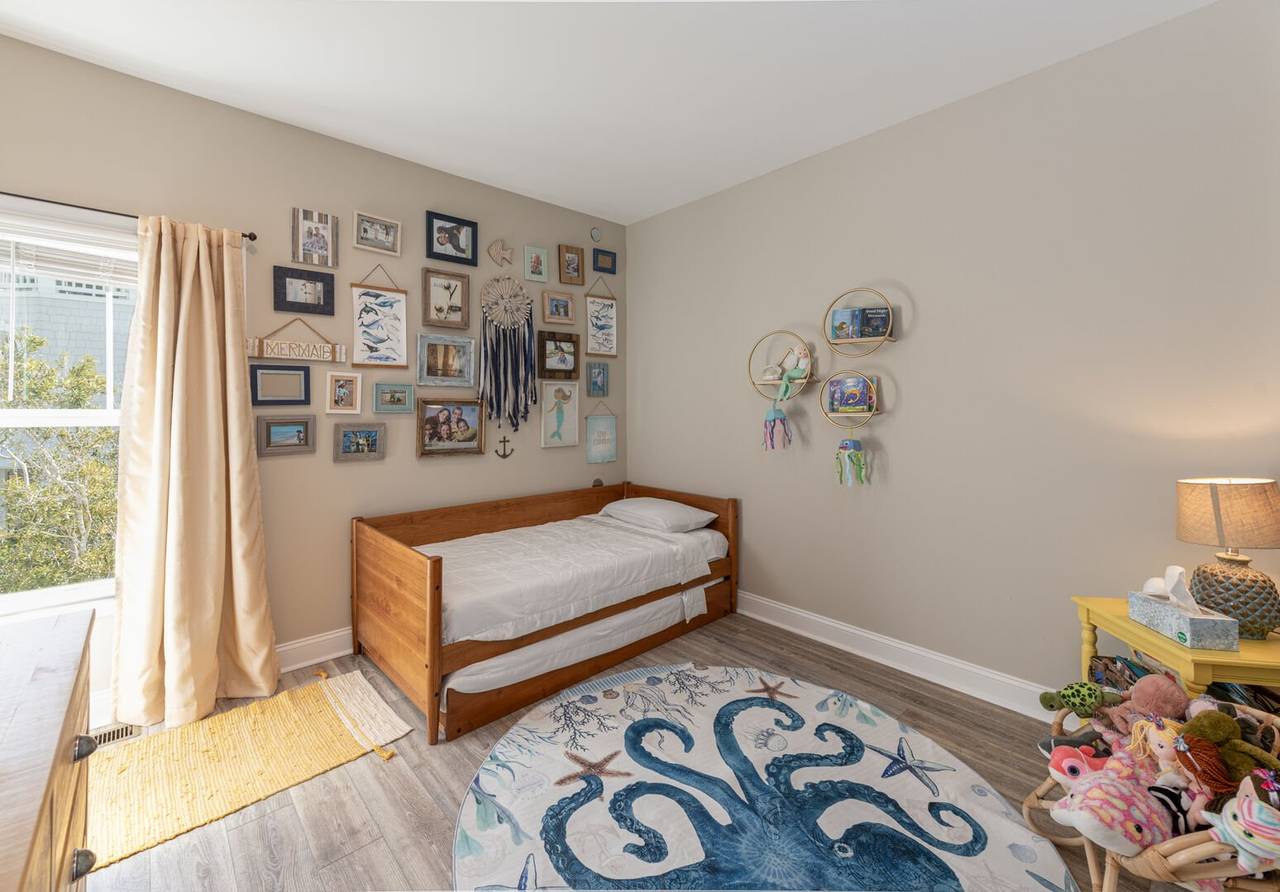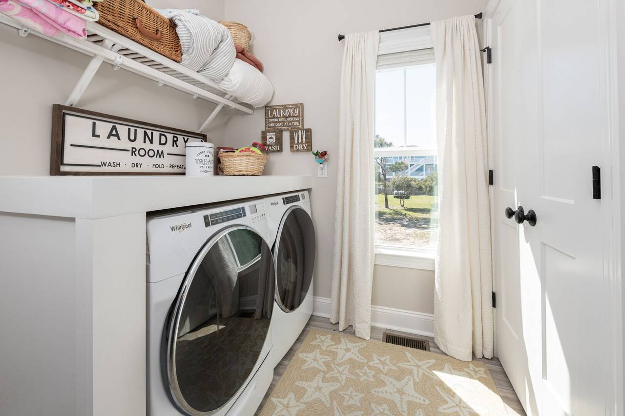 Inside, there are 4 bedrooms and 2.5 bathrooms. On the first level there are 3 cozy bedrooms and 2 have deck access. They share a large hall bathroom with double sinks and a shower tub combo. There is also a den area with a TV from streaming your favorite movies and shows. Upstairs, you will find the primary bedroom with a spacious bathroom, walk in shower and double sinks. There is a half bathroom for convenience right off of the upstairs common area. This area boasts amazing natural light and coastal chic decor. Please note: guests will have not access to bedroom closets as they are locked but there are drawers for your personal belongings in each room.