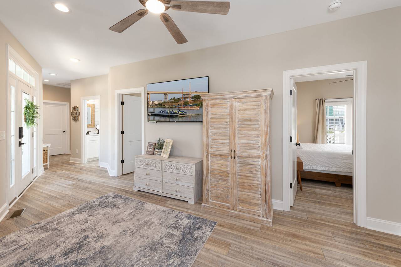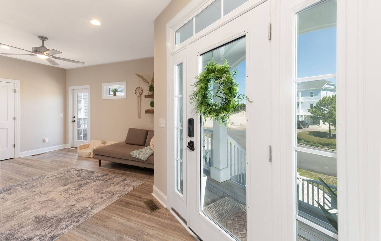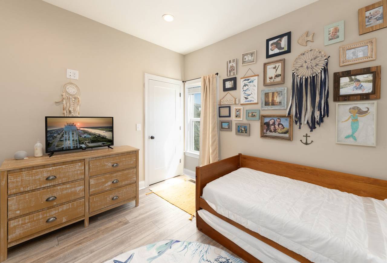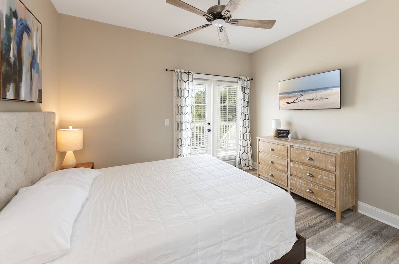 Inside, there are 4 bedrooms and 2.5 bathrooms. On the first level there are 3 cozy bedrooms and 2 have deck access. They share a large hall bathroom with double sinks and a shower tub combo. There is also a den area with a TV from streaming your favorite movies and shows. Upstairs, you will find the primary bedroom with a spacious bathroom, walk in shower and double sinks. There is a half bathroom for convenience right off of the upstairs common area. This area boasts amazing natural light and coastal chic decor. Please note: guests will have not access to bedroom closets as they are locked but there are drawers for your personal belongings in each room.