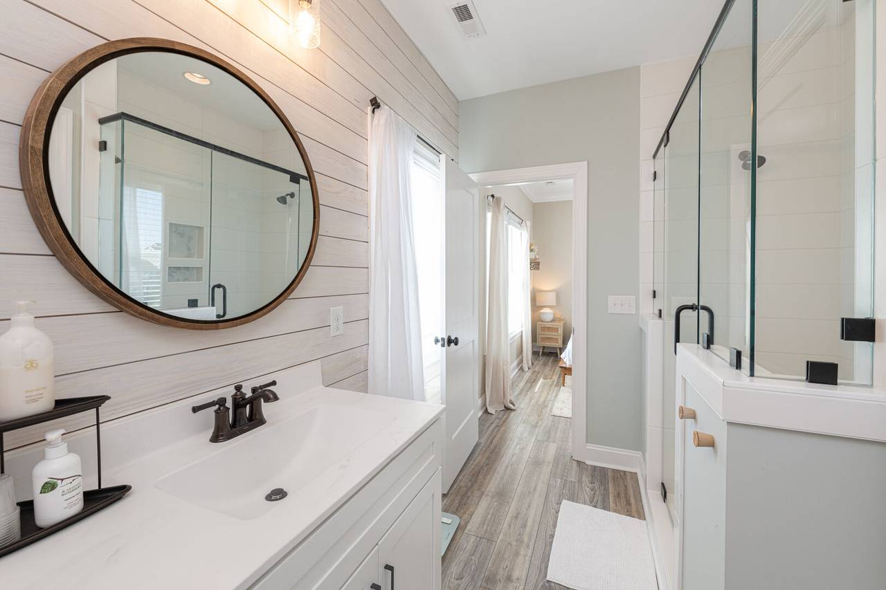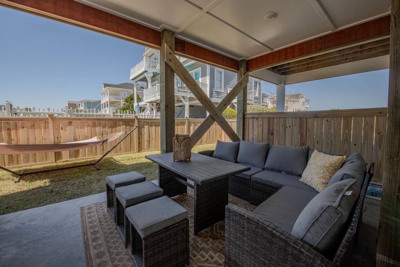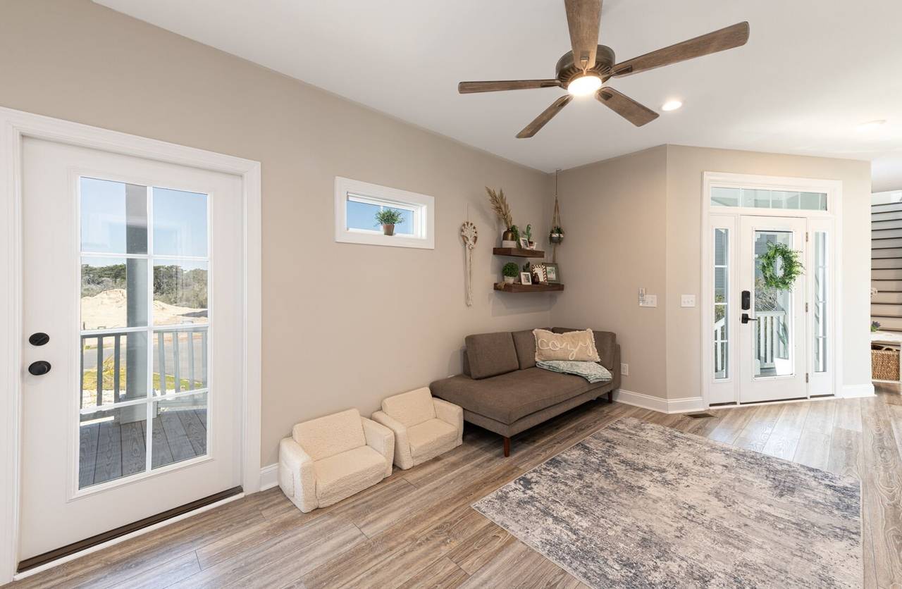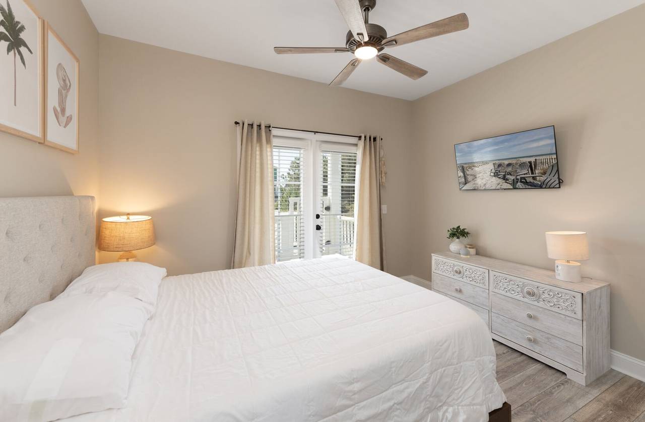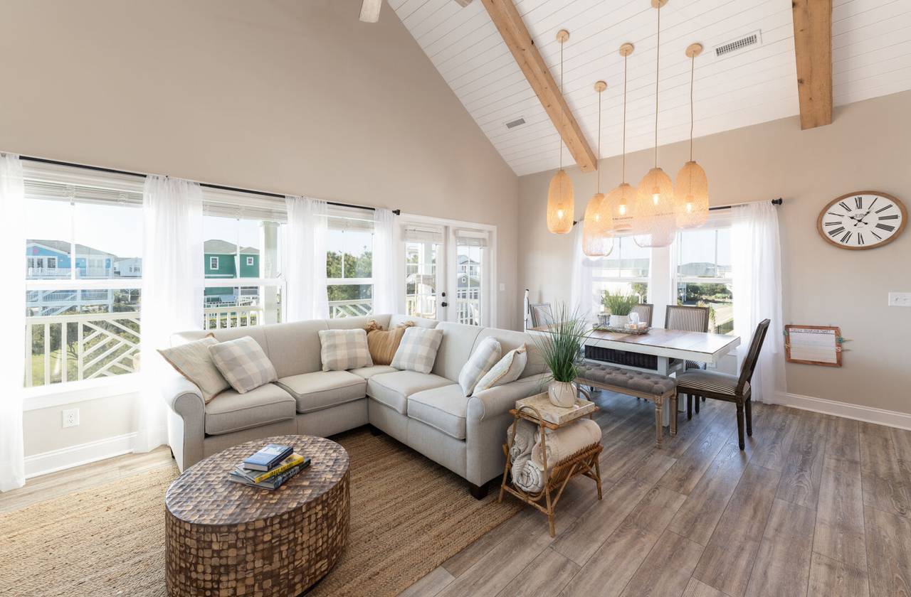 Inside, there are 4 bedrooms and 2.5 bathrooms. On the first level there are 3 cozy bedrooms and 2 have deck access. They share a large hall bathroom with double sinks and a shower tub combo. There is also a den area with a TV from streaming your favorite movies and shows. Upstairs, you will find the primary bedroom with a spacious bathroom, walk in shower and double sinks. There is a half bathroom for convenience right off of the upstairs common area. This area boasts amazing natural light and coastal chic decor. Please note: guests will have not access to bedroom closets as they are locked but there are drawers for your personal belongings in each room.