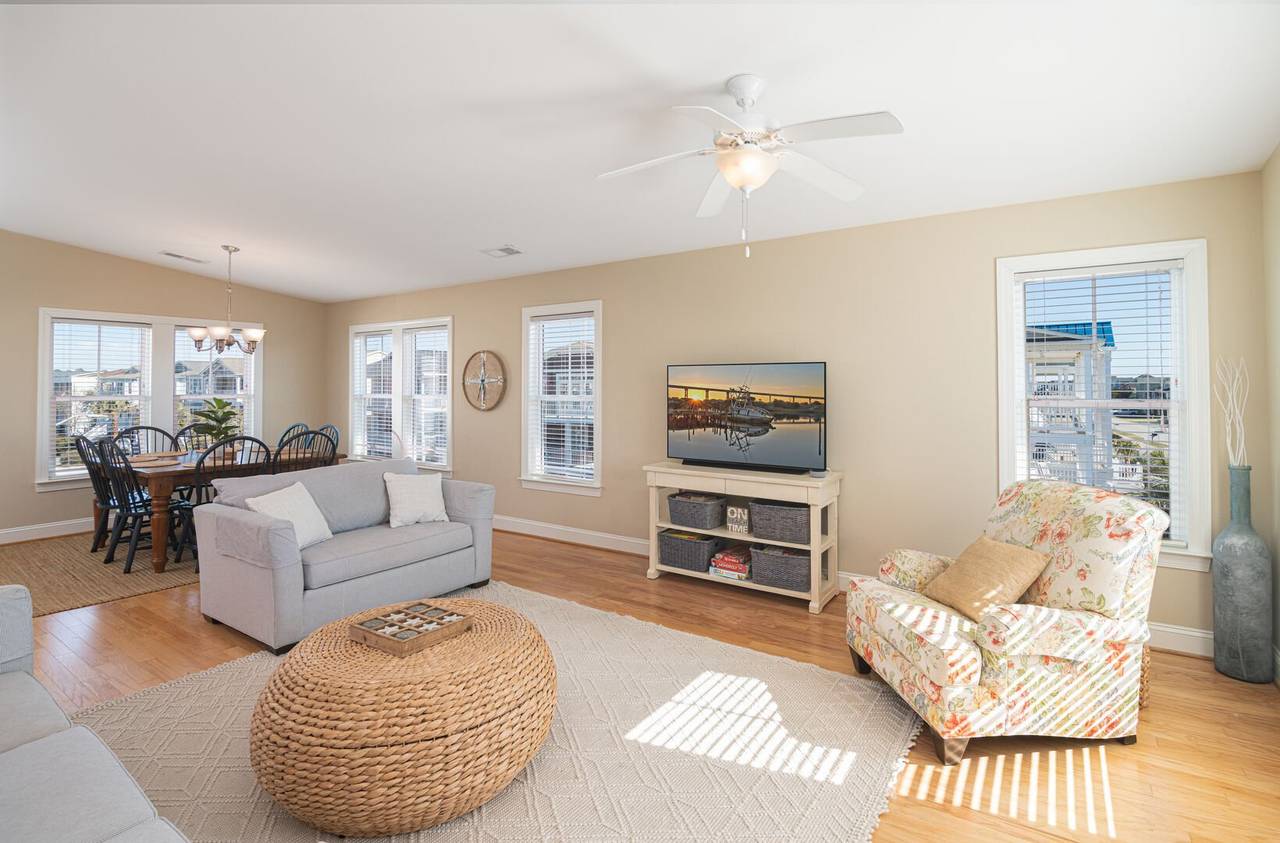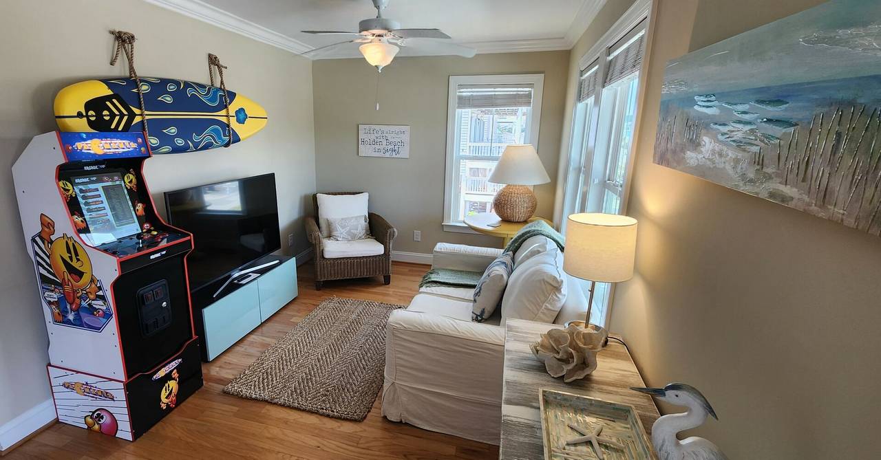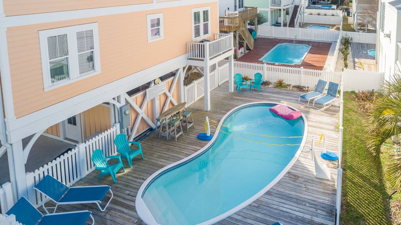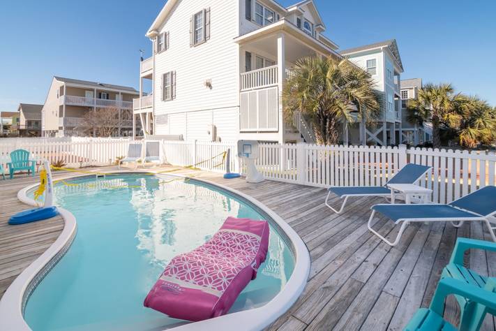 This wonderful island home has it all! From the spacious private pool area to the inverted floor plan to maximize ocean views, this is the perfect spot for your next vacation! Not only can you enjoy splashing in the pool (open from Easter - October) or lounging on the pool deck, but the beach access is directly across the street and so convenient!  There is also a community ICW day dock and pier to explore the Intracoastal Waterway and the interesting wildlife. The inverted floor plan is perfect for maximizing those island views, and the deep covered decks on the street side are great for relaxing, dining, and taking in the salt air and ocean breezes! On the first living level, you will find one of two primary bedrooms, two bedrooms adjoined by a jack-and-jill bathroom, and a separate media space to relax and watch your favorite shows. There is even a Pac-Man/Galaga arcade game to enjoy!