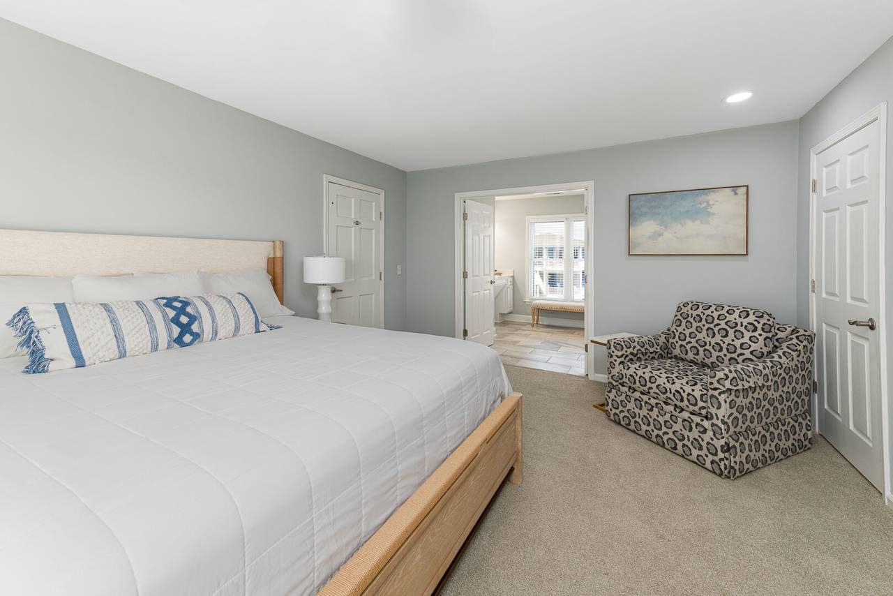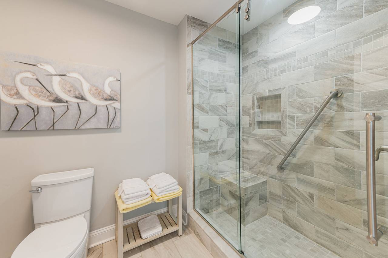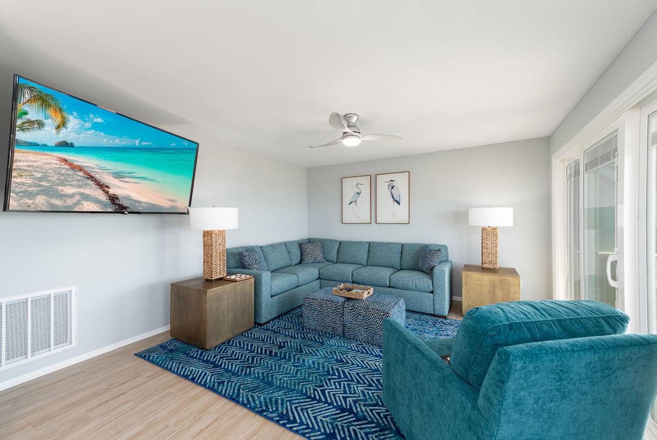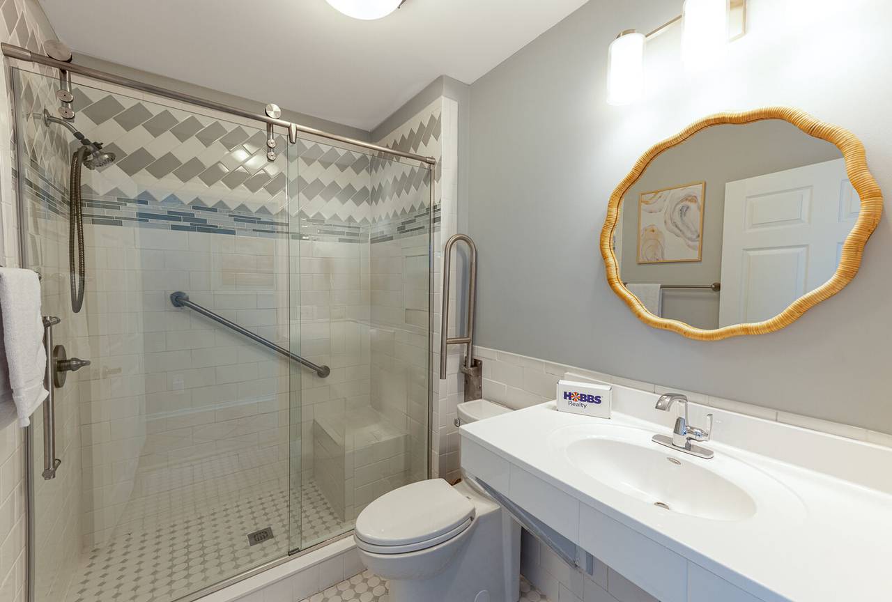 On this first level, you’ll find an inviting oceanfront living room featuring large windows that bring the outside in, providing panoramic views of the beach. Relax on the sectional sofa, which is ideal for cozy movie nights or catching up with loved ones. The living room opens up to the dining area and fully equipped kitchen, where you can gather around the table for 6 or enjoy a casual meal at the kitchen bar. A full hallway bathroom is conveniently located next to the first bedroom, complete with a shower and grab bars for ease of use.