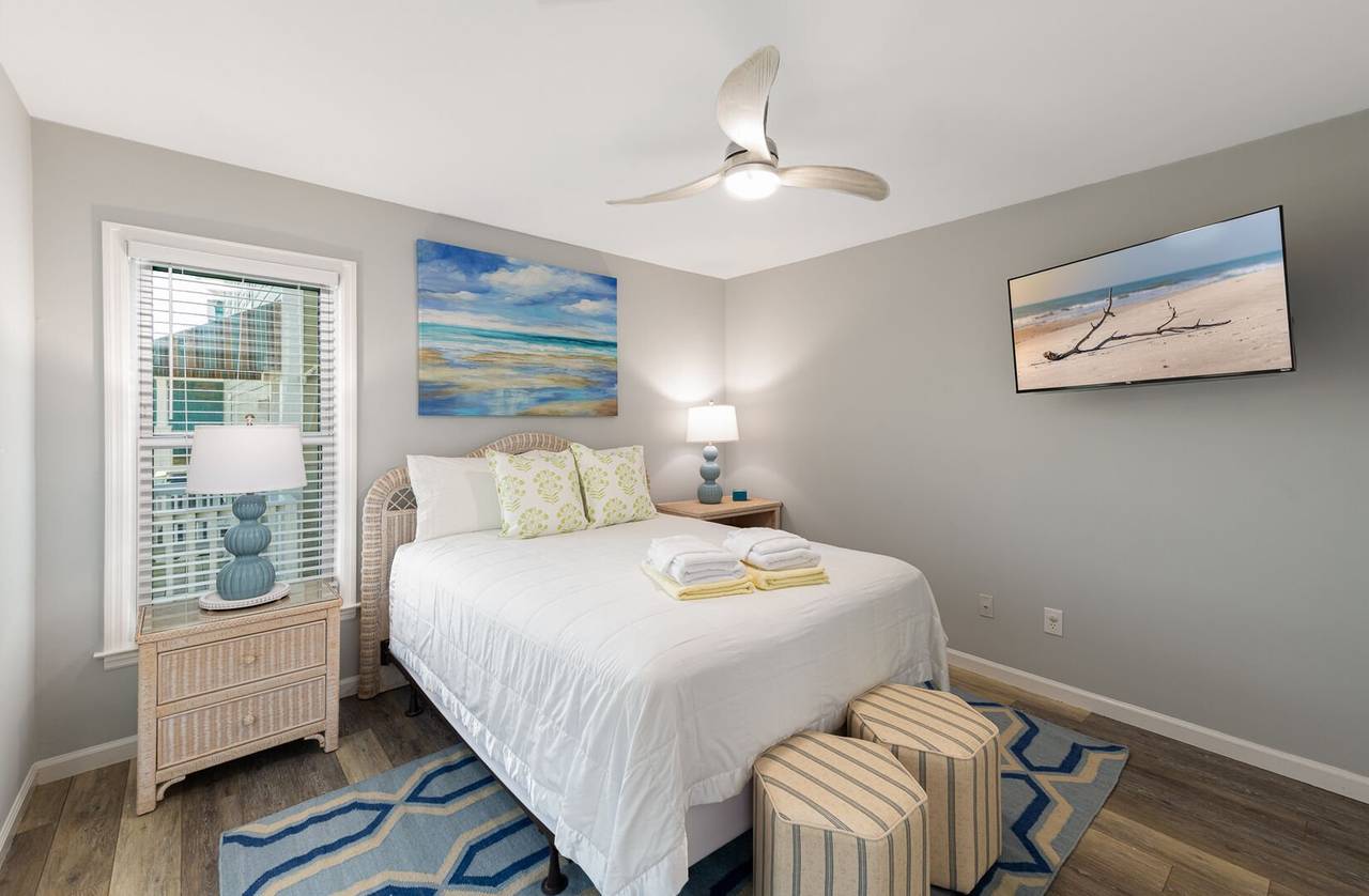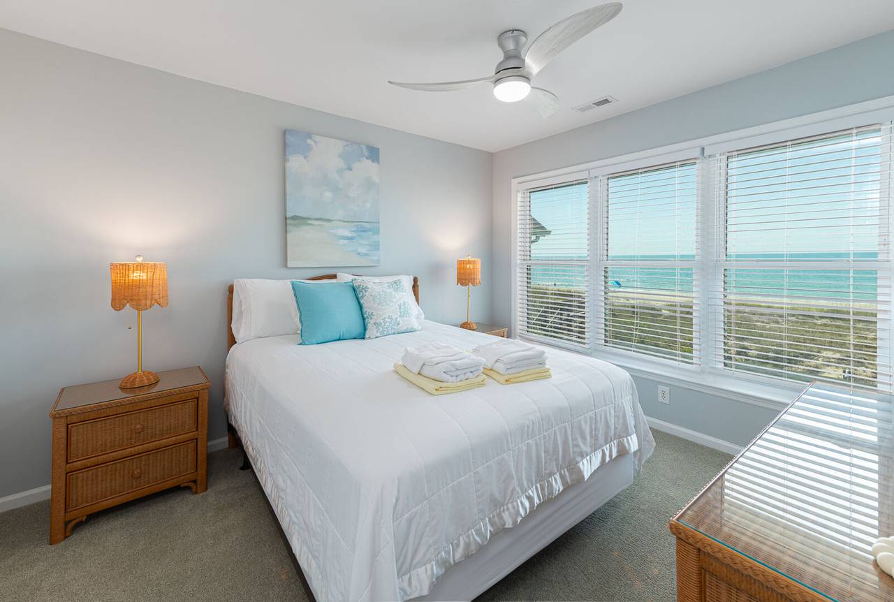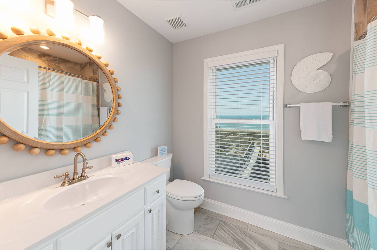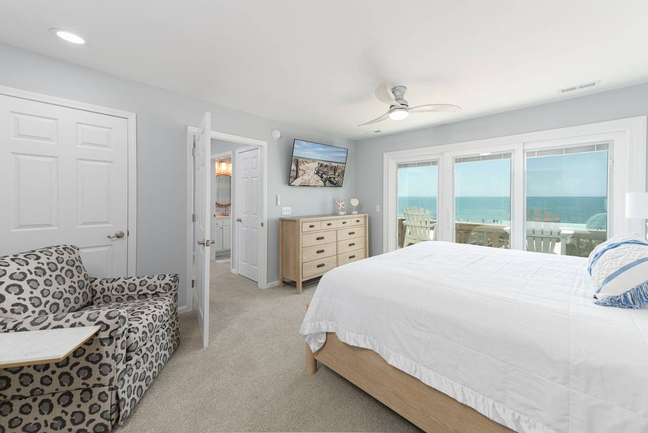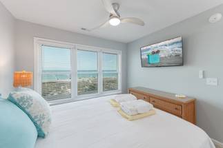 The second level features 3 more bedrooms and 2 bathrooms, including a spacious master suite with its own private bathroom and stunning ocean views. Step out directly onto the oceanfront deck to catch a beautiful sunrise or sunset - right from the comfort of your bedroom. The master bathroom offers a tile shower and plenty of space for privacy. The other two bedrooms share a hallway bathroom with a shower/tub combo, making it ideal for all ages. All bedrooms are equipped with smart TVs for entertainment, ensuring everyone can relax in style.