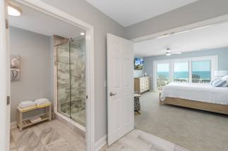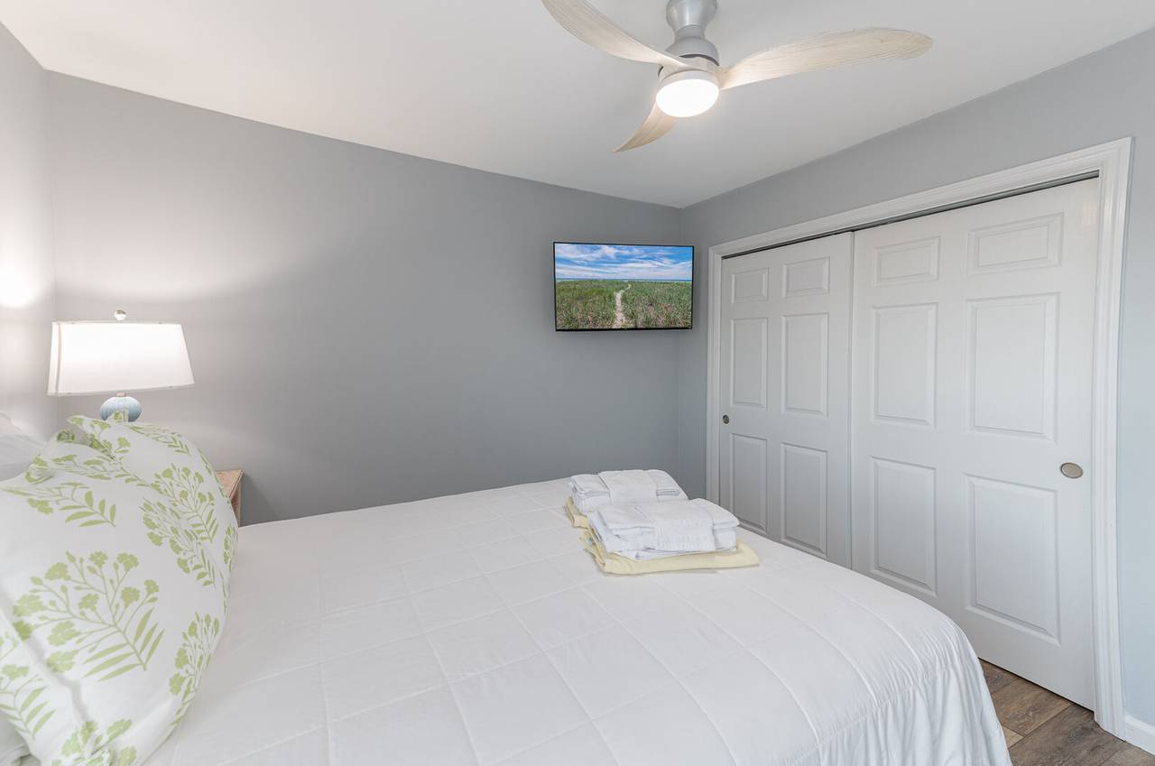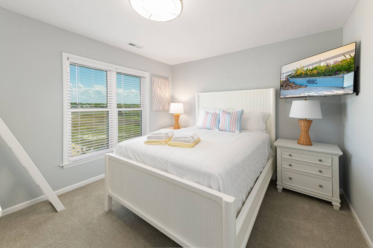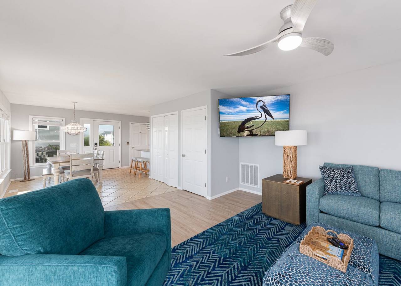 The second level features 3 more bedrooms and 2 bathrooms, including a spacious master suite with its own private bathroom and stunning ocean views. Step out directly onto the oceanfront deck to catch a beautiful sunrise or sunset - right from the comfort of your bedroom. The master bathroom offers a tile shower and plenty of space for privacy. The other two bedrooms share a hallway bathroom with a shower/tub combo, making it ideal for all ages. All bedrooms are equipped with smart TVs for entertainment, ensuring everyone can relax in style.