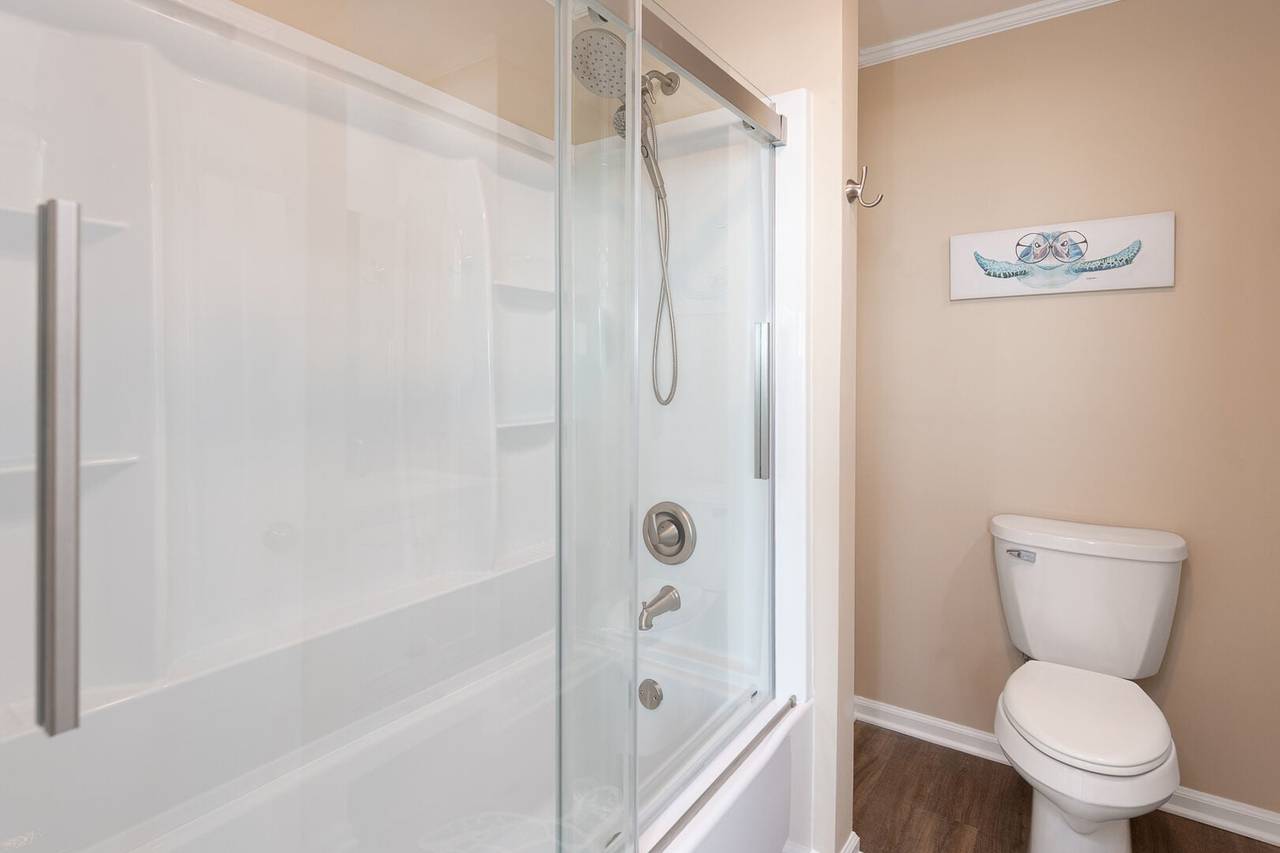 bathroom that includes an oversized frameless tile shower and a double shower head. The updated and fully equipped kitchen is a perfect place to create your culinary delights. Other amenities include a large flat-screen TV in the great room, wireless internet, a TV in each bedroom, an enclosed 2-car garage, a gas grill, and an outdoor shower.