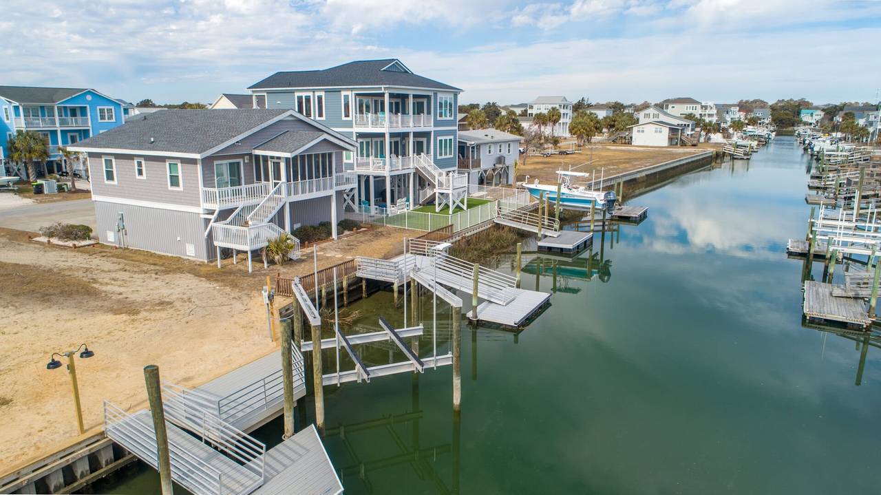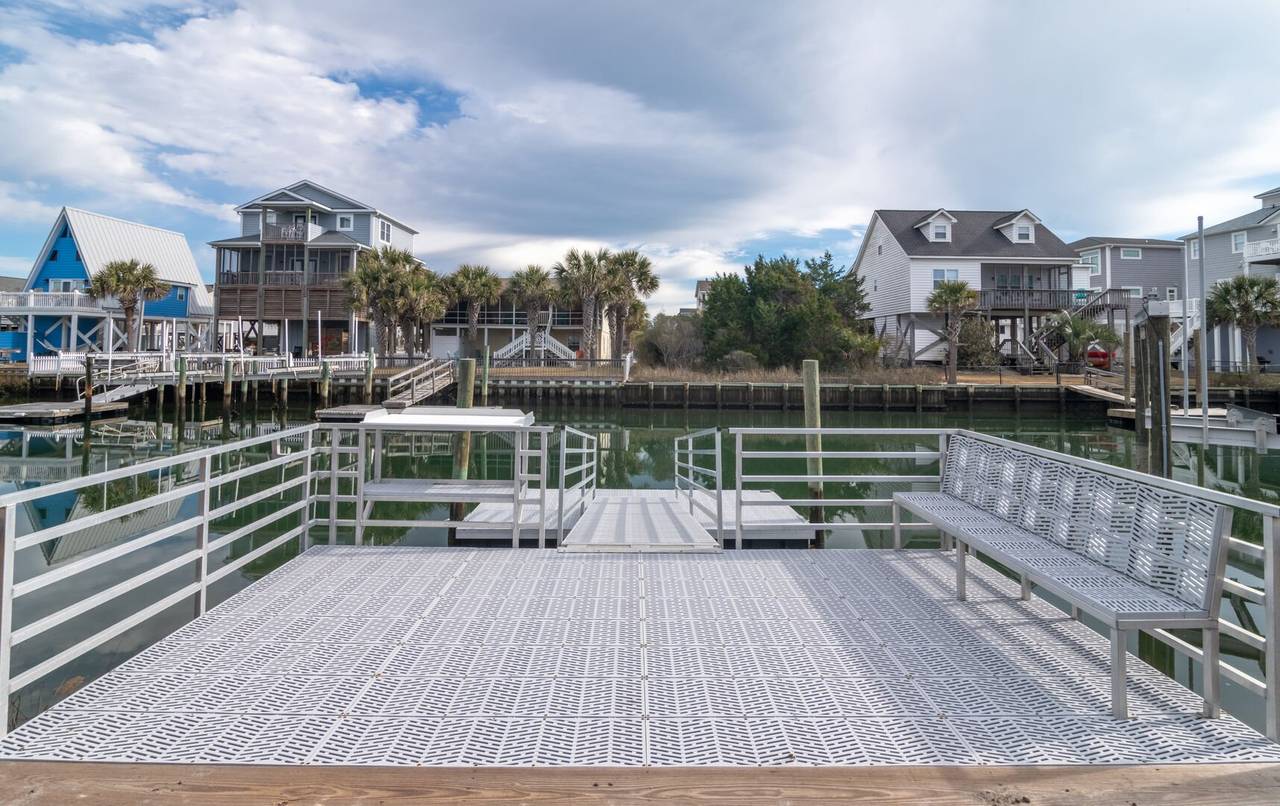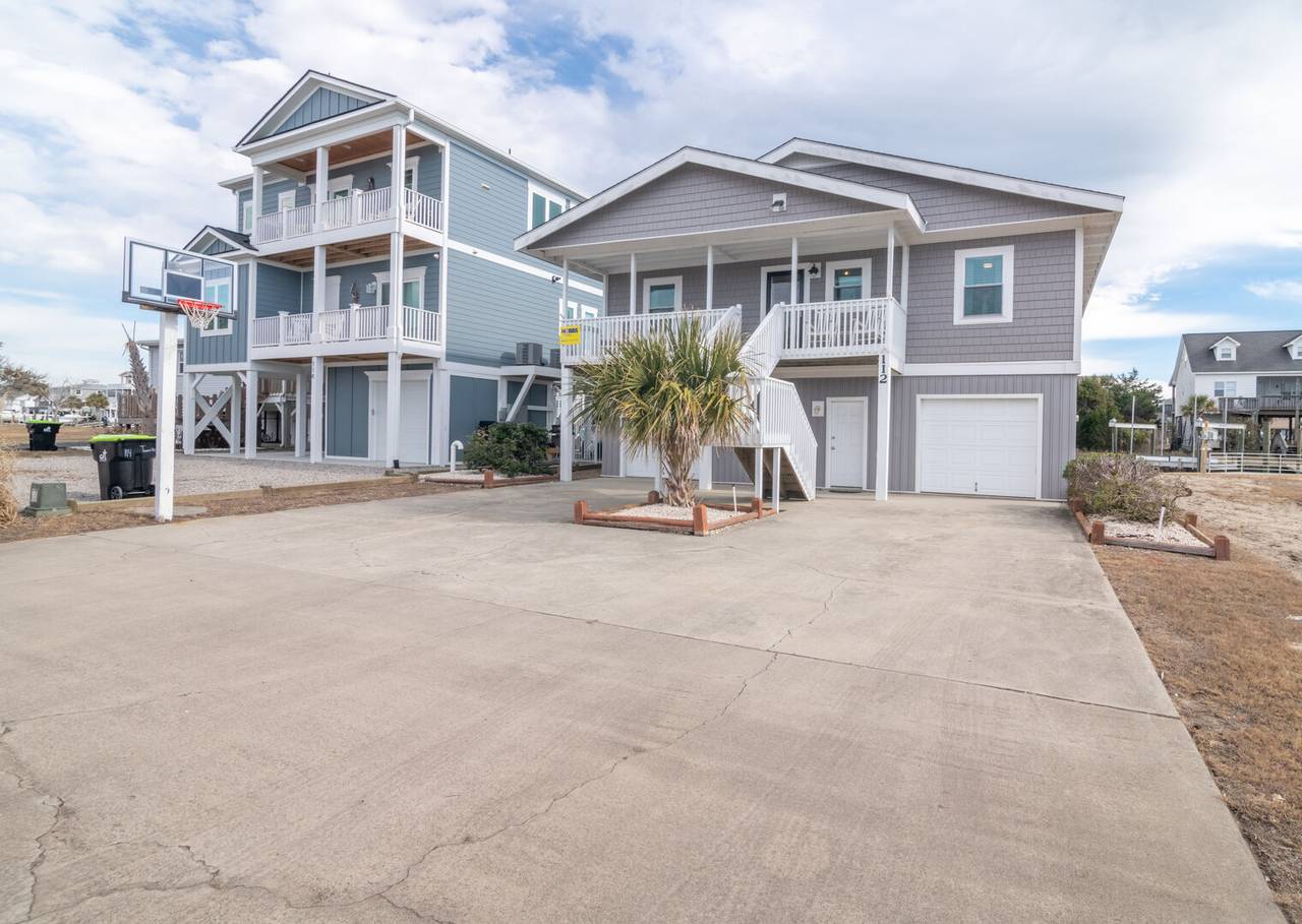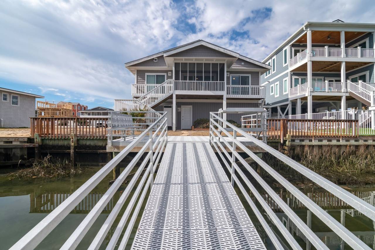 This 4 bedroom/2 bathroom dream boasts a kitchen with stainless steel appliances, a double oven, and a Keurig! The open-concept floor plan is light and airy and allows for maximum quality time! Enjoy meals at the countertop bar or large dining table. Sit and relax on the screened canal porch and watch the tide roll in. Just a quick walk to the beach with two convenient beach accesses to both the left and right of the street entrance, both beach accesses are about 100 yards away. Have a blast with water sports from the aluminum floating dock and ramp. The floating dock measures 8x16 feet for all of the boat lovers in the group. Kayaks, jet skis, paddleboards, and more! Or enjoy some fresh seafood by casting your fishing pole or dropping a crab trap from the convenience of your backyard. Enjoy a game of basketball with the hoop in the front yard/driveway. The laundry area is located in the ground-level storage room inside the garage, not connected to stairs inside the home.