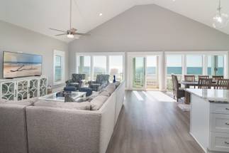 You can also dine on the top floor oceanfront deck while the sun sets over the sparkling Atlantic Ocean! Natural light is abundant in the upstairs common space and high-end appliances and finishes elevate the experience as you enjoy all the home has to offer. The gorgeous décor mimics the blues and greys of the ocean and sets the tone for a relaxing stay. There is even a separate media room where you can enjoy movies, games, and even a sleepover on the queen sleeper sofa. With sleeping for 16, you can enjoy the island life with all of your favorite people!